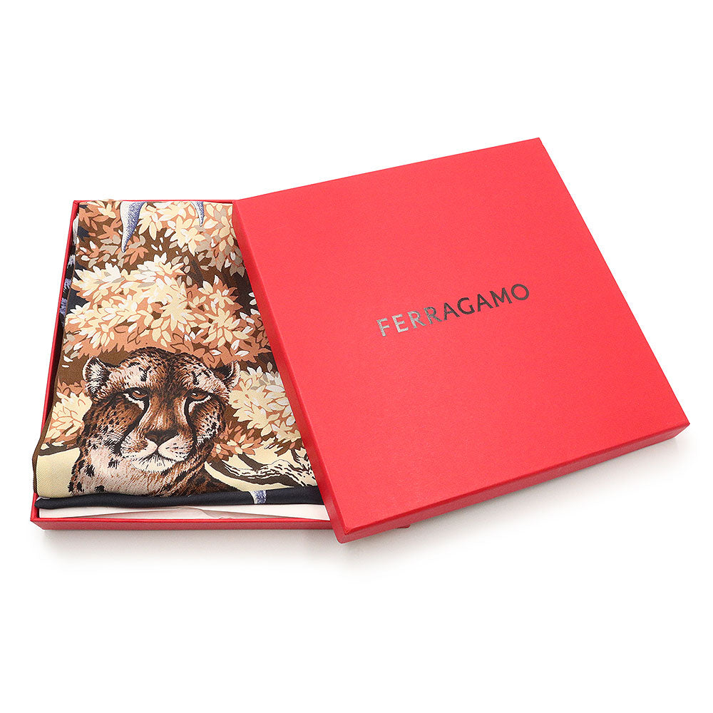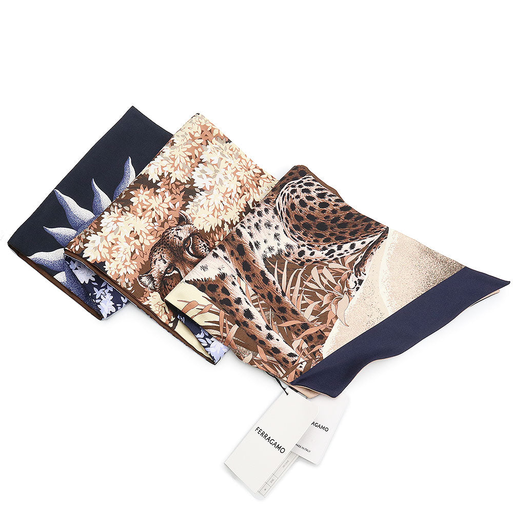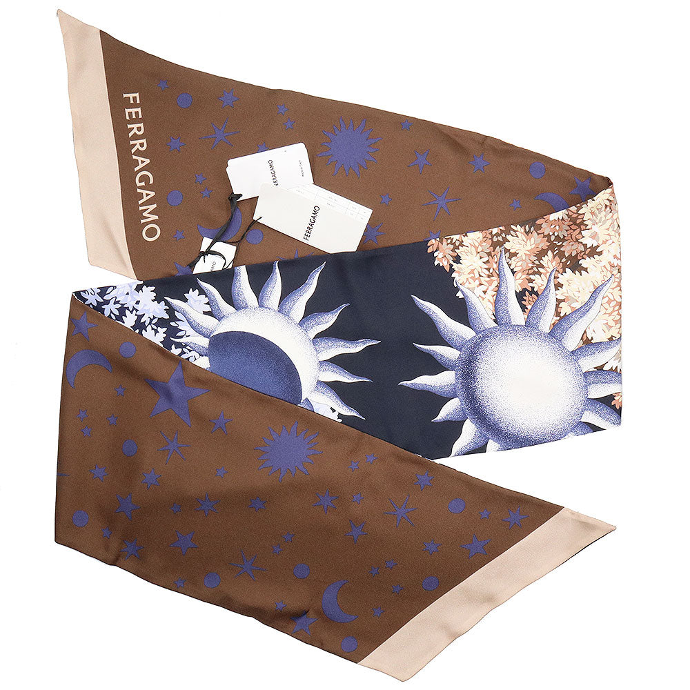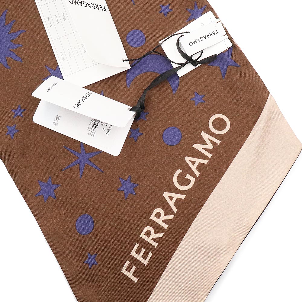 【新品・未使用品】サルヴァトーレフェラガモ Salvatore Ferragamo デイナイト バンドゥ リボン スカーフ シルク100% ブルー ブラック ブラウン 320913 箱付