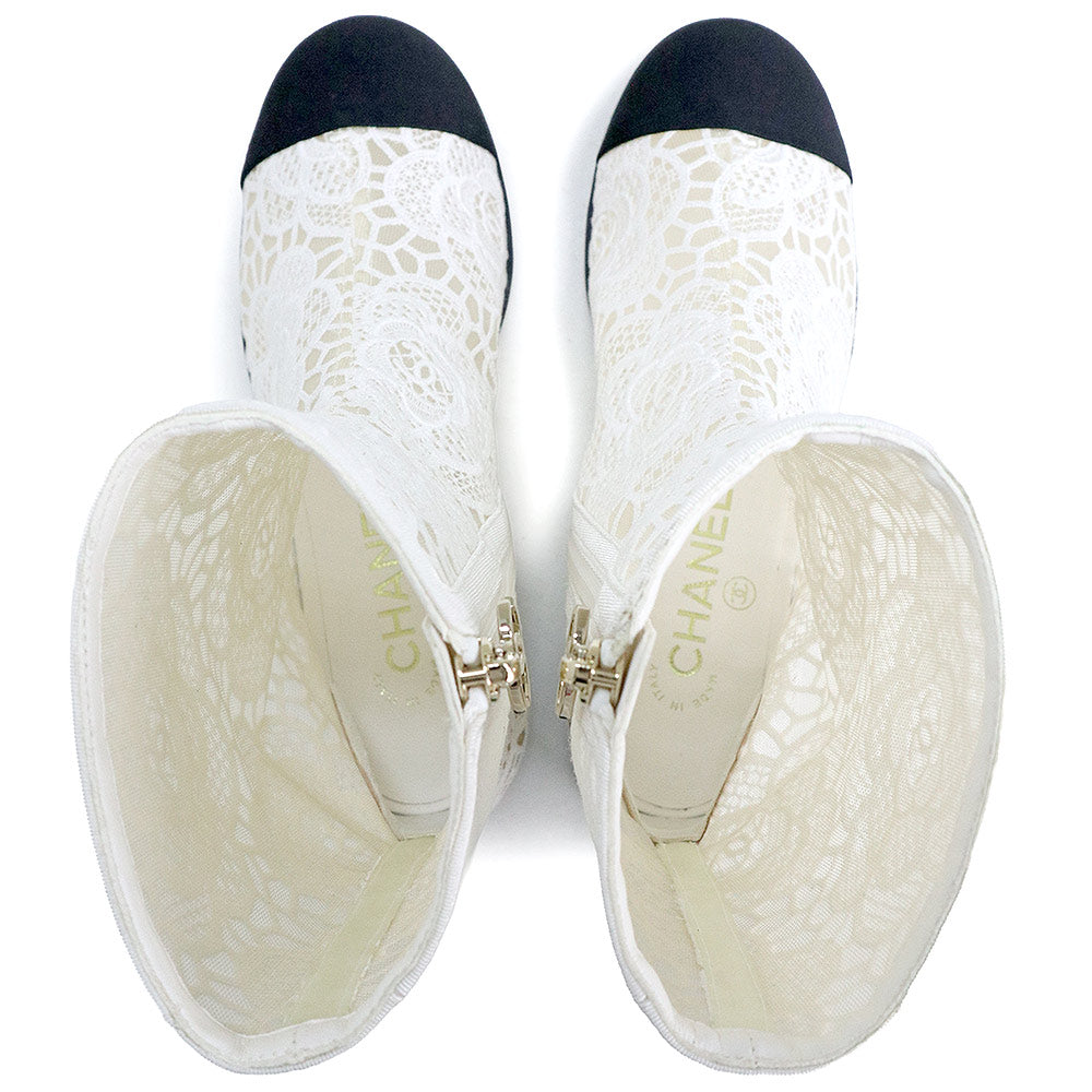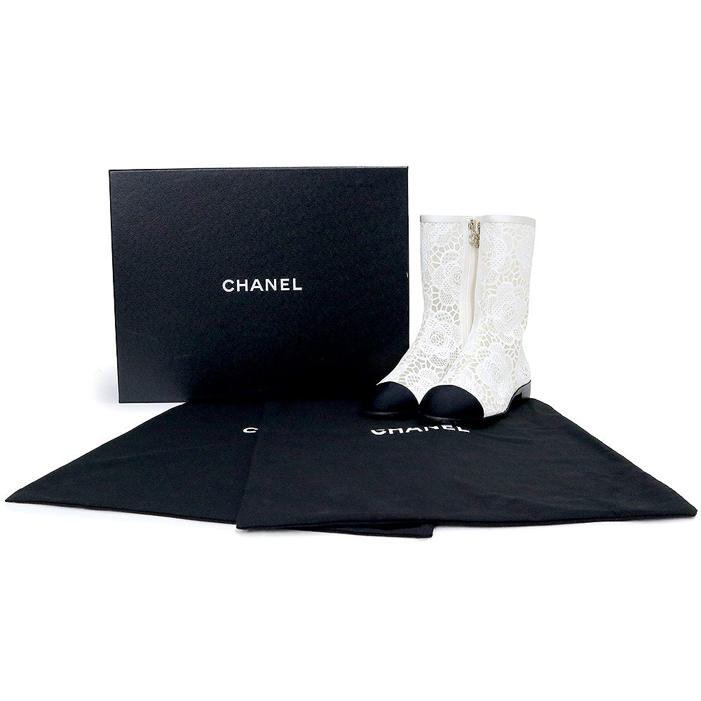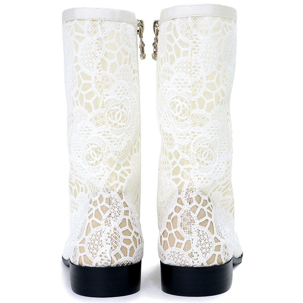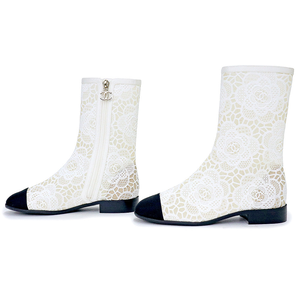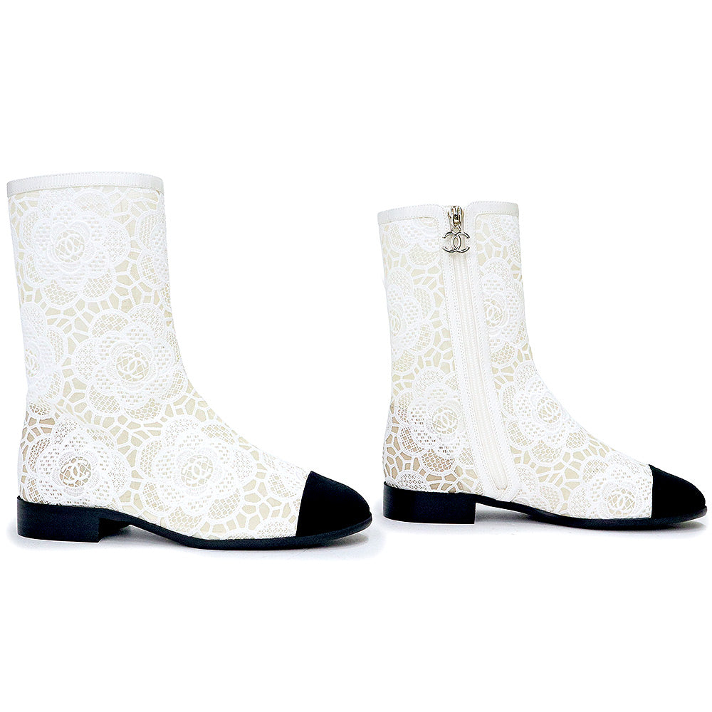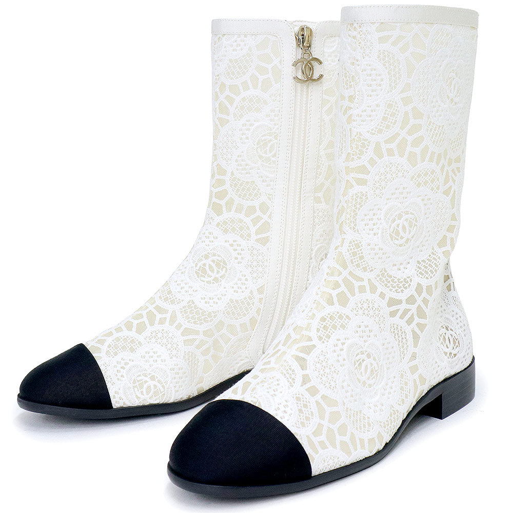 【未使用保管品】シャネル CHANEL エンブロイダリー カメリア ショートブーツ シューズ 靴 #35 22cm コットン 刺繍 グログラン ホワイト シャンパンゴールド金具 G45519