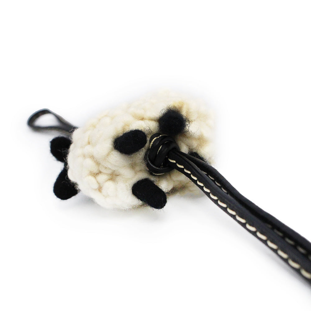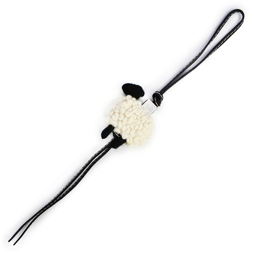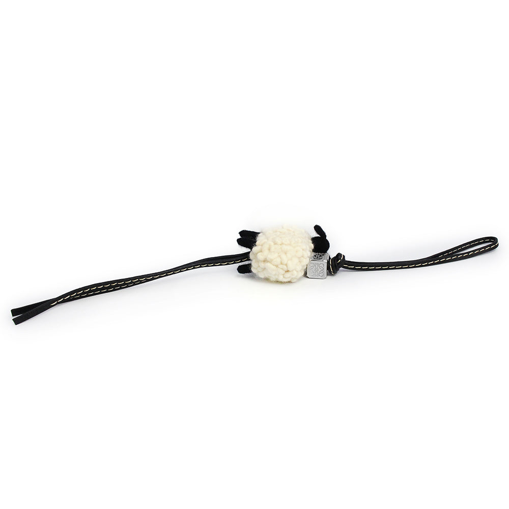 ロエベのフェルト製のシープチャーム。ひつじが可愛いバッグチャームです。ループ付きカーフスキン製のストラップにシルバーのアナグラムダイス付き。