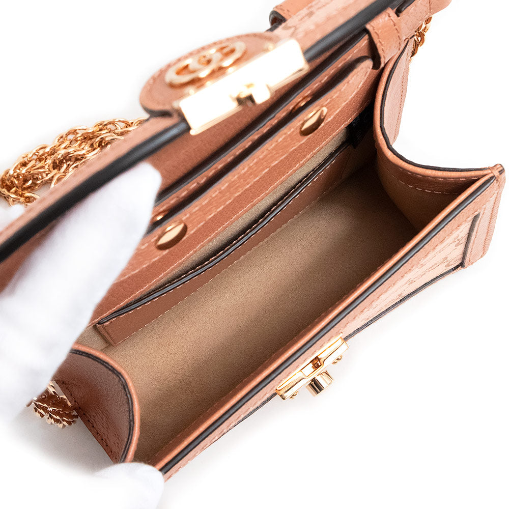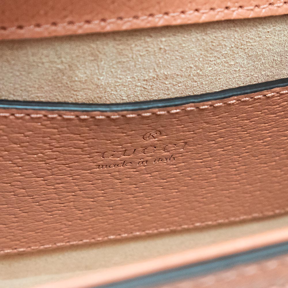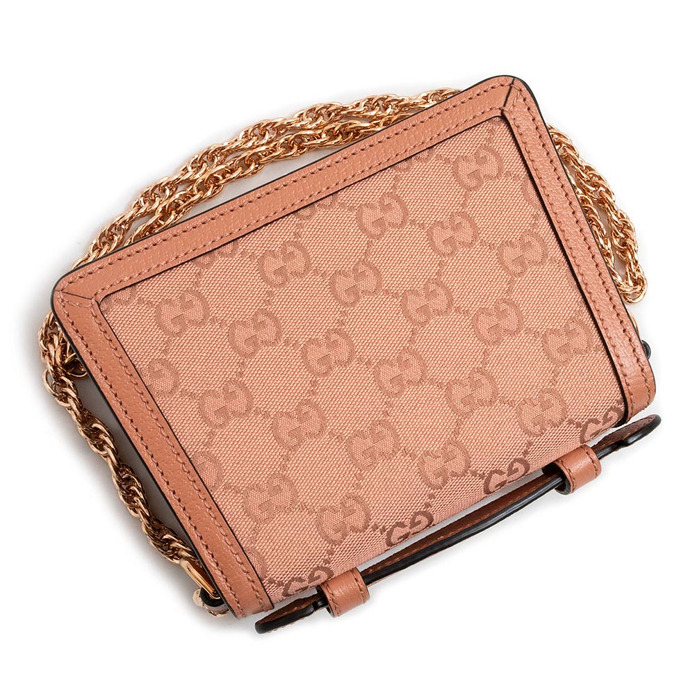 ピンクのGGキャンバスとローズゴールドのチェーンが映えるミニ ショルダーバッグ。ミニウォレットやリップなど身の回りの小物を入れるのに最適。デイタイムはもちろんイブニングシーンまで幅広く活躍してくれます。 |