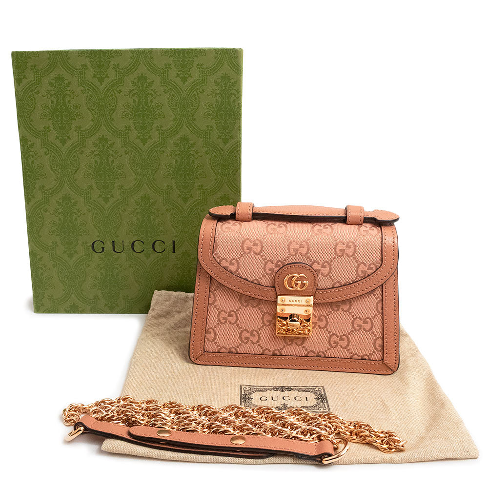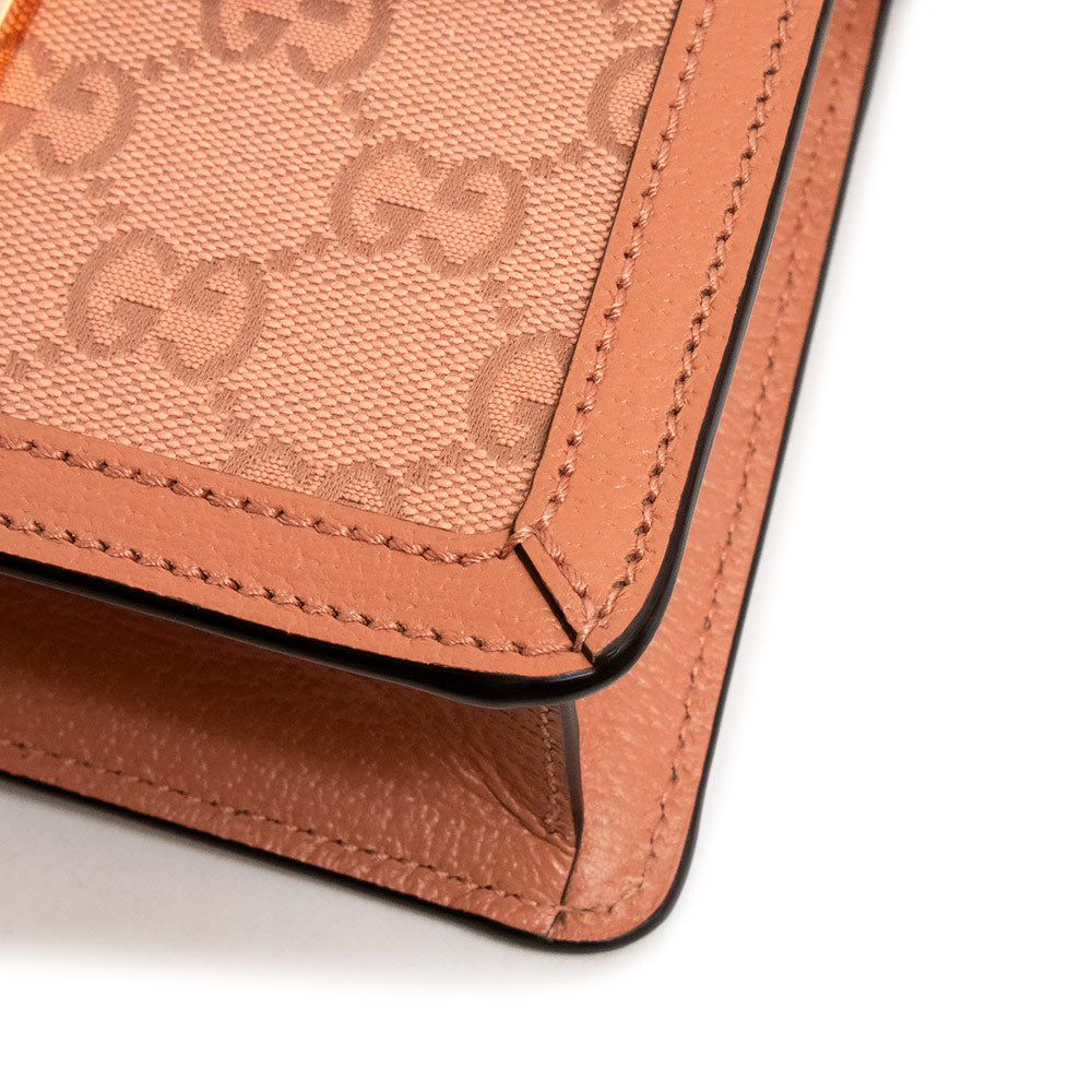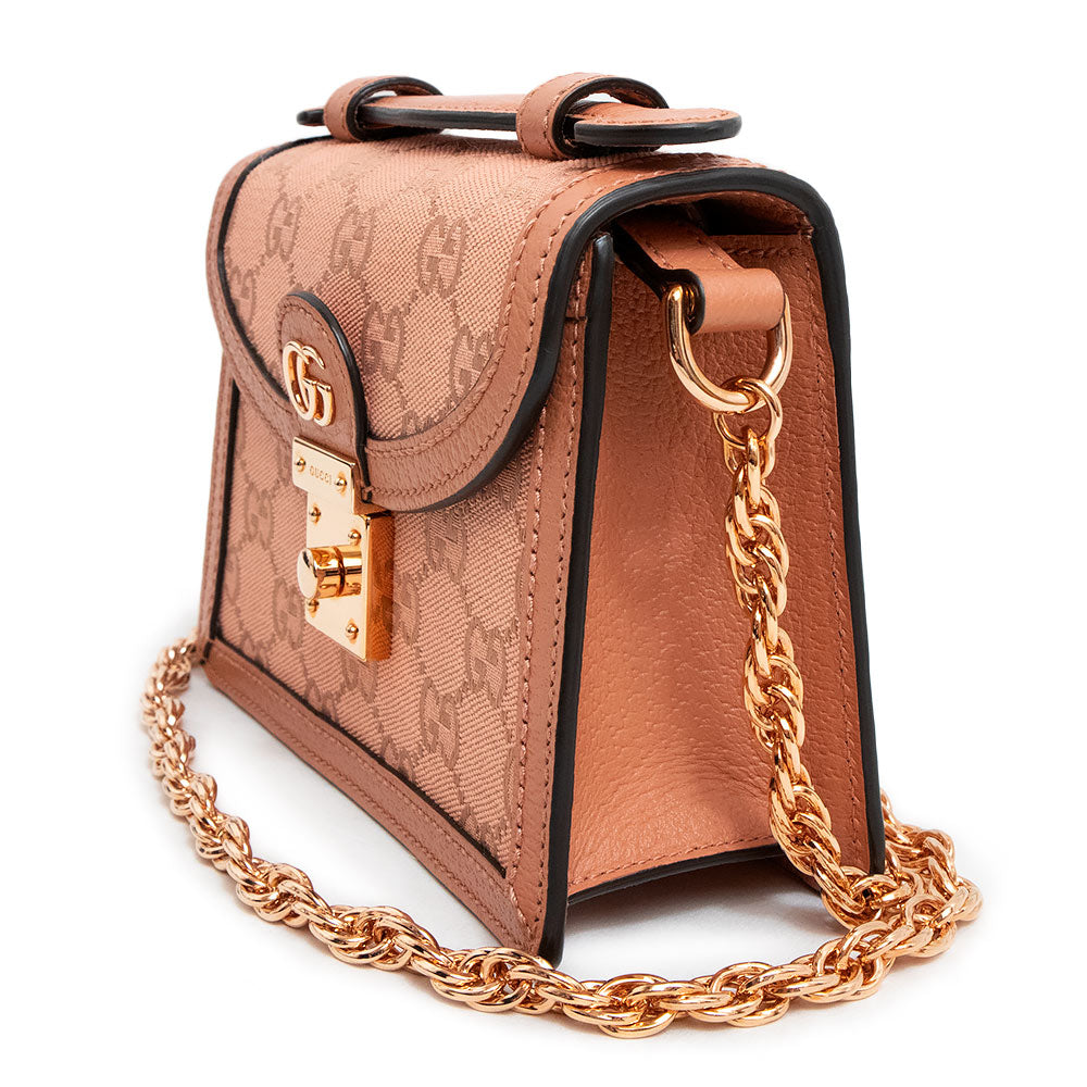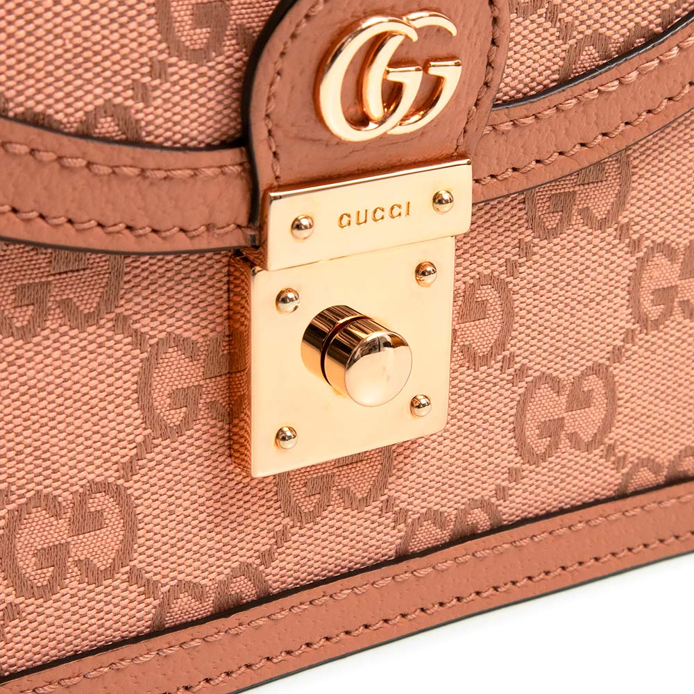 ピンクのGGキャンバスとローズゴールドのチェーンが映えるミニ ショルダーバッグ。ミニウォレットやリップなど身の回りの小物を入れるのに最適。デイタイムはもちろんイブニングシーンまで幅広く活躍してくれます。 |