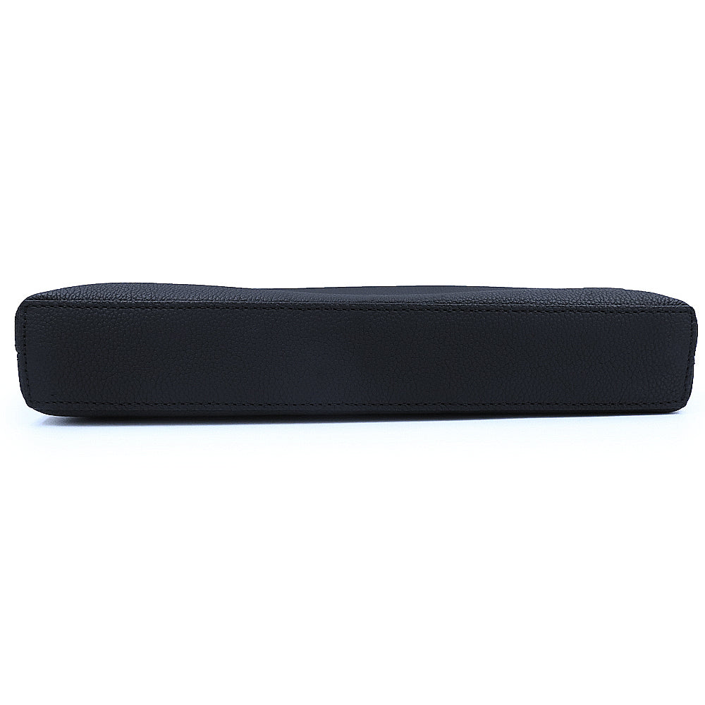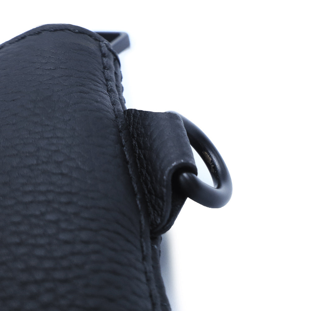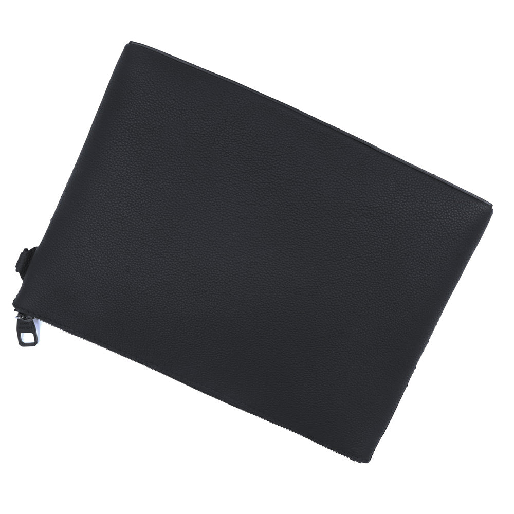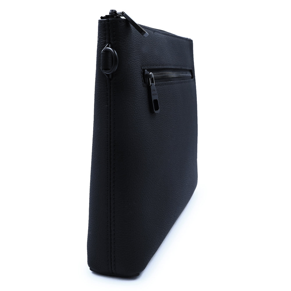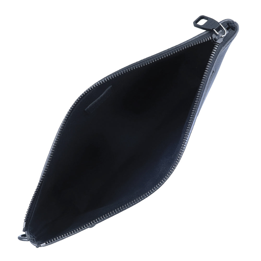 ワックスをかけたような風合いのレザーに、マットブラックの金具と同系色のテキスタイル裏地を合わせたポーチ。フロントのコーナーには上品なエンボス加工のロゴモチーフを施し、さりげないアクセントに。取り外し可能なリストストラップ付きで、手持ちやクラッチスタイルなど幅広い使い方が楽しめます。