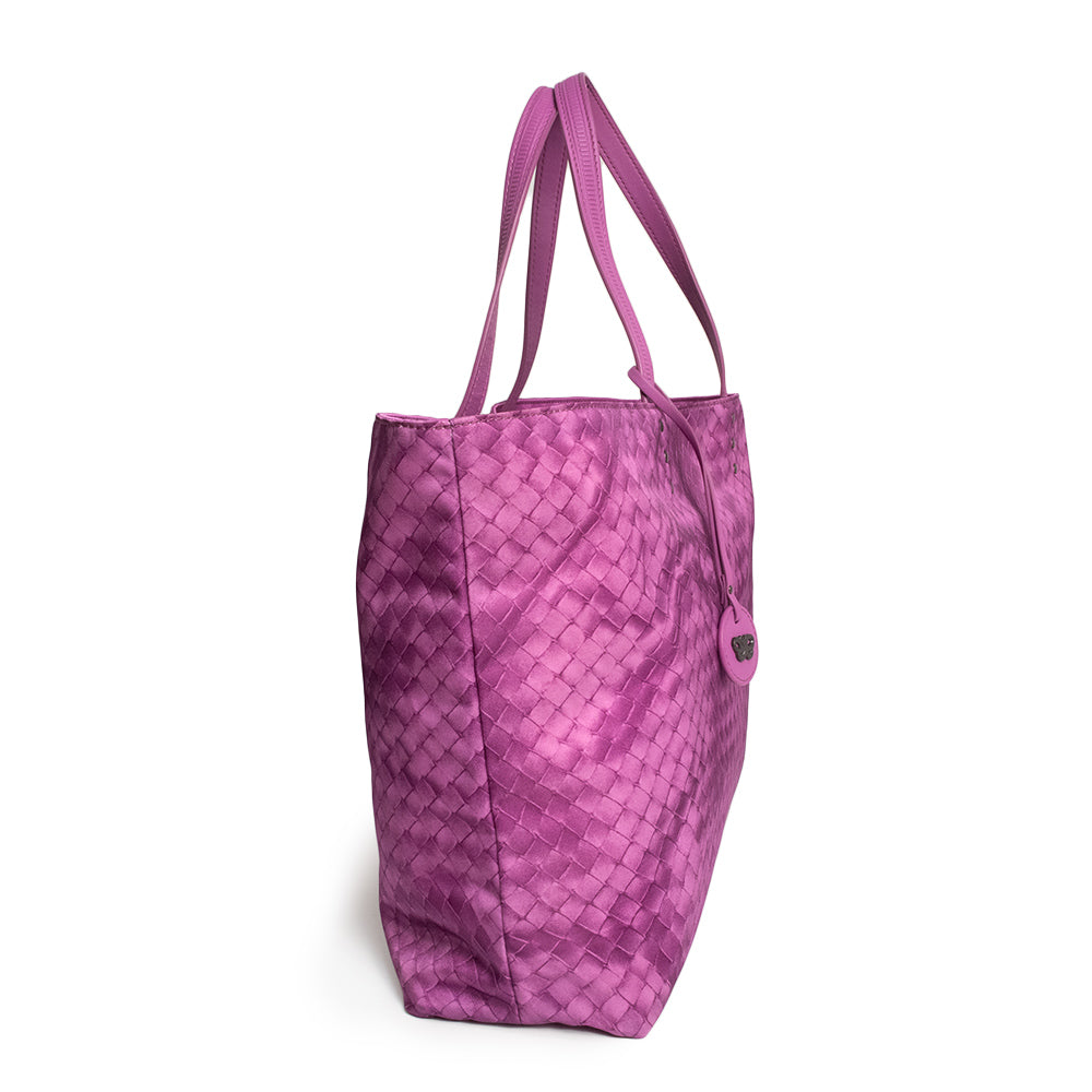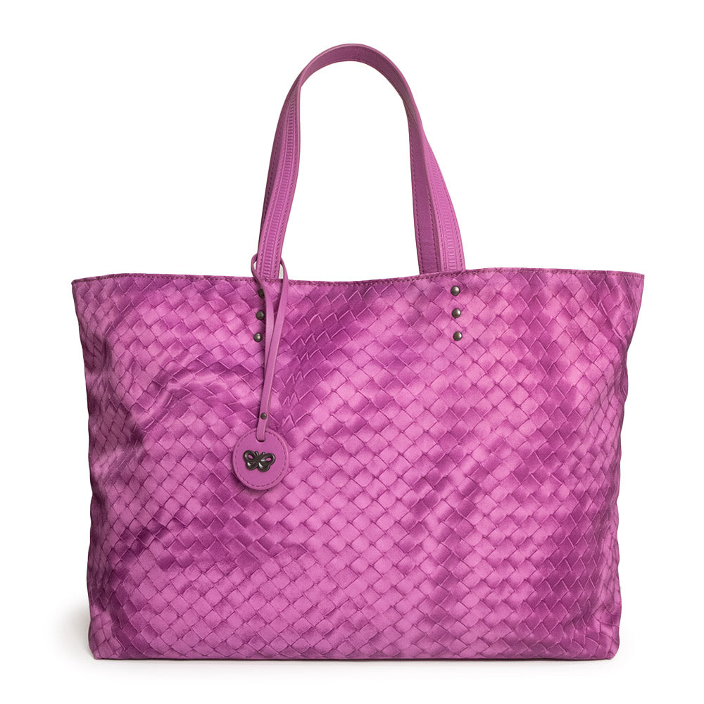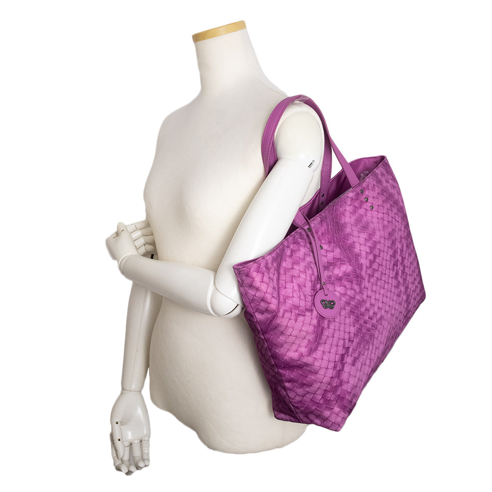 ボッテガ・ヴェネタのイントレチャート柄がプリントされた、ナイロン素材の軽量なトートバッグ。ボッテガ・ヴェネタを象徴するバタフライのペンダントモチーフがついており、ワンポイントとしてとてもオシャレなデザインとなっています。スリムなレザーハンドルで、開口部が広く使いやすいバッグです。 |