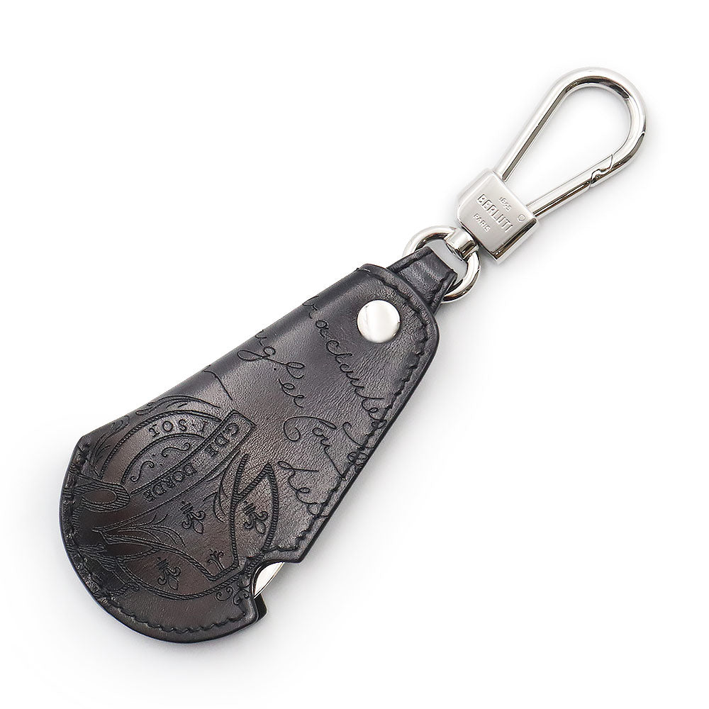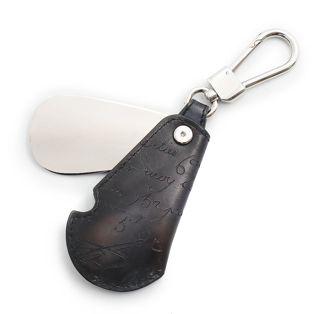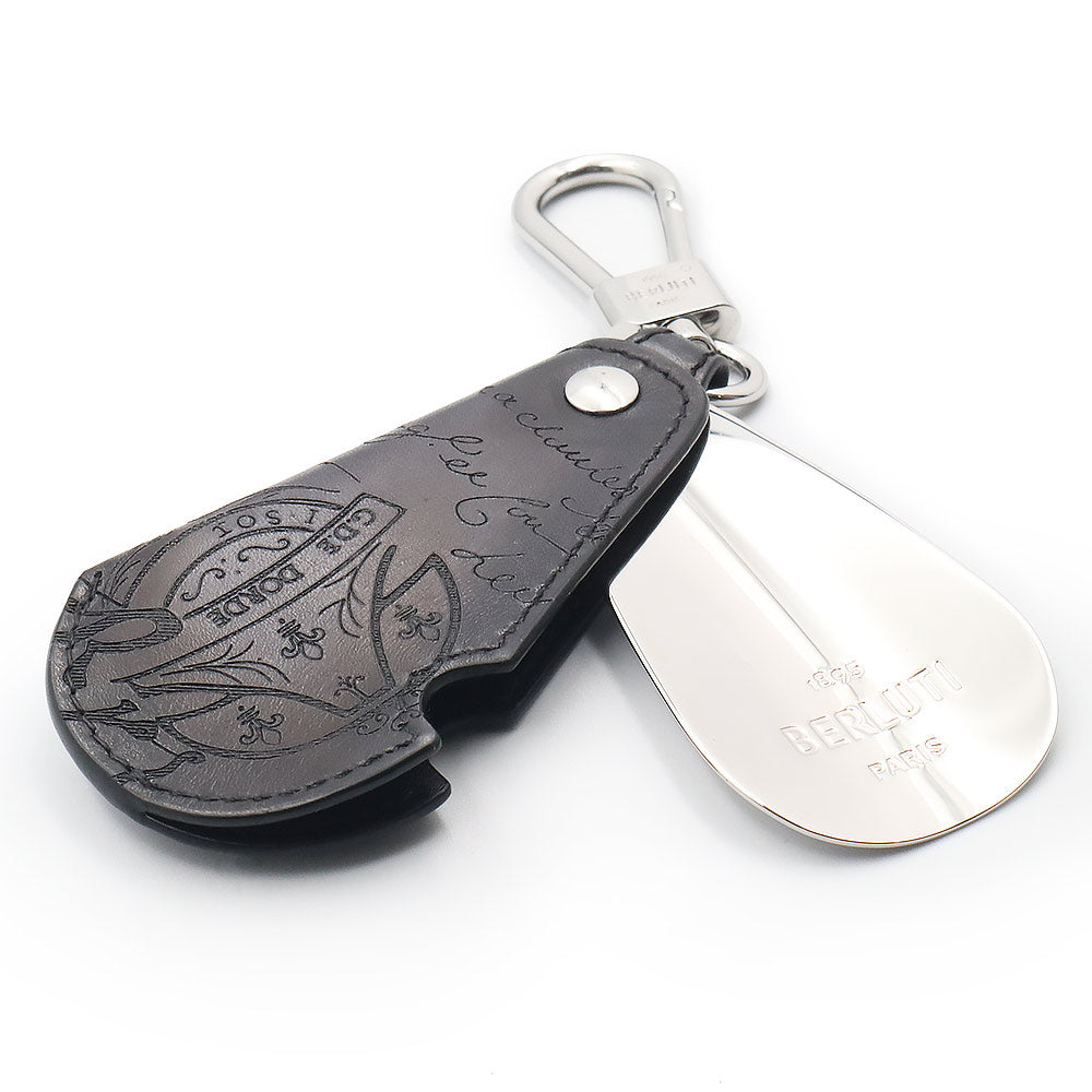 【美品】ベルルッティ Berluti カリグラフィ シューホーン スクリット ローテイティブ キーリング キーホルダー バッグチャーム 靴べら ヴェネチアカーフレザー ネログリージョ ブラック グレー シルバー金具 KR079-V2