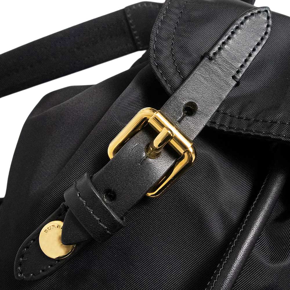 ナイロン素材にレザーパーツが高級感をプラス。クラシカルなゴールドメタルロゴが印象的です。使い勝手のよい外ポケットを備えた軽量でデザイン性と機能性に優れたバーバリーのリュックサックです。