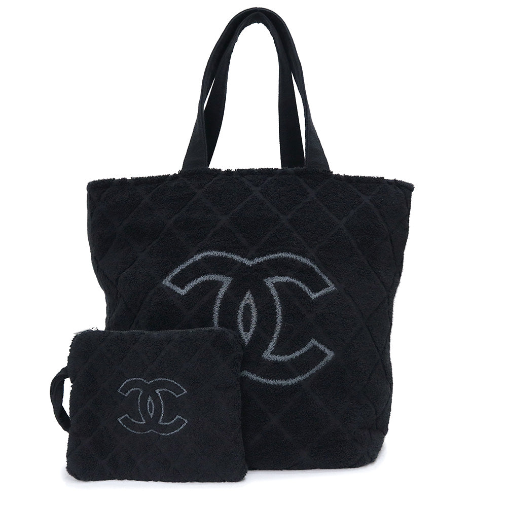 【中古】シャネル CHANEL ココマーク ビーチ トートバッグ コットン100% ブラック シルバー金具 タオル ポーチ付