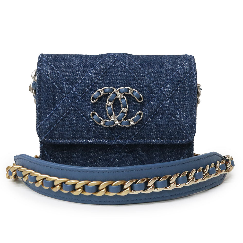 【未使用 展示品】シャネル CHANEL 19 ナインティーン スモール フラップ チェーン ウォレット マトラッセ ココマーク コインケース 小銭入れ 財布 ショルダーバッグ 斜め掛け デニム ブルー ゴールド シルバー金具 AP1787 箱付