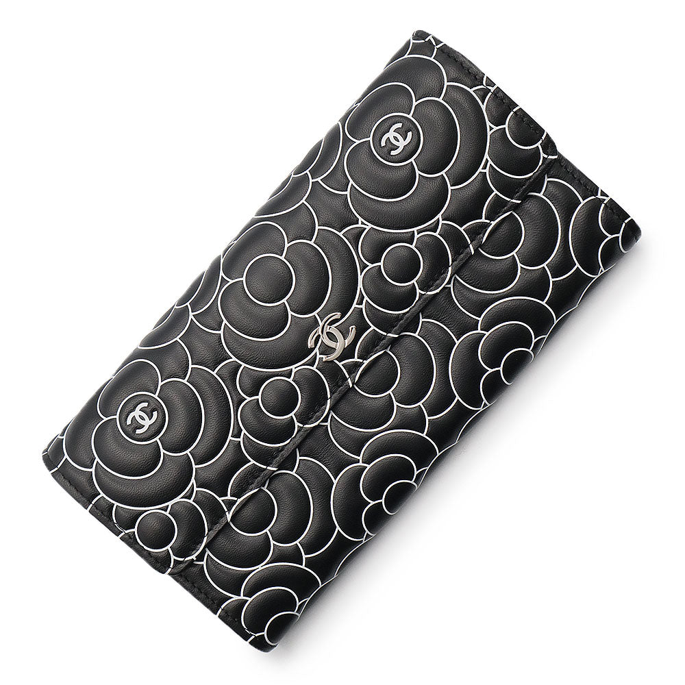 【新品・未使用品】シャネル CHANEL カメリアエンボス フラップ ウォレット 二つ折り長財布 ラムスキン レザー ブラック ホワイト シルバー金具 A82283 箱付