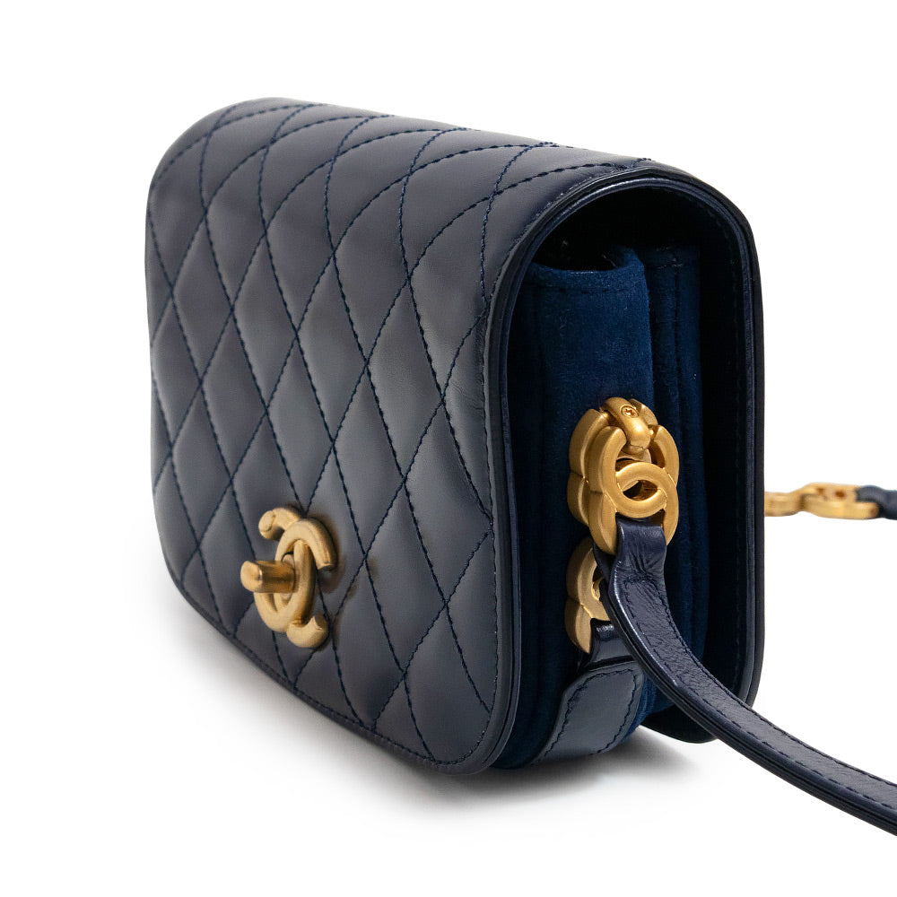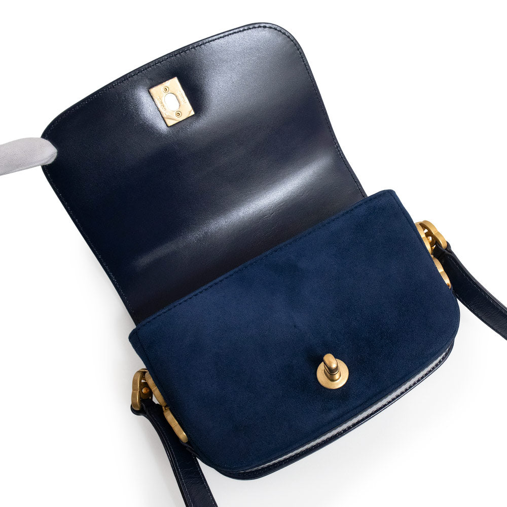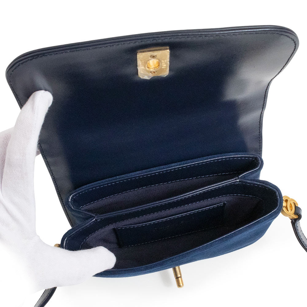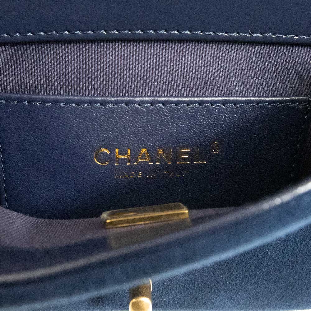 ストラップのCCマークがトレンド感のある、シャネルのショルダーバッグ。コンパクトながらマチがしっかりとあり、普段使いやお出かけにも使いやすいサイズです。落ち着いたネイビーは、年齢を問わず末長くお使いいただける人気のカラーです。スウェードとカーフスキンのコンビネーションが、上品さと高級感を演出します。