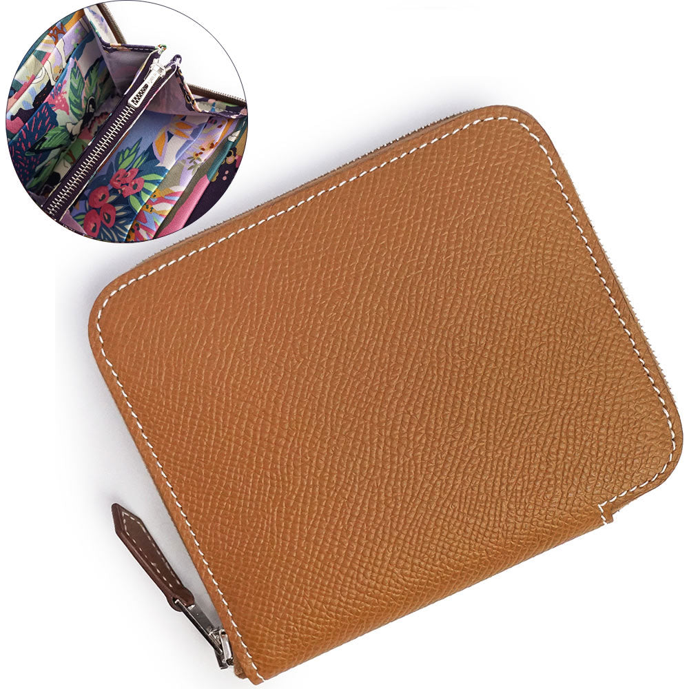 エルメスのジップコインケース、アザップコンパクト シルクイン。内生地にラグジュアリー感溢れるシルクスカーフが使われており、エルメスならではの高級感を感じさせます。キュートなルックスと上質な素材どちらも兼ね備えた贅沢なアイテム。ファスナーを開けるとマチが広がり、中身が出し入れしやすいのも嬉しいポイント。プレゼントにもお勧めです。