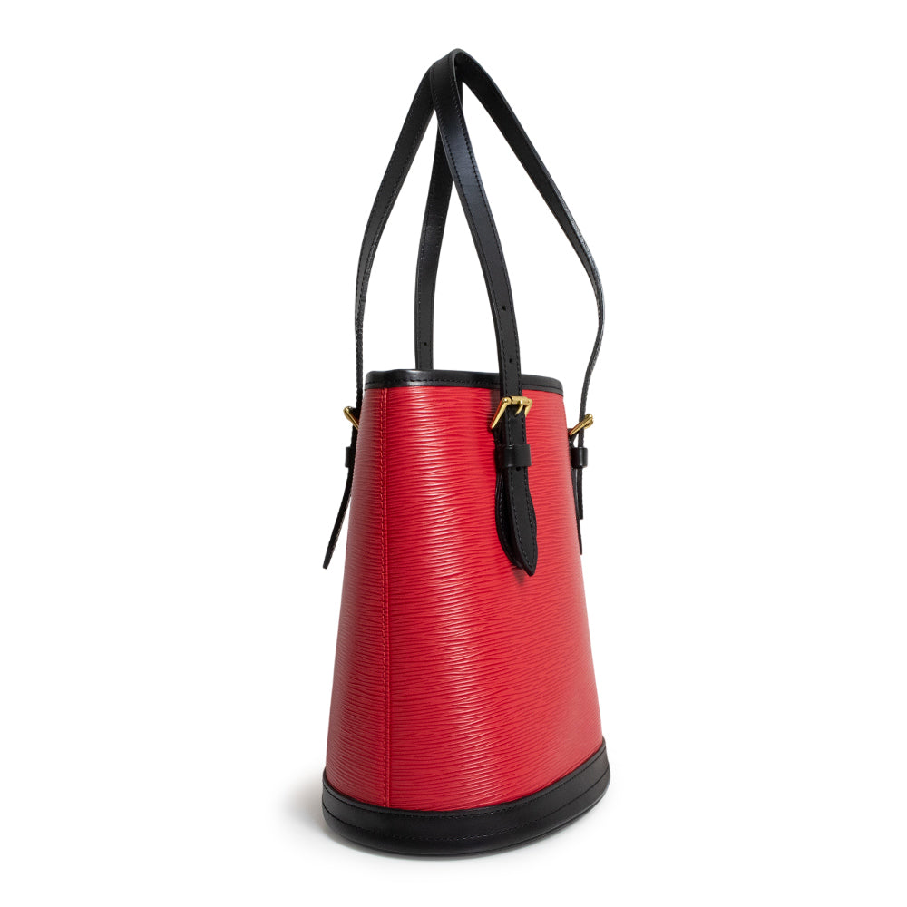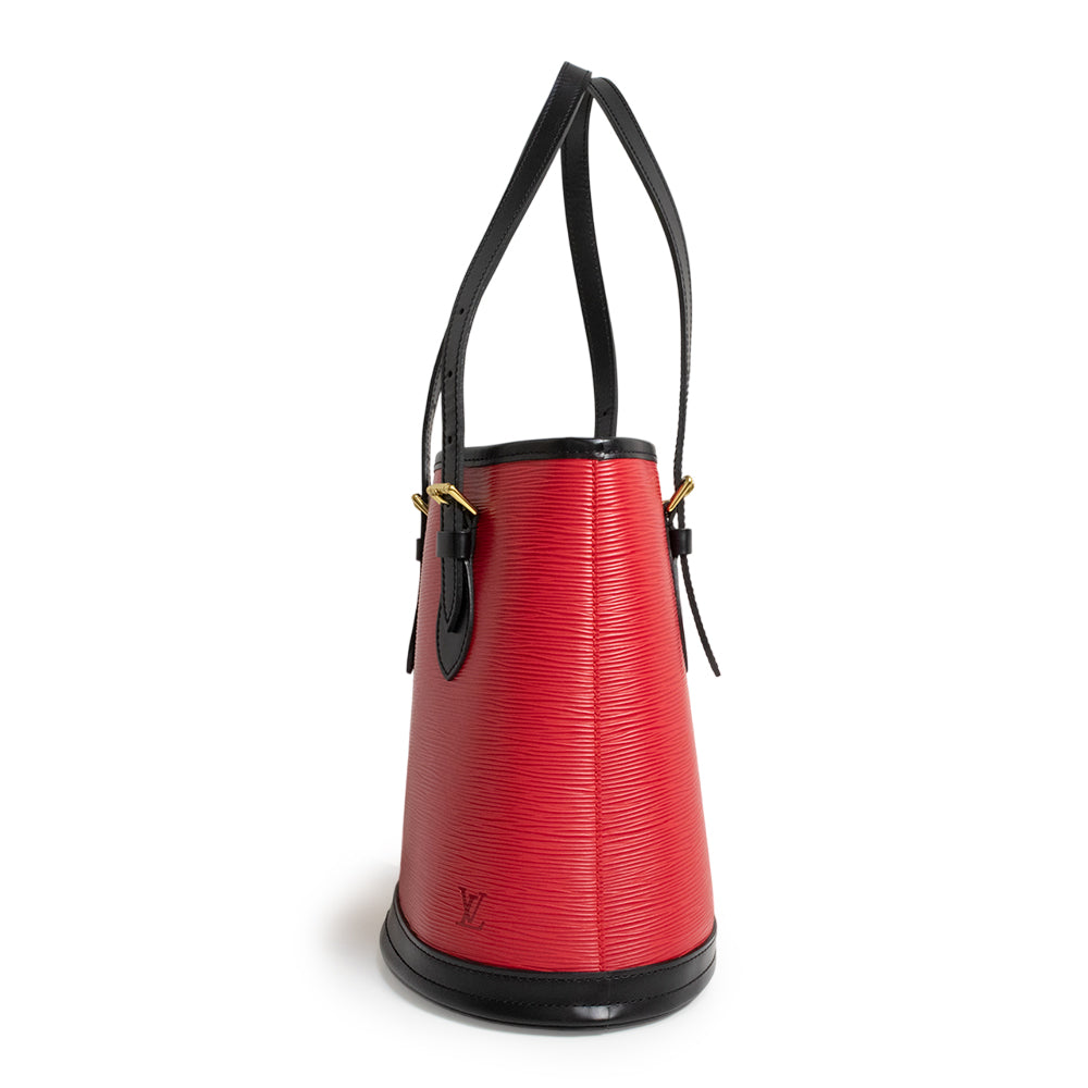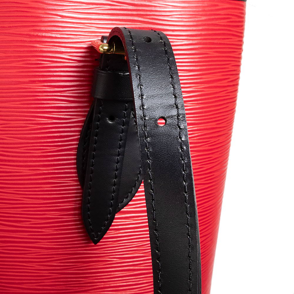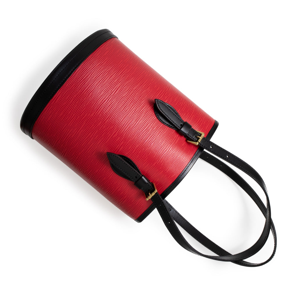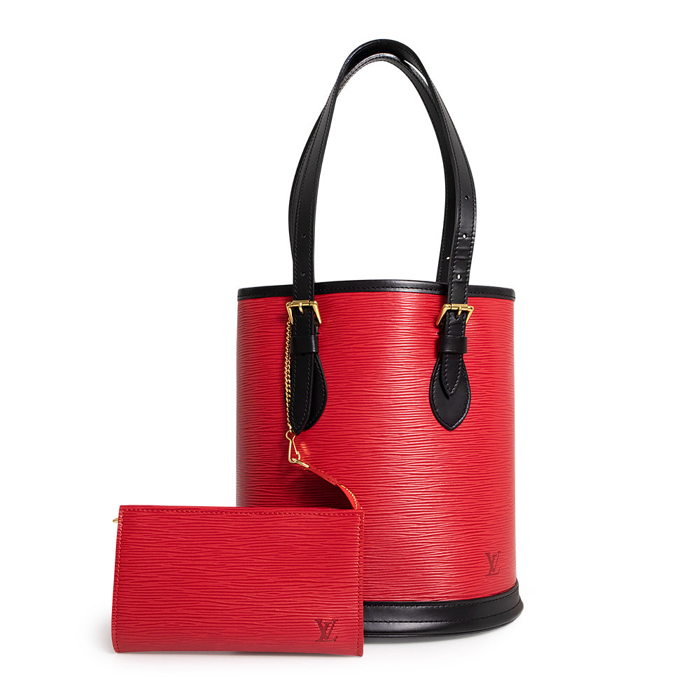 ルイ・ヴィトン エピ プチ・バケット ハンドバッグです。オープン式で物が出し入れしやすく、小さいポーチも付属しておりますので実用性もばっちりです。スペシャルオーダーの美しいレッドとブラックのバイカラーが目を惹く、上品でエレガントなアイテムです。 |