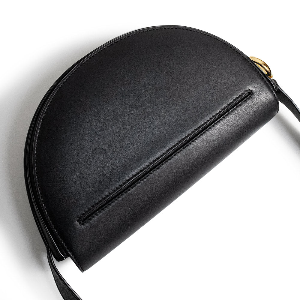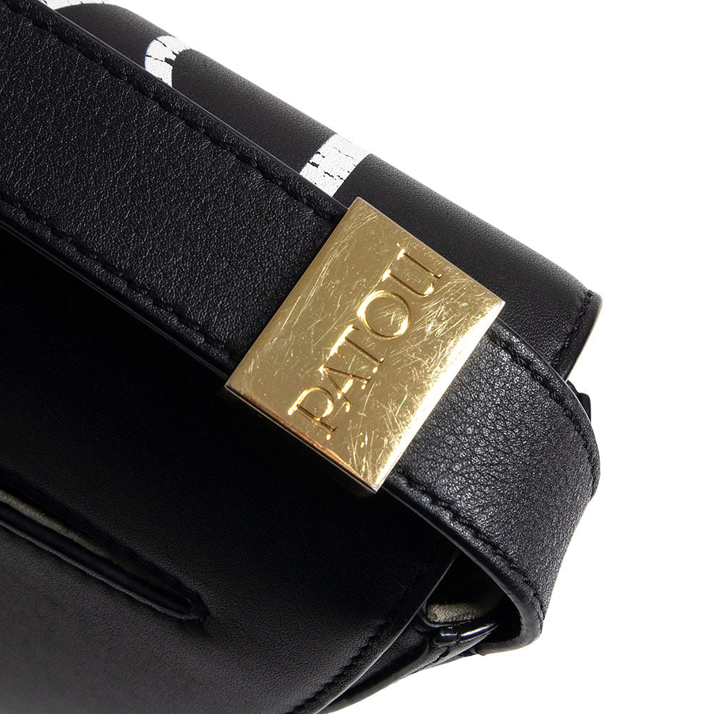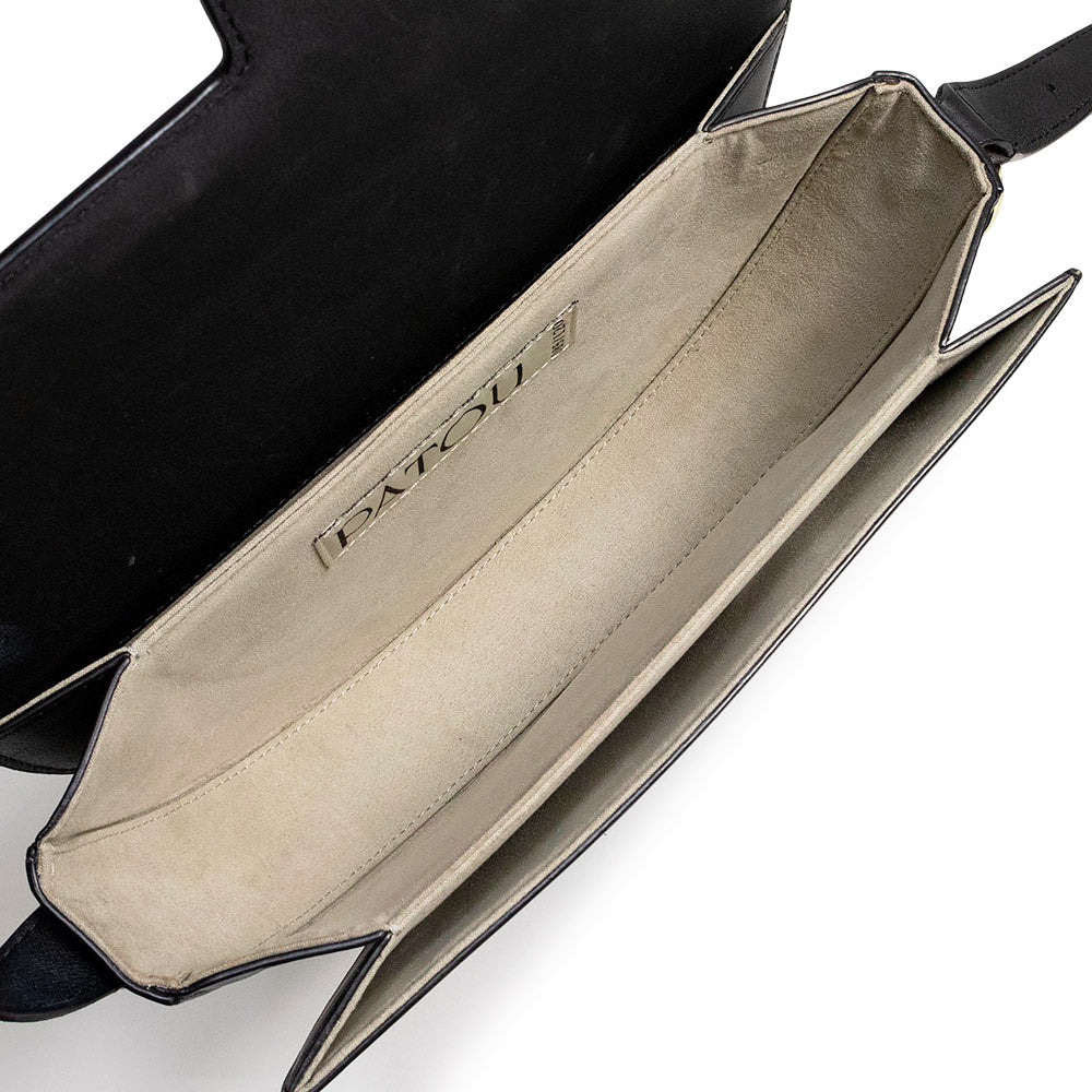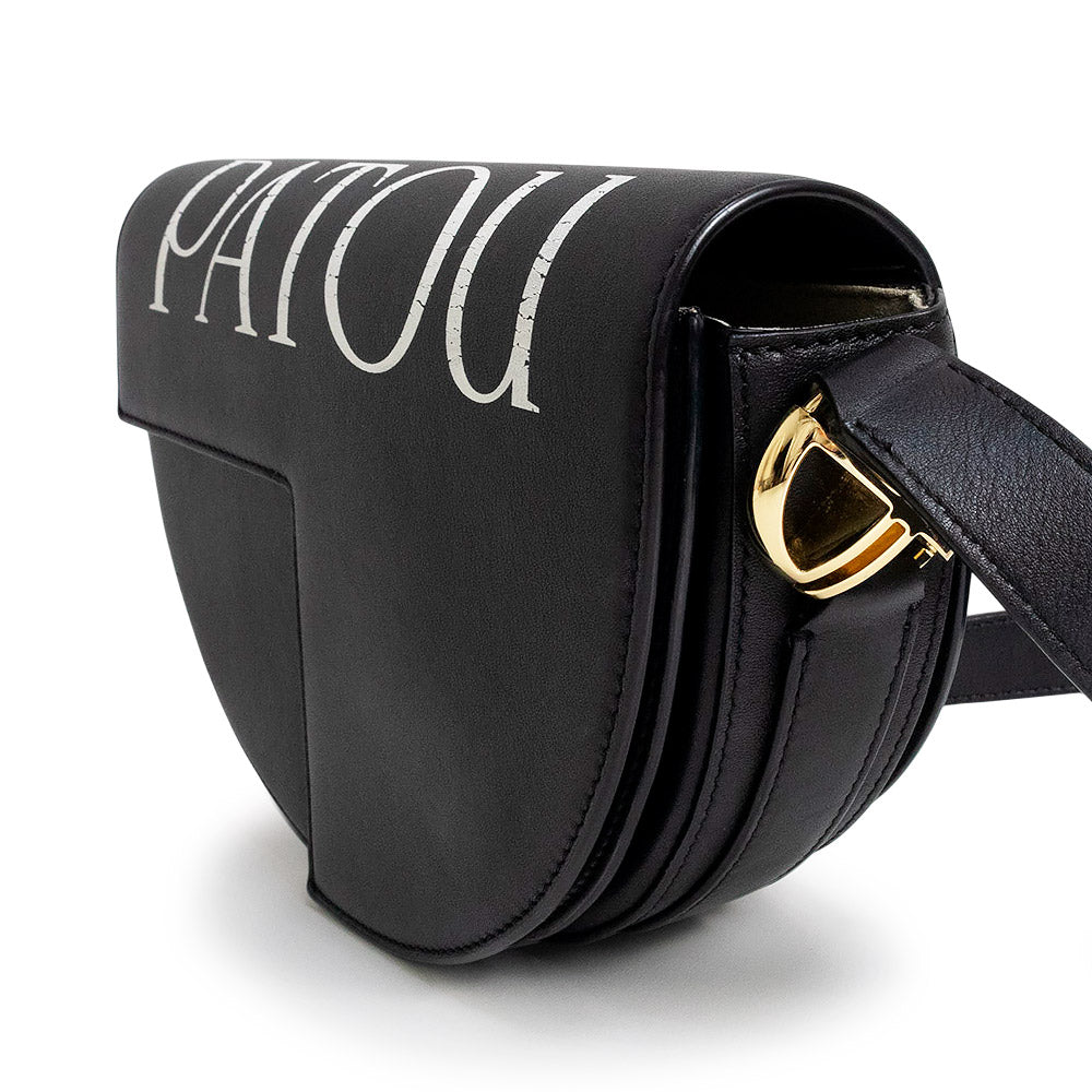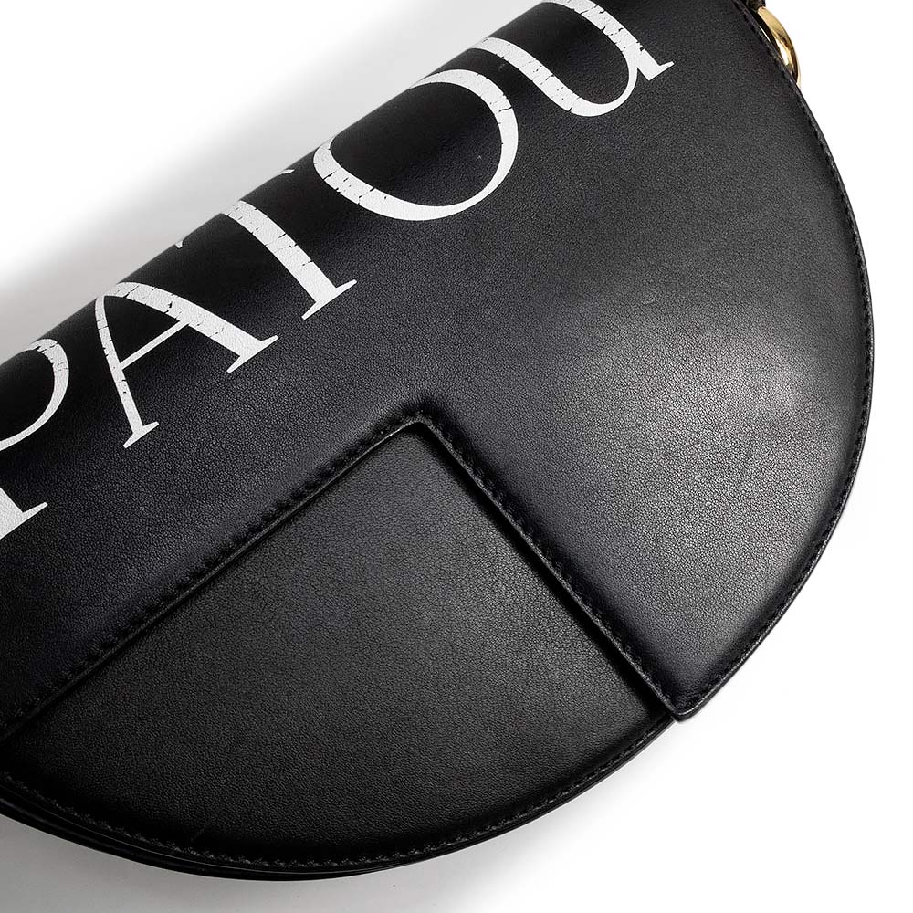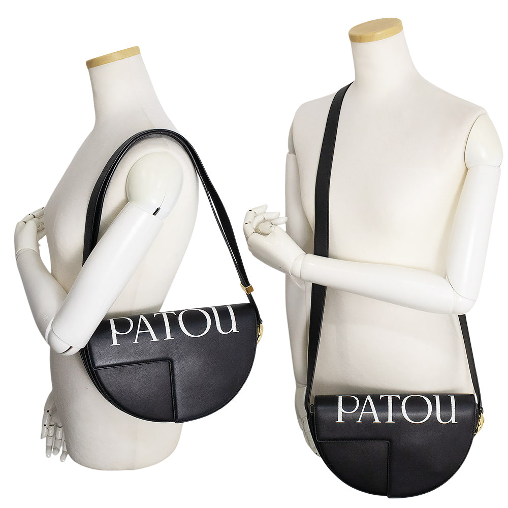 「Patou」のブラックのスムースレザー製ショルダーバッグ。ホワイトのPatouロゴプリントが印象的。半円形のフォルムにあしらわれたサイドのゴールドトーンのメタルパーツとJPモノグラム ディテールが輝きます。調整可能なストラップで、ショルダーバッグ、クロスボディバッグ、ハンドバッグとしてお使いいただけます。 |