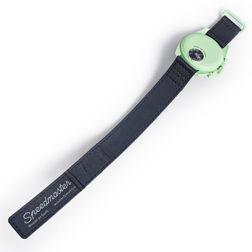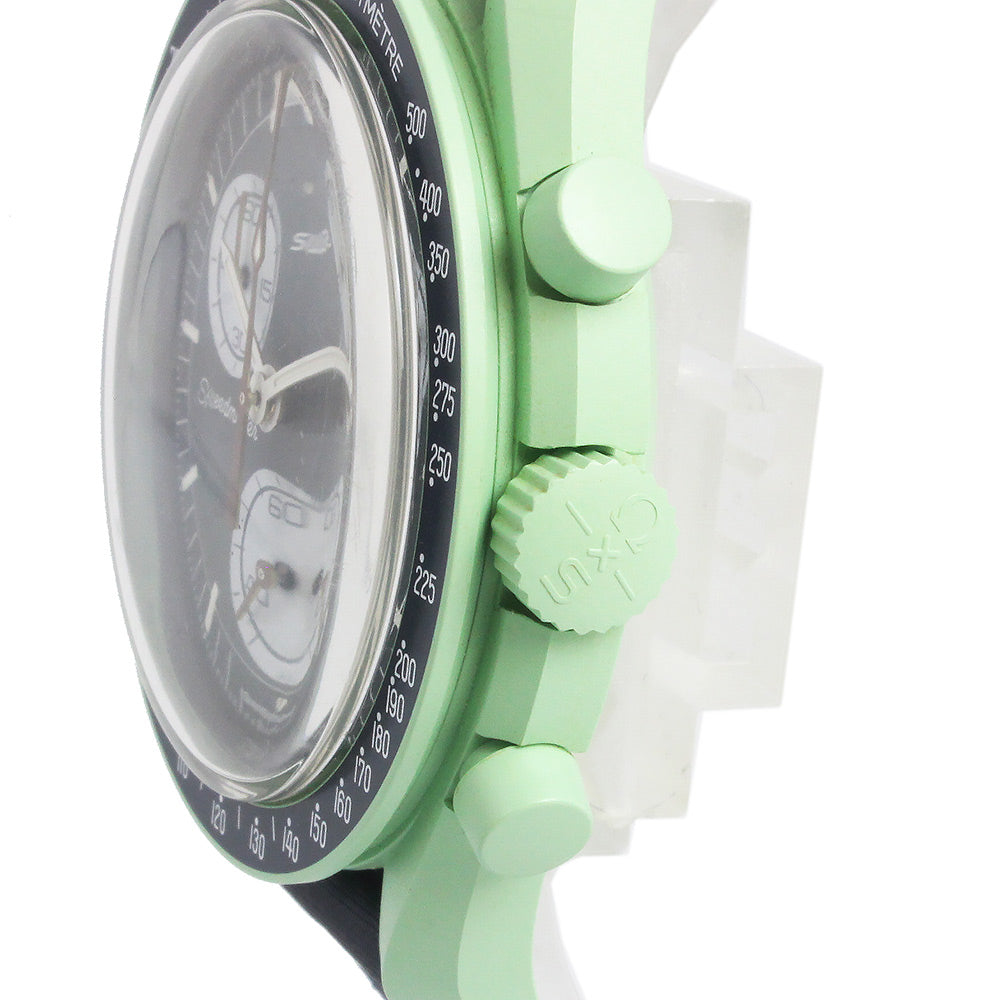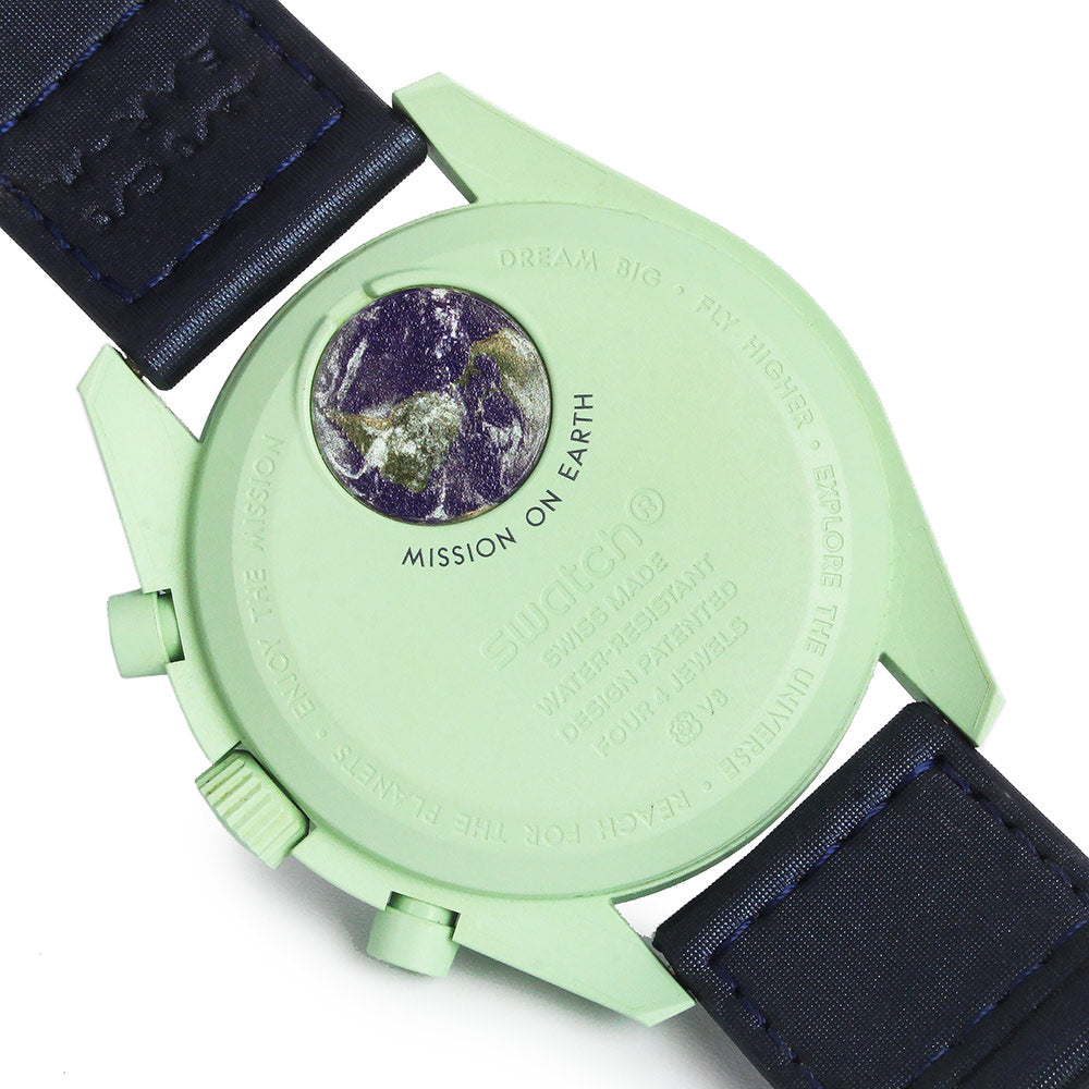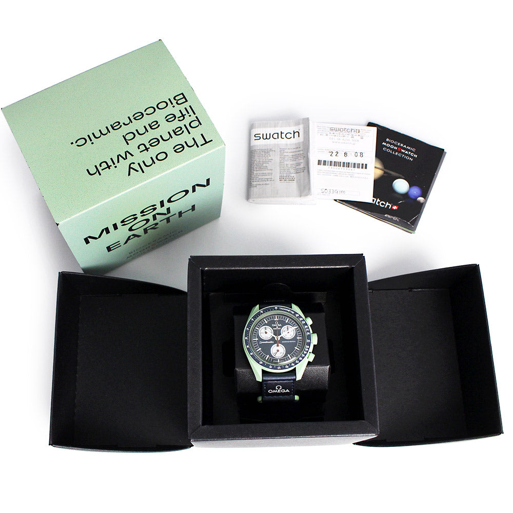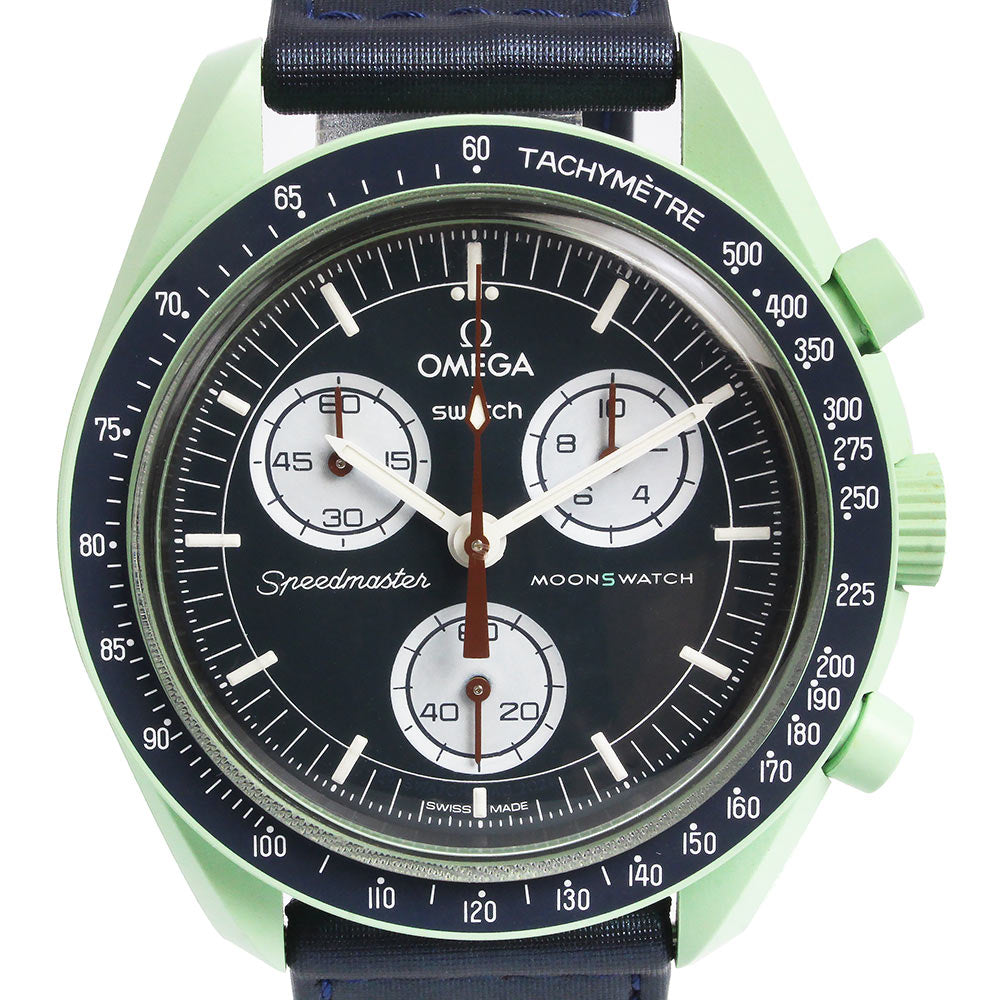 【美品】オメガ OMEGA スウォッチ Swatch ミッション オン アース MISSION TO EARTH スピードマスター ムーンスウォッチ クロノグラフ クォーツ 腕時計 ナイロン バイオセラミック グリーン ネイビー SO33G100 箱付