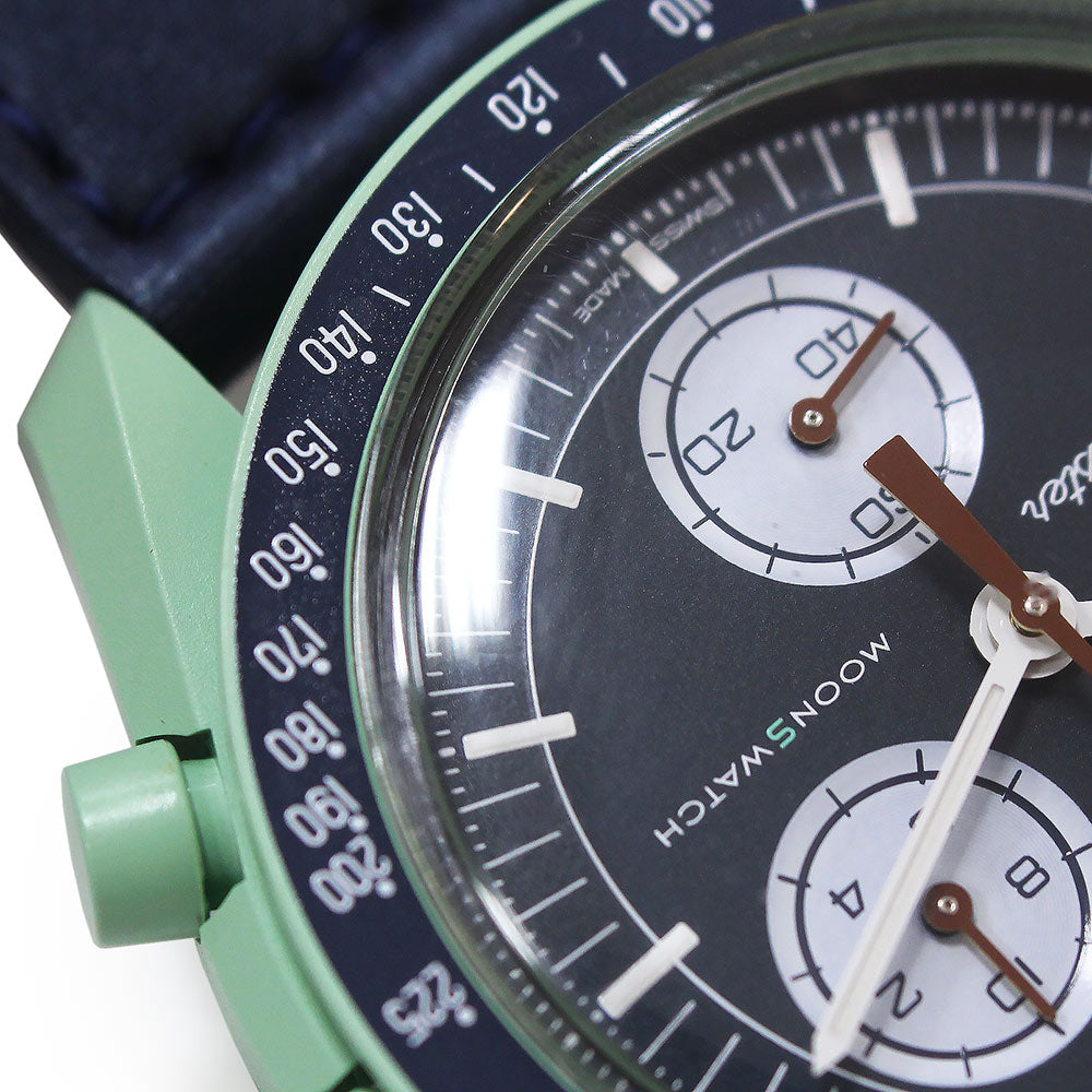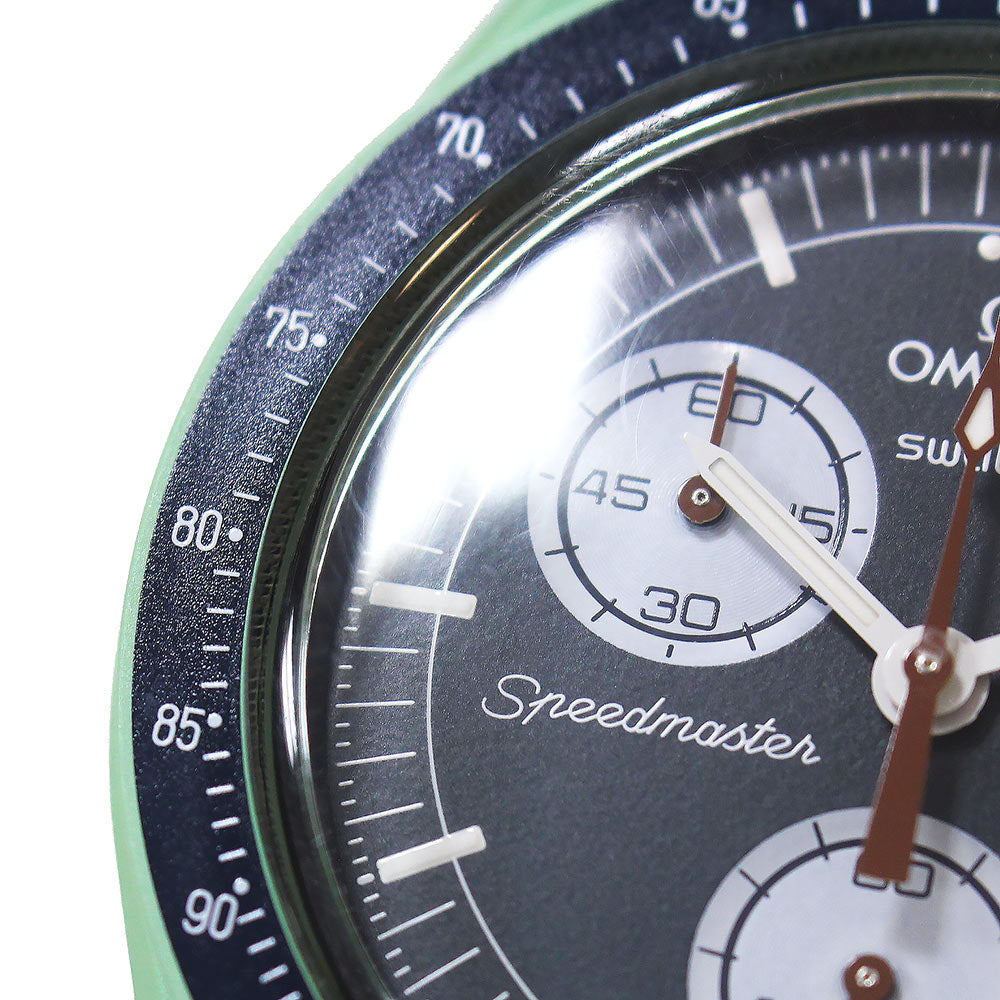 オメガとスウォッチの革新的なコラボレーション、ウォッチ。段差が設けられた外周やシャープでスムーズなラグ構造、タキメーターベゼルにはアイコニックな「ドットオーバー90」が再現されています。 バイオセラミックケースは非常に軽量で、ベルトの着け心地も良く、オリジナルのスピードマスターには無い魅力が詰まっています。 |