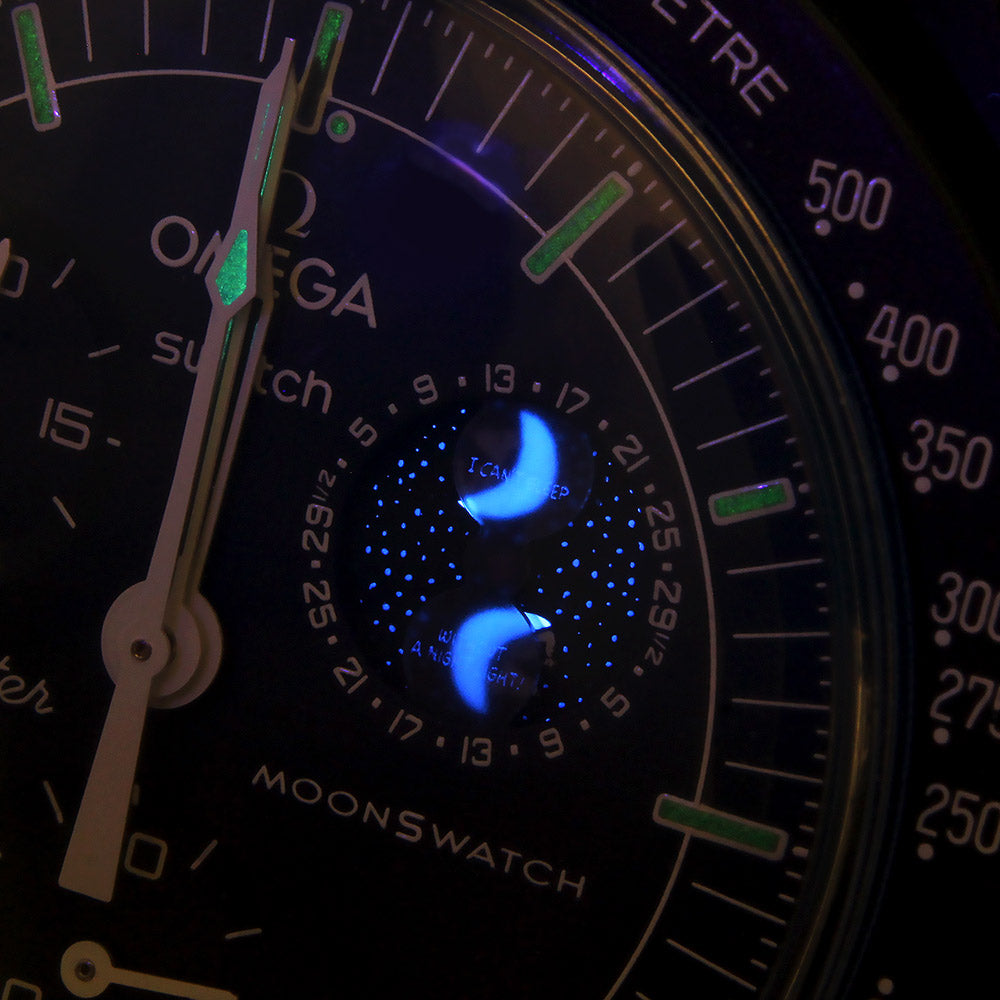 「オメガ」と「スウォッチ」のコラボレーションによるバイオセラミック ムーンスウォッチコレクションから、スヌーピーがあしらわれた限定デザインモデルの第2弾。サブダイヤルの中で動くスヌーピーは、ブラックライトで光る仕様を備えています。また、紫外線が当たると、三日月と星の中に隠されているSnoopyコミックストリップの有名な引用が表示される仕様になっているのもポイント。オメガとスウォッチのコラボから約2年という節目に相応しい仕上がりの一本です。 |