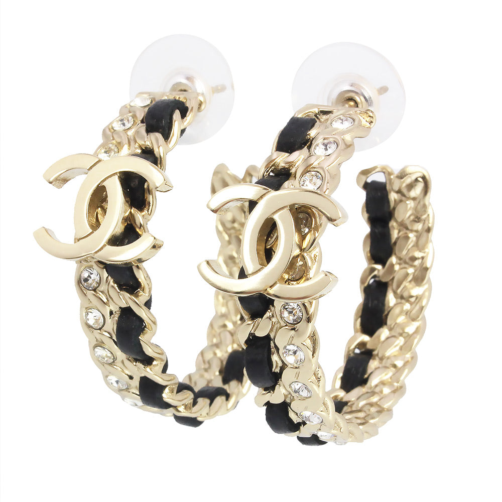 【新品・未使用品】シャネル CHANEL ココマーク ラインストーン チェーン フープ ピアス レザー ゴールド ブラック AB3051 箱付