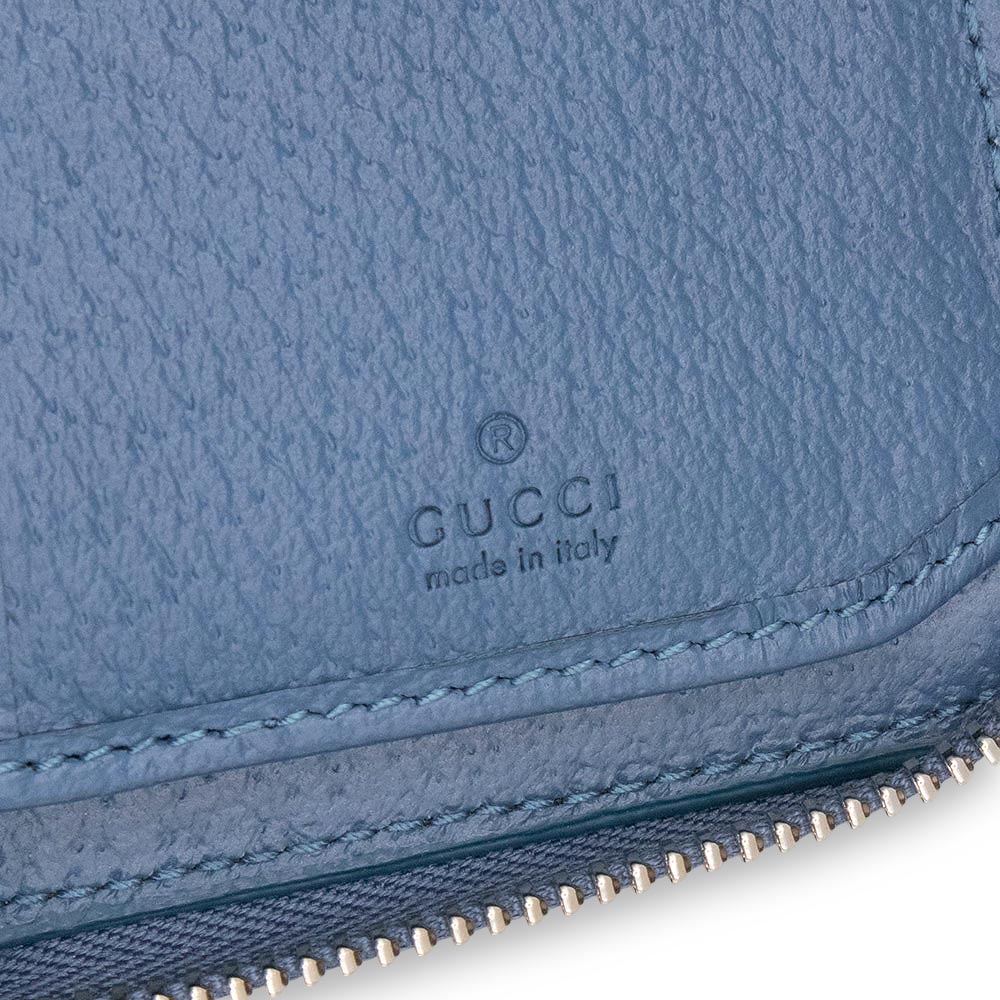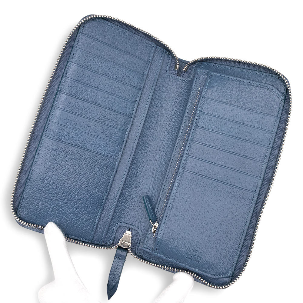 複数のコンパートメントを備えたジップアラウンドウォレット。グレー&ブラックのGGスプリーム キャンバスに、セラミック加工仕上げのGG ディテールが映えるデザインで、内側はコントラストカラーのブルーのレザーで仕上げられています。 |