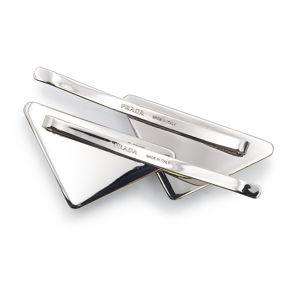 プラダを象徴する洗練された幾何学形を描くトライアングルロゴをあしらった、エナメルメタルのヘアピン。日常のコーディネートを華やかにしてくれます。エレガントでフェミニンなデザインのヘアクリップです。 |
