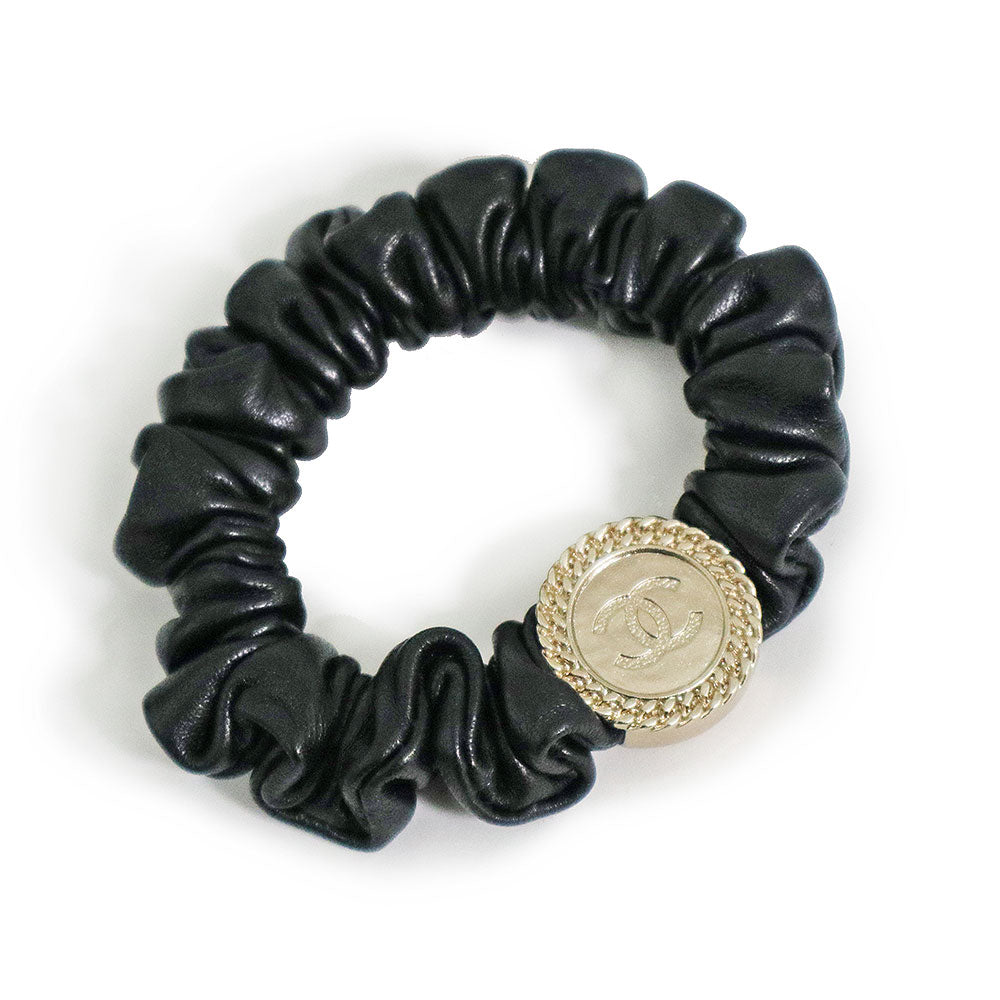 【新品・未使用品】シャネル CHANEL ココマーク シュシュ ヘアアクセサリー ゴム 髪飾り 髪留め ラムスキン レザー ブラック 黒 ゴールド金具 AB7996 箱付