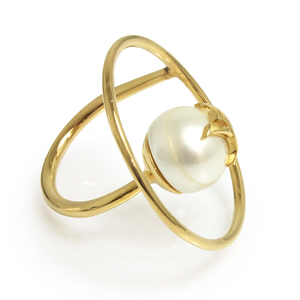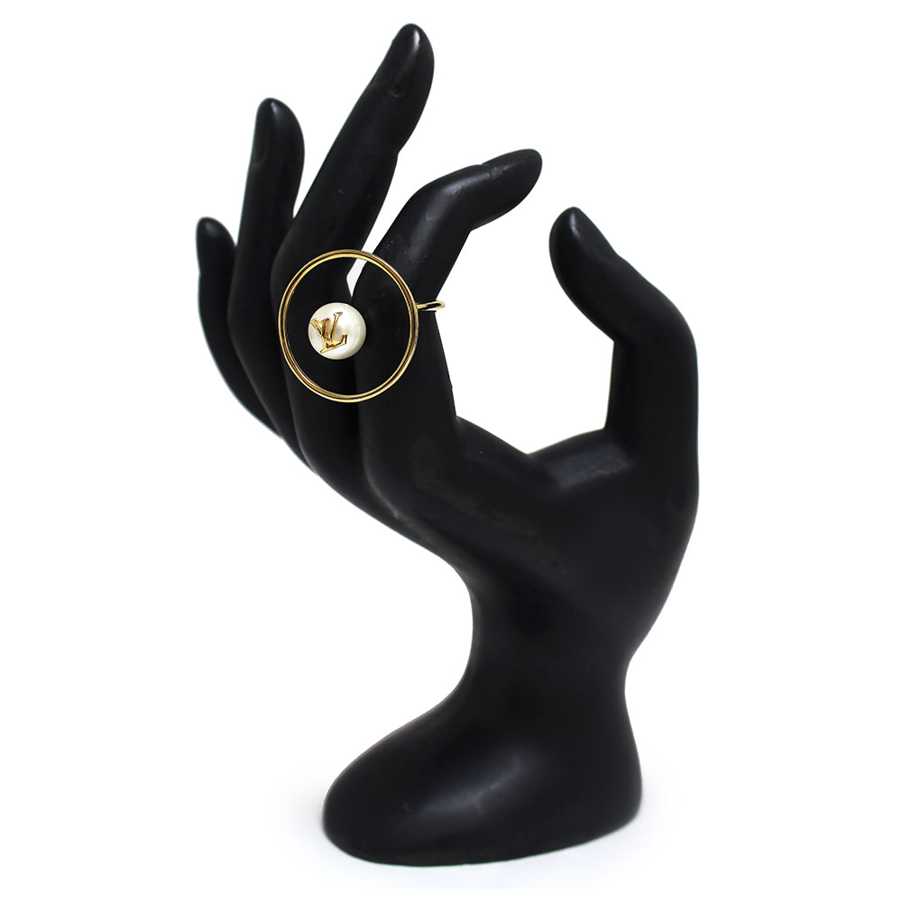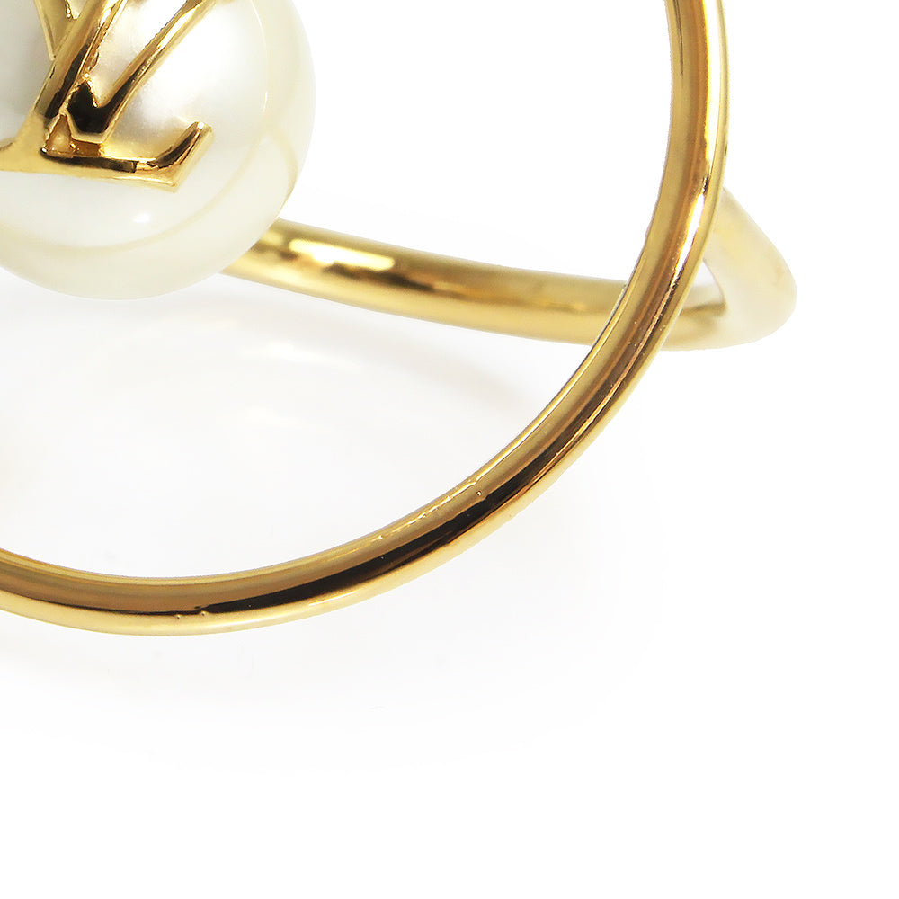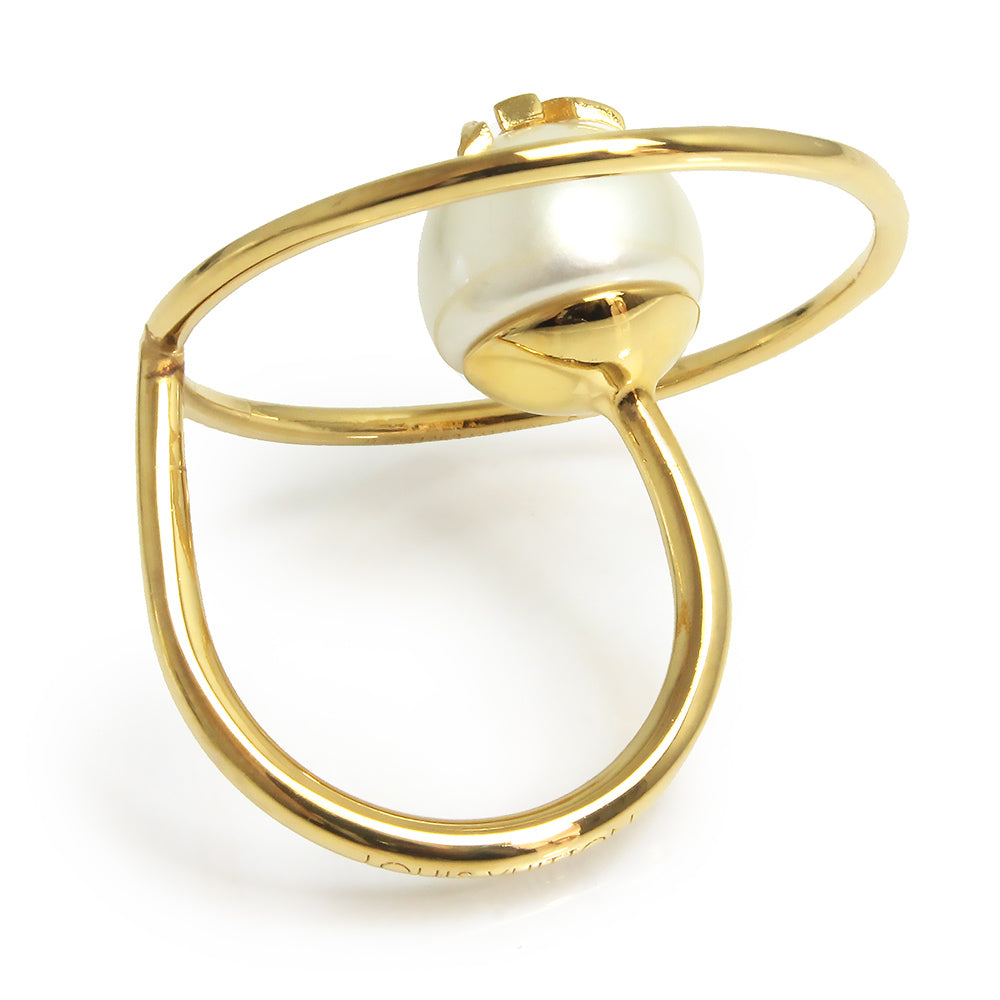 独創的なデザインが天空の美しさを想わせる「リング・LV エクリプス パール」。ゴールドカラーのメタルで象ったLV イニシャルを添えた艶やかなホワイトレジンパールが、まるで軌道を描く月のように、完璧な黄金のサークルの中心に浮かんでいます。ユニークでタイムレスなエレガンスが薫る、精緻に仕立てられたアクセサリーです。 |