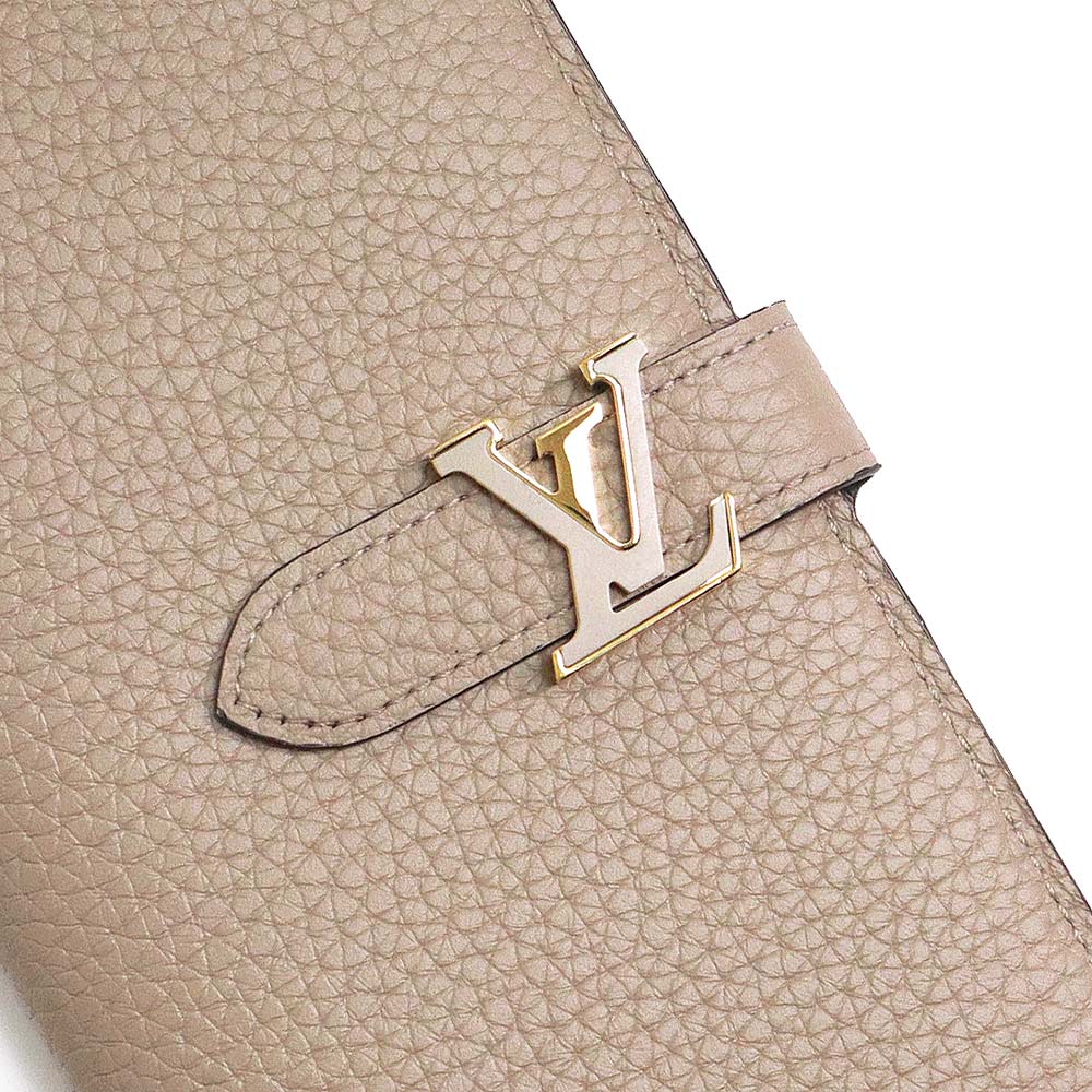 グレイン(しぼ)のある柔らかなトリヨンレザーでエレガントに仕上げられた「LV ヴェルティカル ウォレット」。コントラストカラーライニングの内装には、8つのカードスロット、ファスナー付きコインポケット、チケットや紙幣用の大ぶりの「V」シェイプのスロットが備えられています。独特のスライドスタイルの留め具には、アイコニックなバッグ「カプシーヌ」から着想を得たLV イニシャルのアクセサリーで飾られています。