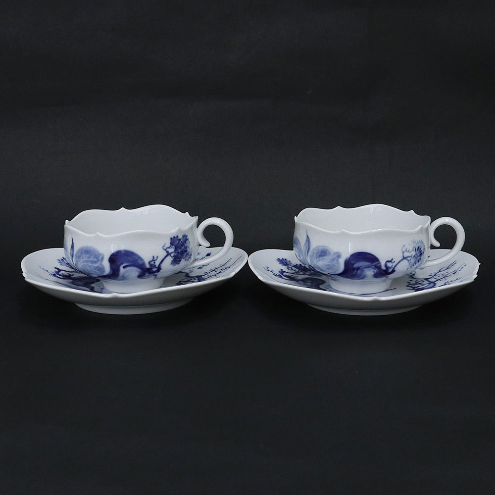 【美品】マイセン Meissen ブルーオーキッド ティーカップ&ソーサー ペア 2客セット 食器 陶磁器 ホワイト ブルー