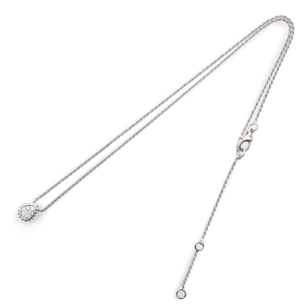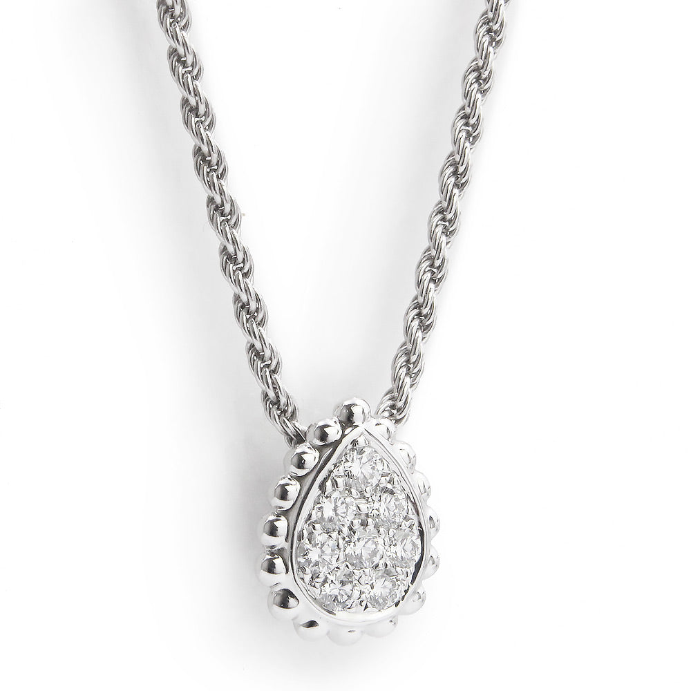 1968年に発表された、スネークの神秘的な美しさを表現したセルパンボエム。繊細なツイストチェーンが、ホワイトゴールドビースで囲まれたドロップモチーフと見事に調和しています。クラシカルでありながらモダンでエレガントなホワイトゴールドとダイヤモンドのペンダントは、コーディネートの幅が広がります。