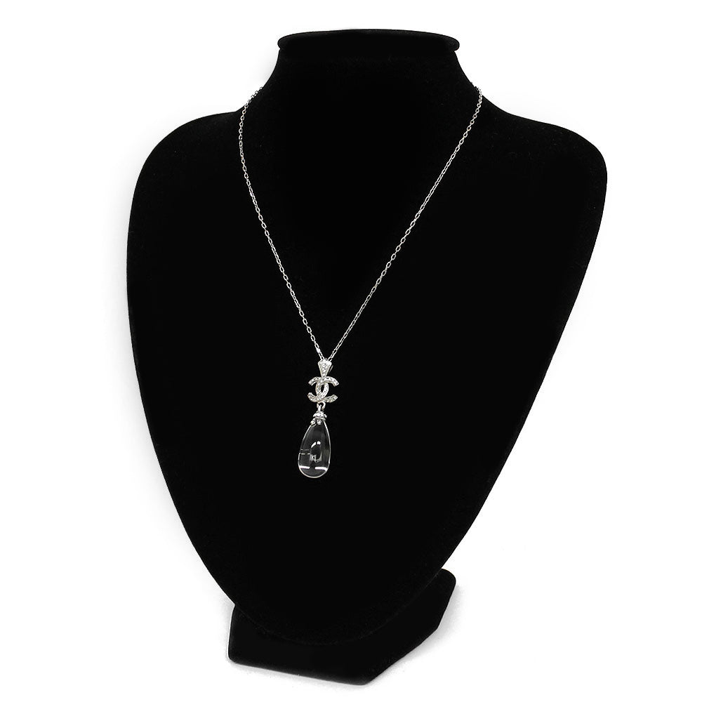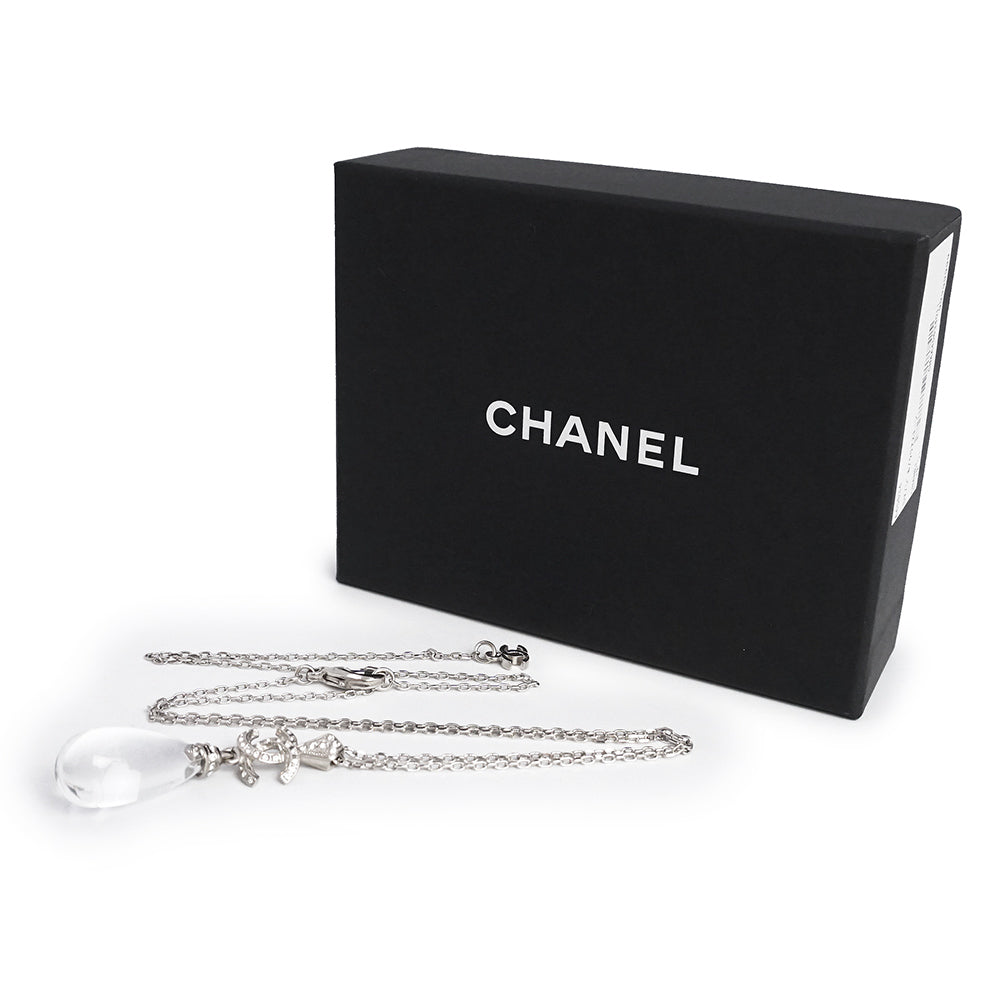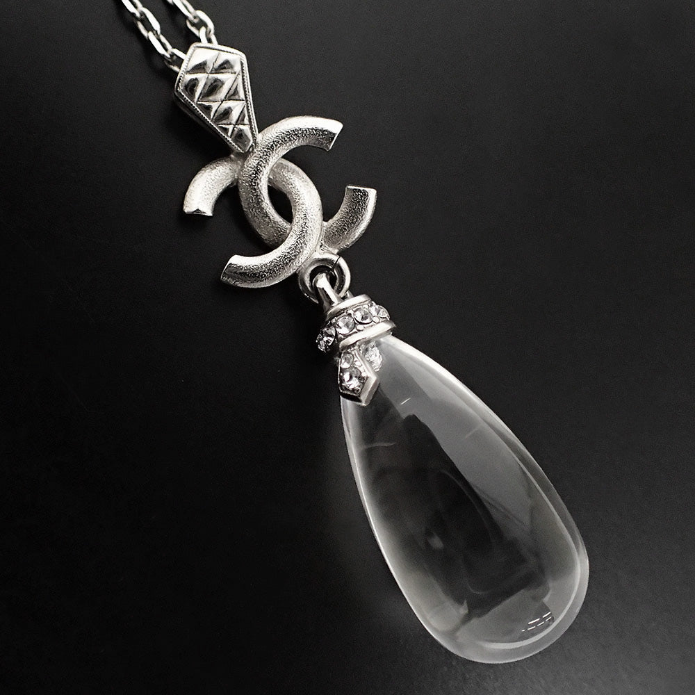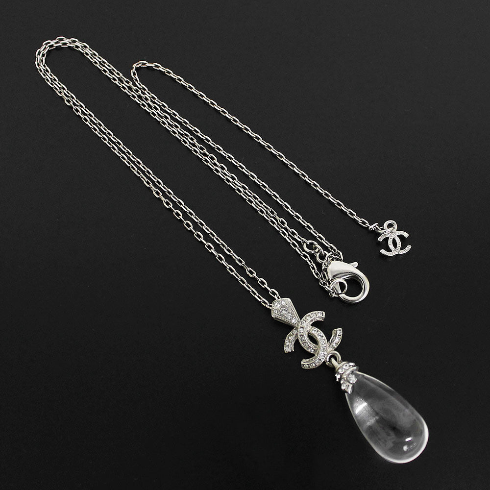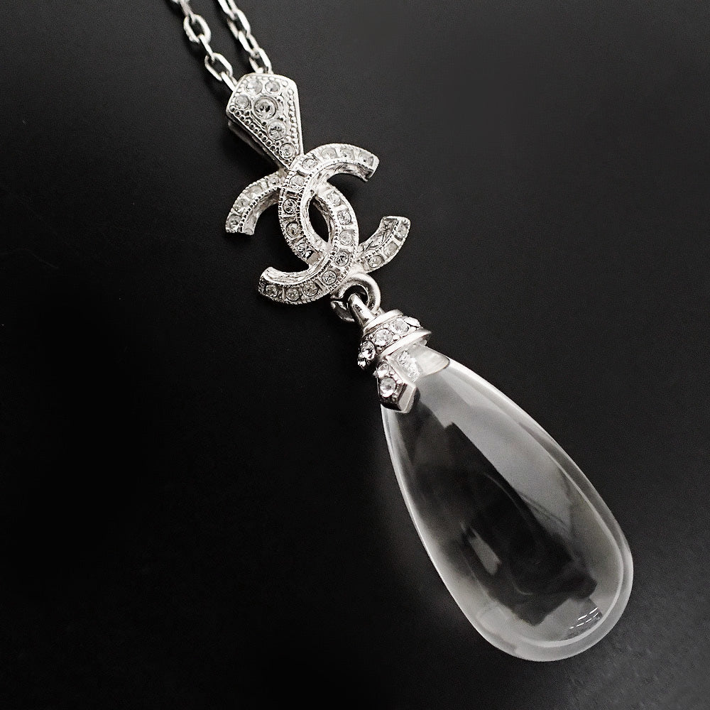 シャネルのココマークとティアドロップがモチーフになったネックレス。ラインストーンを散りばめたココマークに、クリアなティアドロップがポイント。合わせるファッションを選ばずコーディネートの仕上げにお使い頂けます。
