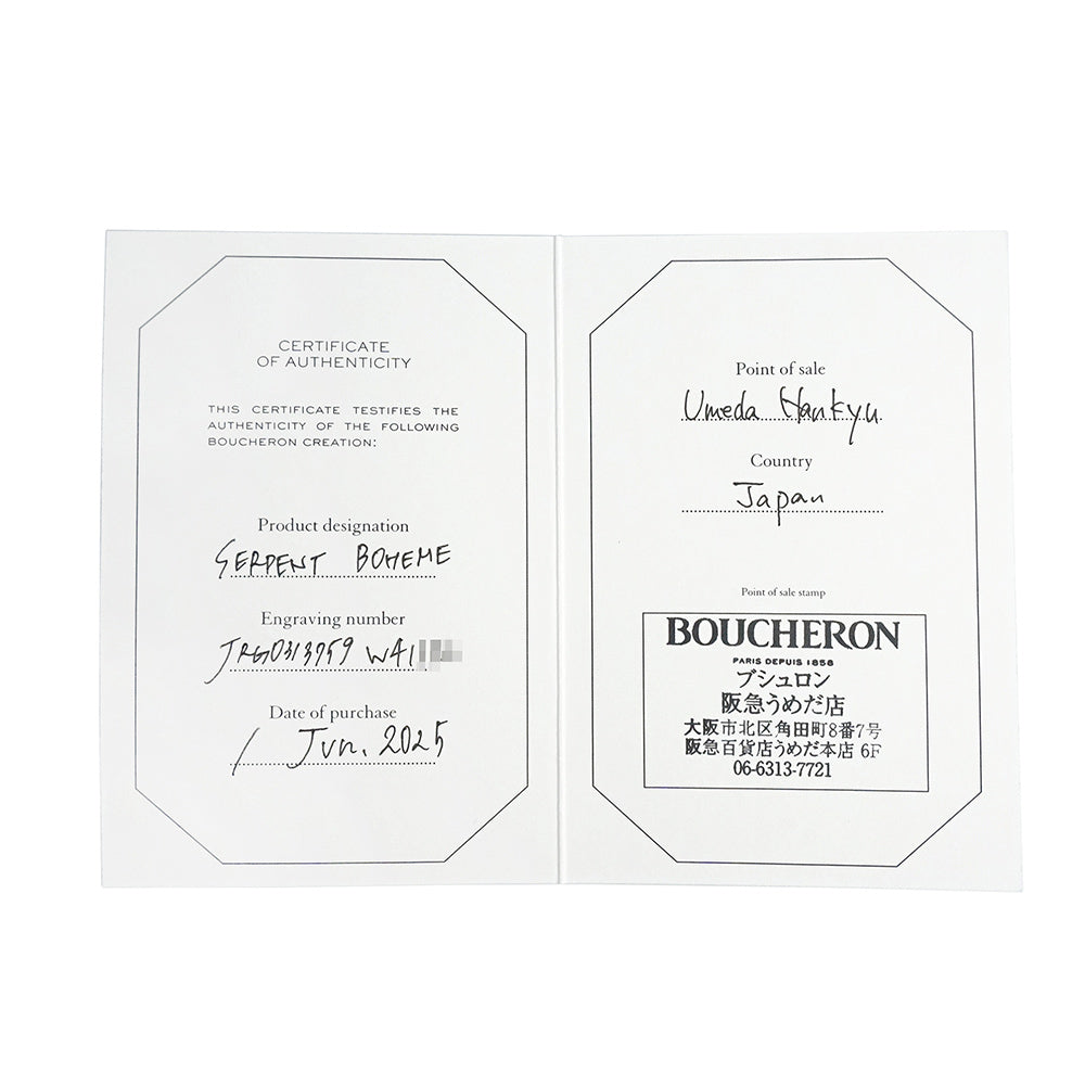 スネークの神秘的な美しさを表現したセルパンボエム。華やかで透明感のあるアクアプレーズを縁取るホワイトゴールドビーズや繊細で華奢なツイストチェーンからインスピレーションを得たアームには、ブシュロンが誇る高いジュエリー制作の技術が活かされています。 |