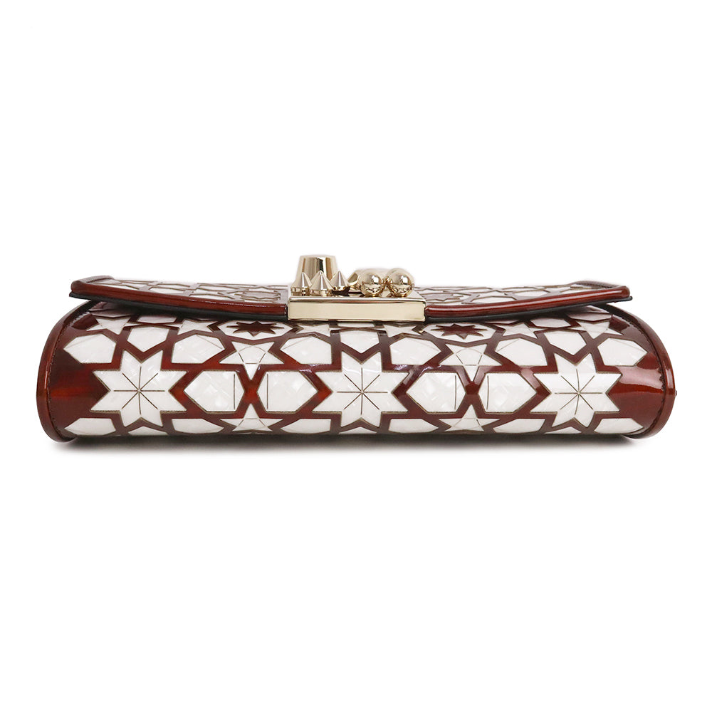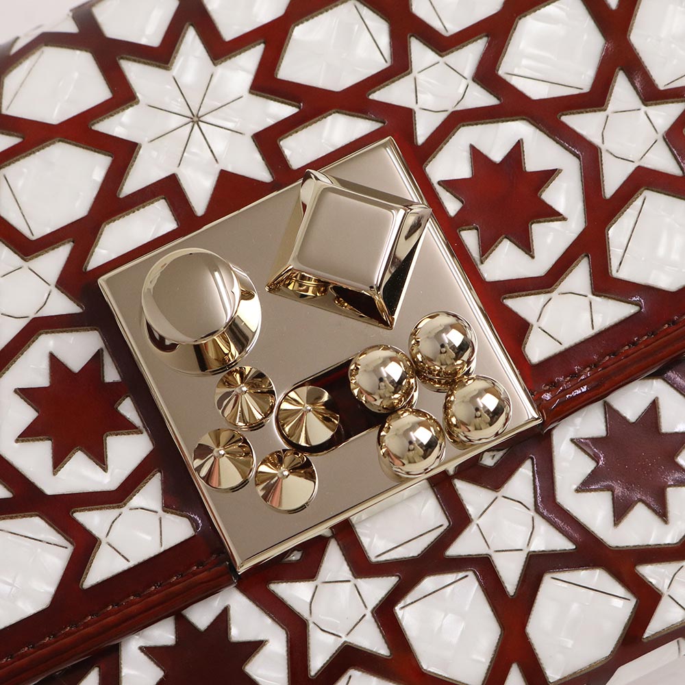 ホワイトとバーボンブラウンのマルケトリー生地を使用し、控えめなディテールで洗練されたスタイルです。ショルダーストラップは取り外し可能でクラッチバッグとしてもお使いいただけます。 |