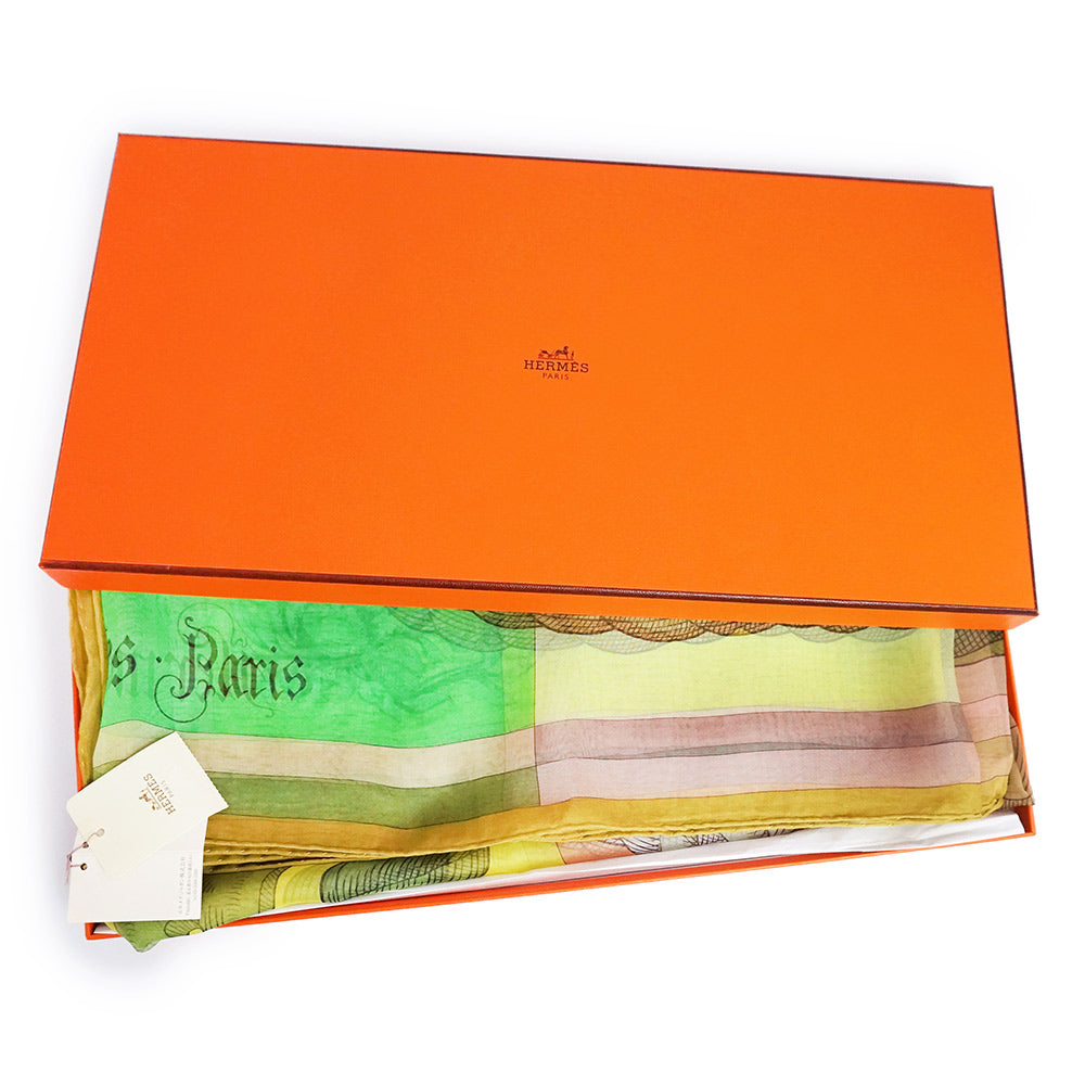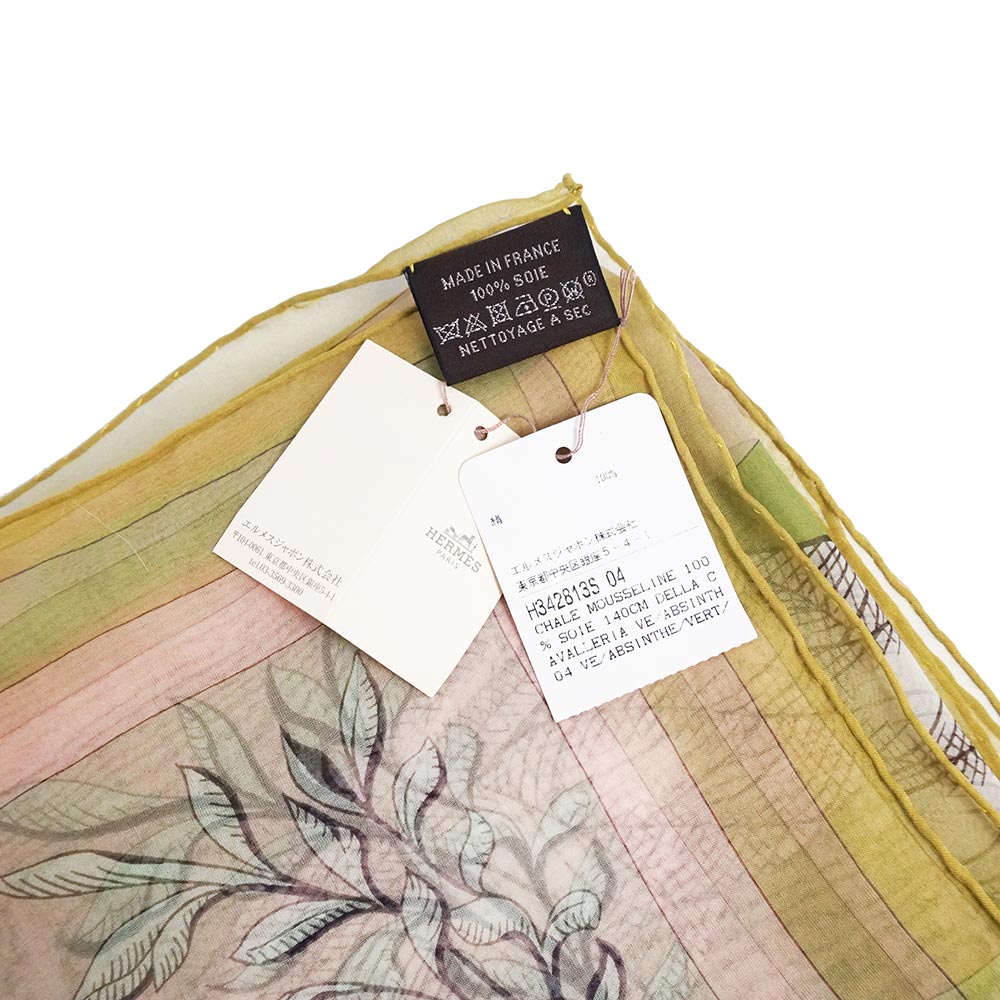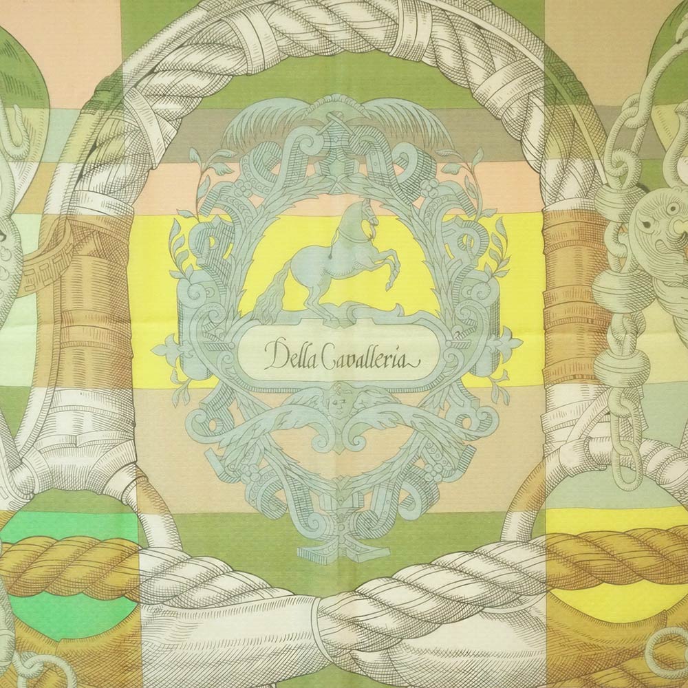 【新品・未使用品】エルメス HERMES カレジェアン 140 モスリン Della Cavalleria デッラ カヴァッレリア スカーフ ショール ストール シフォン シルク100% ヴェールアブサン グリーン イエロー 箱付