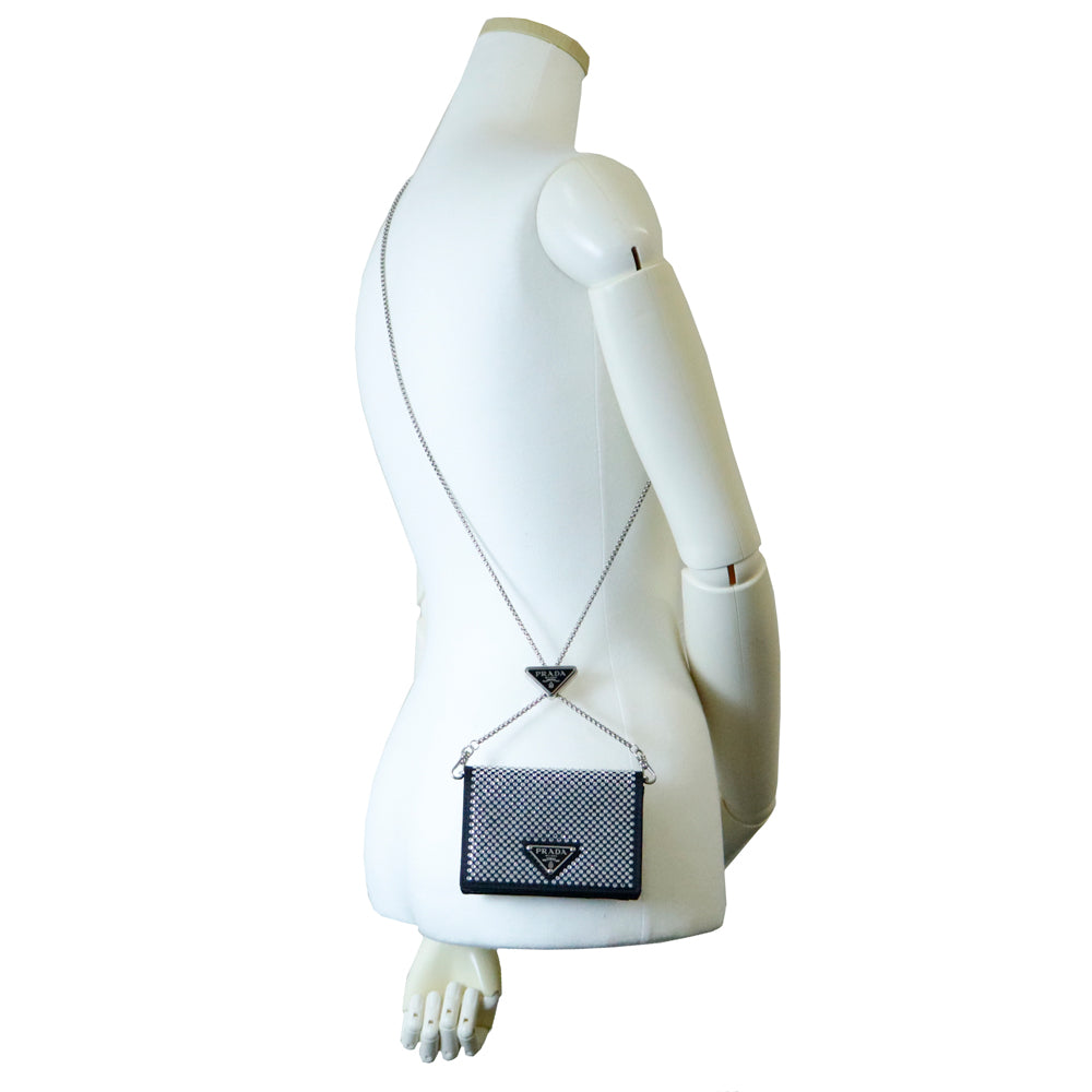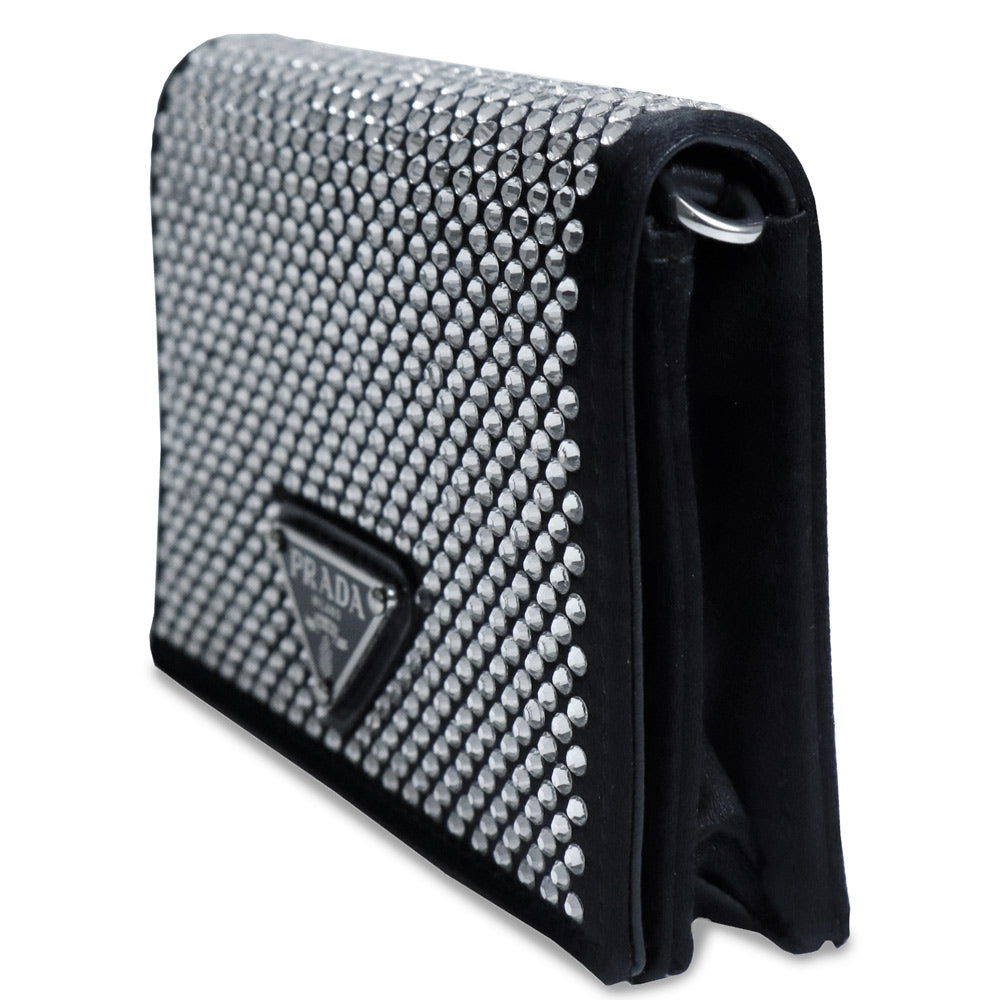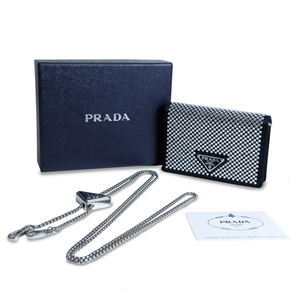 【未使用 展示品】プラダ PRADA ショルダーストラップ付 クリスタル カードケース 名刺入れ 定期入れ パスケース サテン シルク ラインストーン ブラック シルバー金具 1MR024 箱付