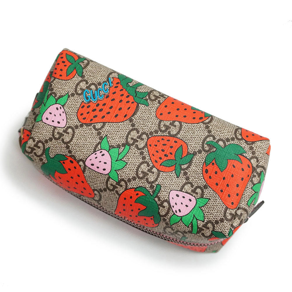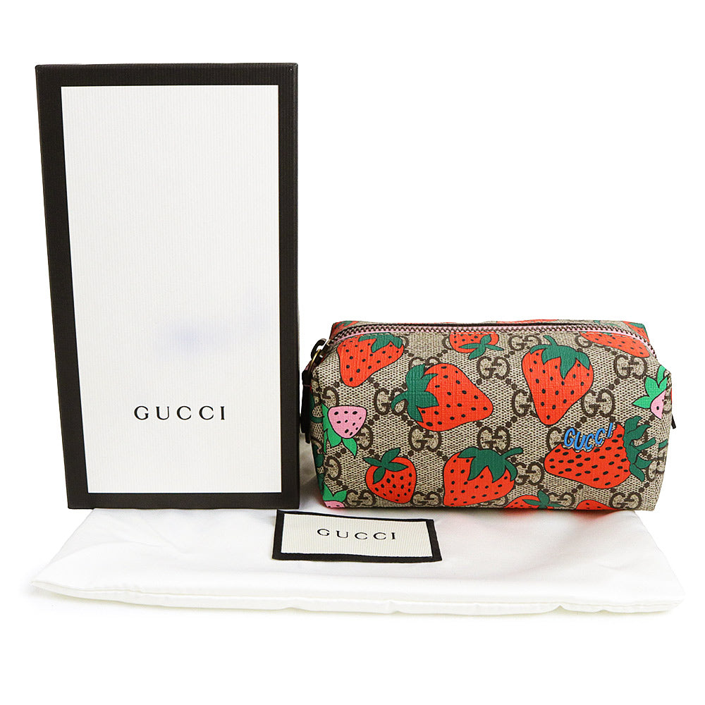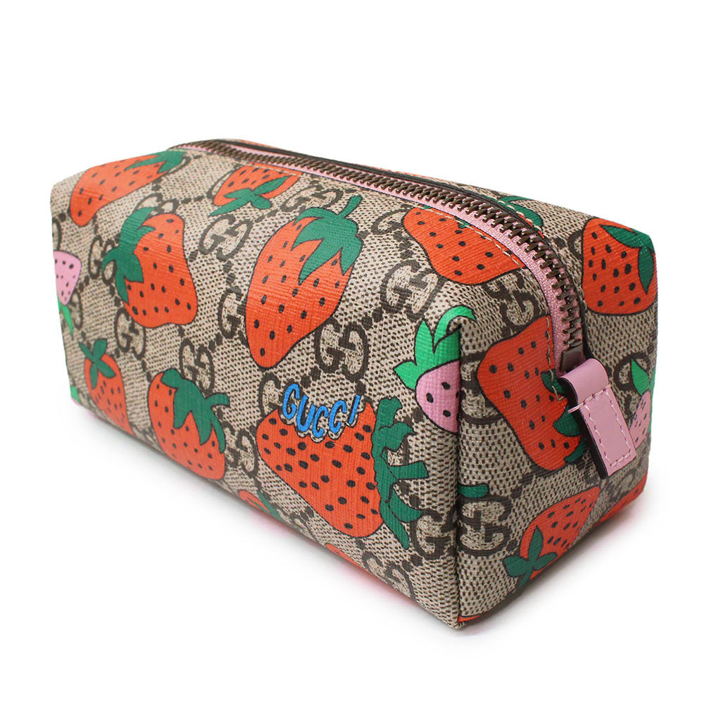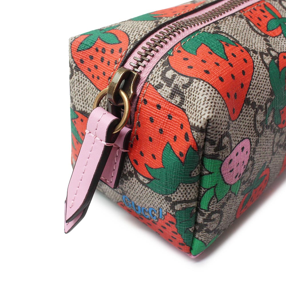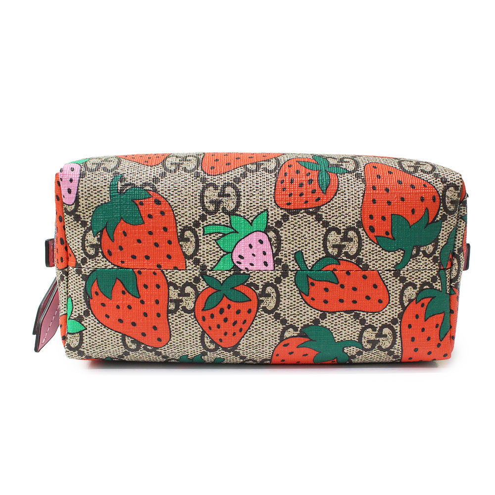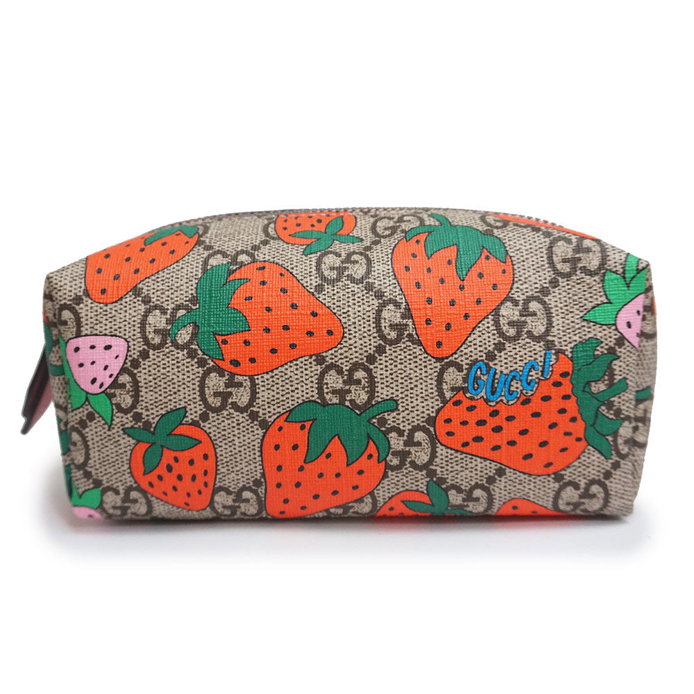 GUCCIの ストロベリー(いちご) がプリントされたコスメポーチ。ピンク&レッドのストロベリーをキャンバスにデザインされています。マチが広く収納力抜群で、化粧ポーチや小物入れとして幅広くお使い頂けます。