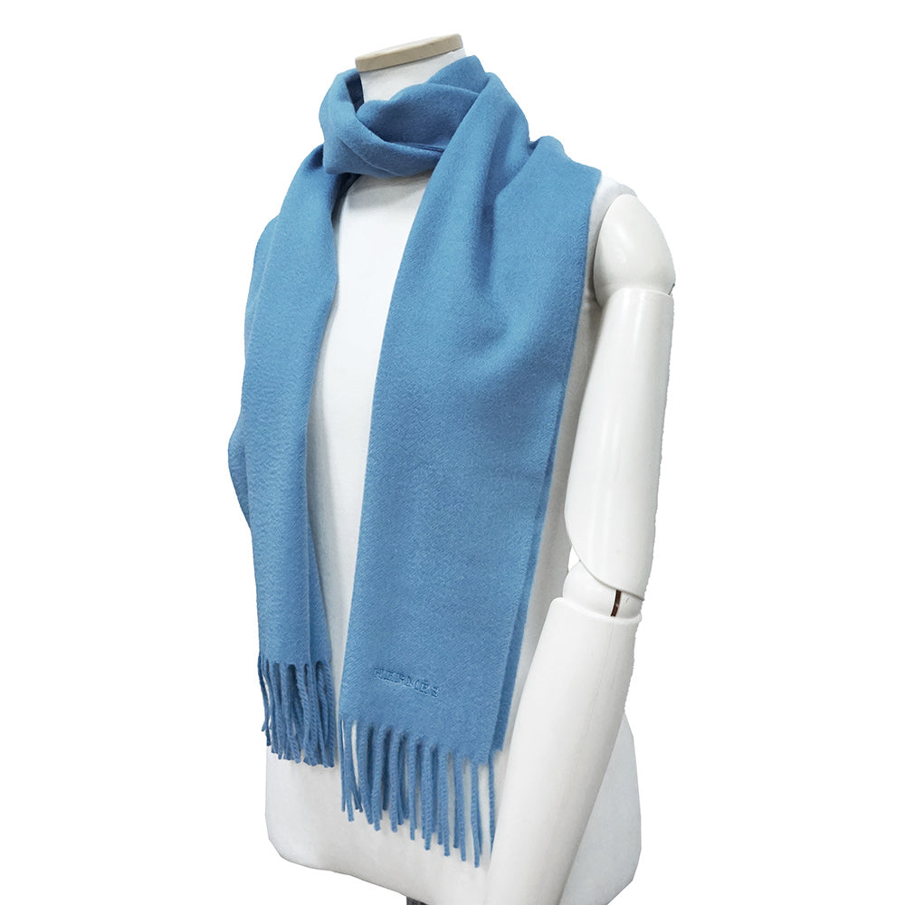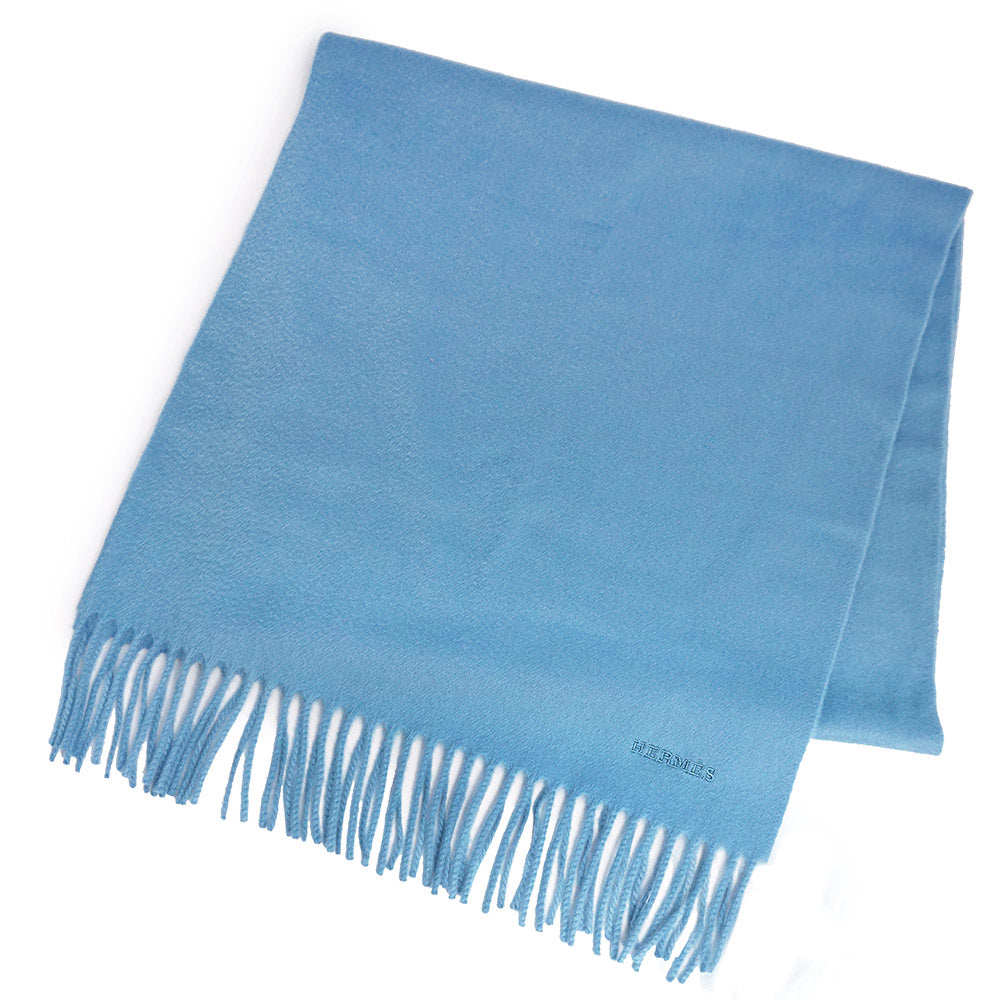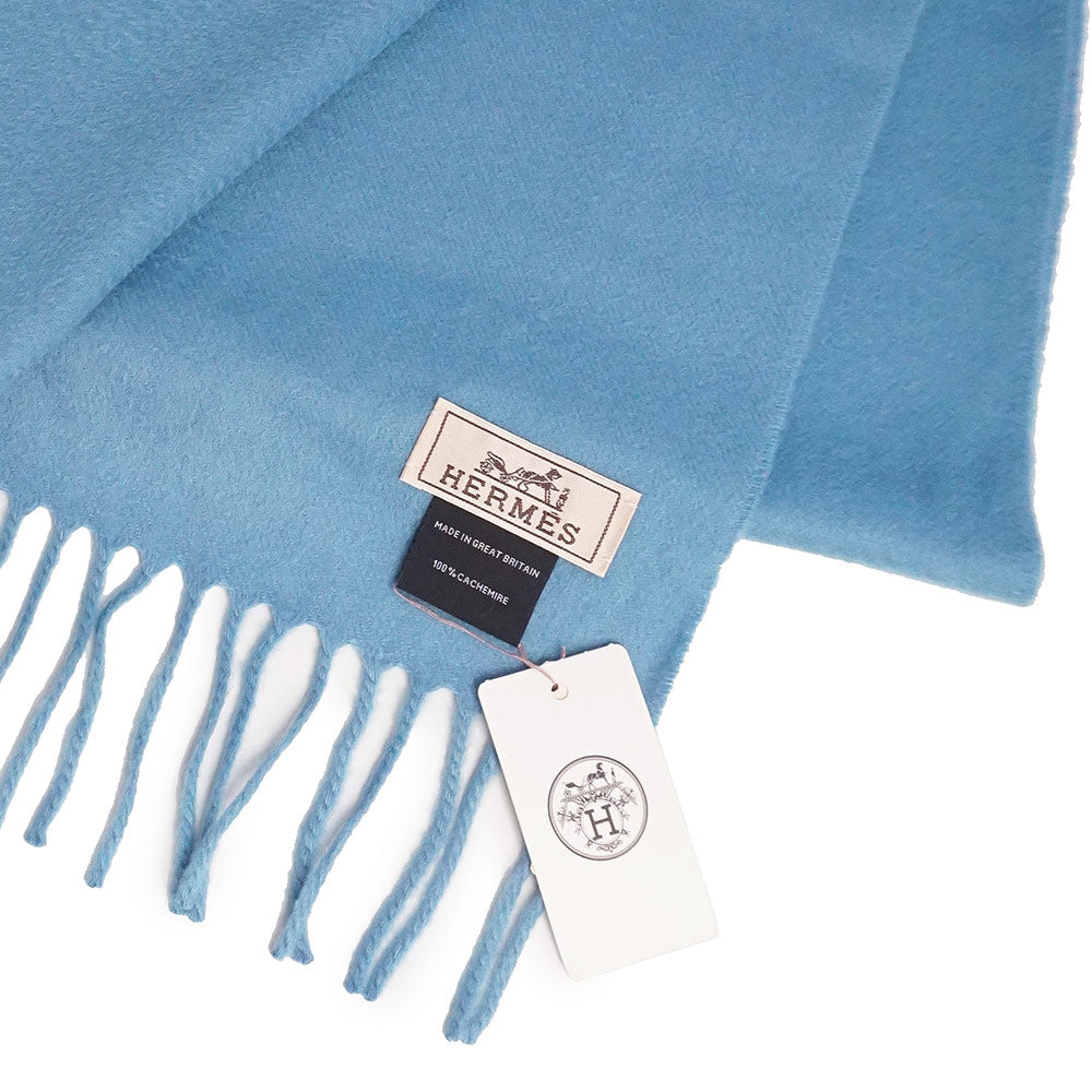 【新品・未使用品】HERMES エルメス ユニ ブロデ カシミヤ 100% ライトブルー フリンジ マフラー 箱付