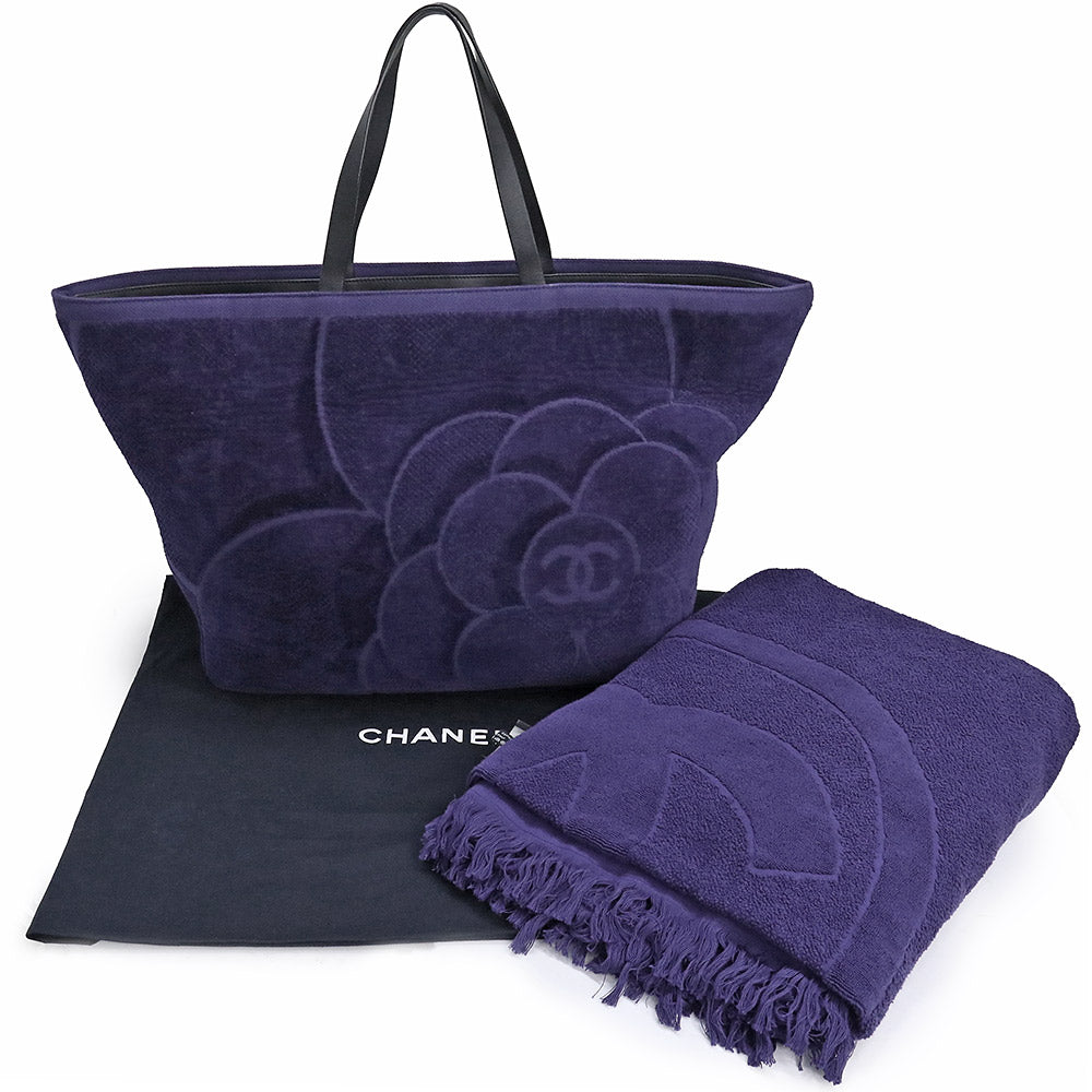 シャネルのビーチバッグ、ビーチタオルのセットです。トートバッグはビーチタオルも一緒に持ち運びできるように大き目サイズなので、ビーチやプールに行く時だけでなく、旅行バッグとしてもお使いいただけます。 |