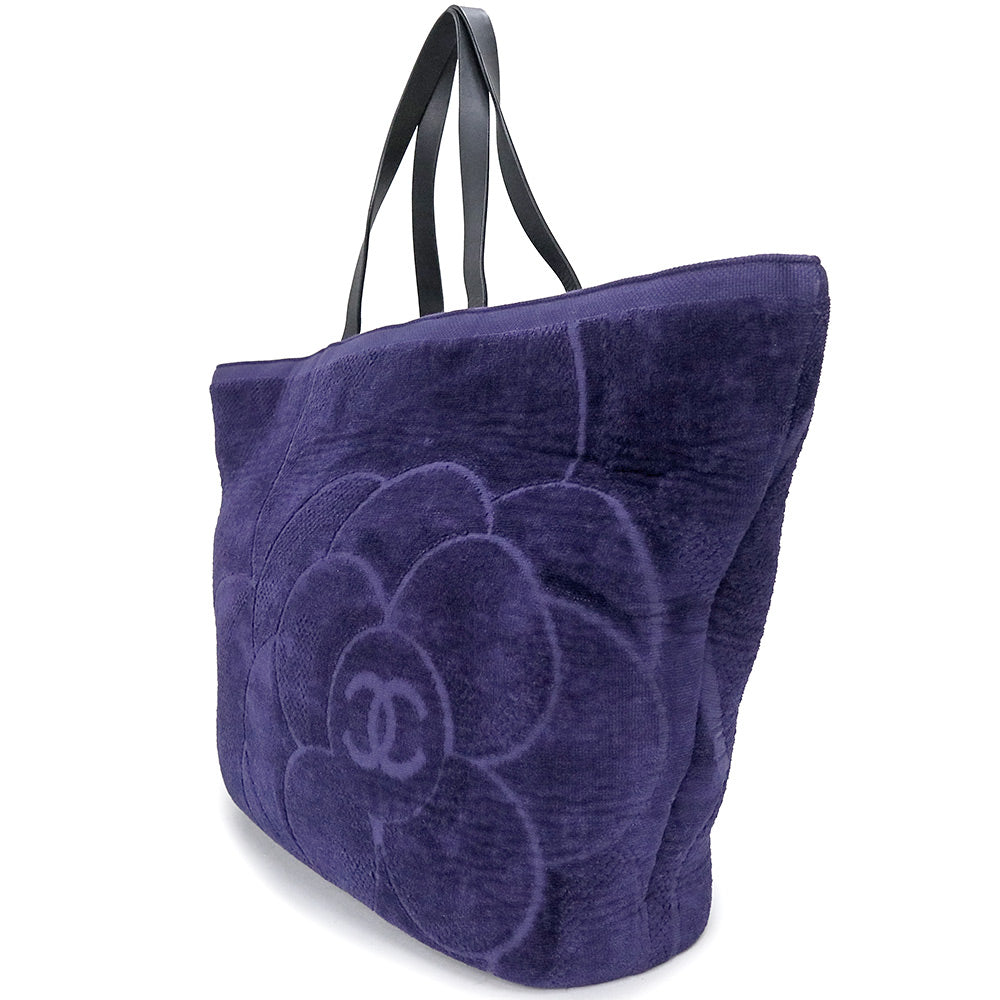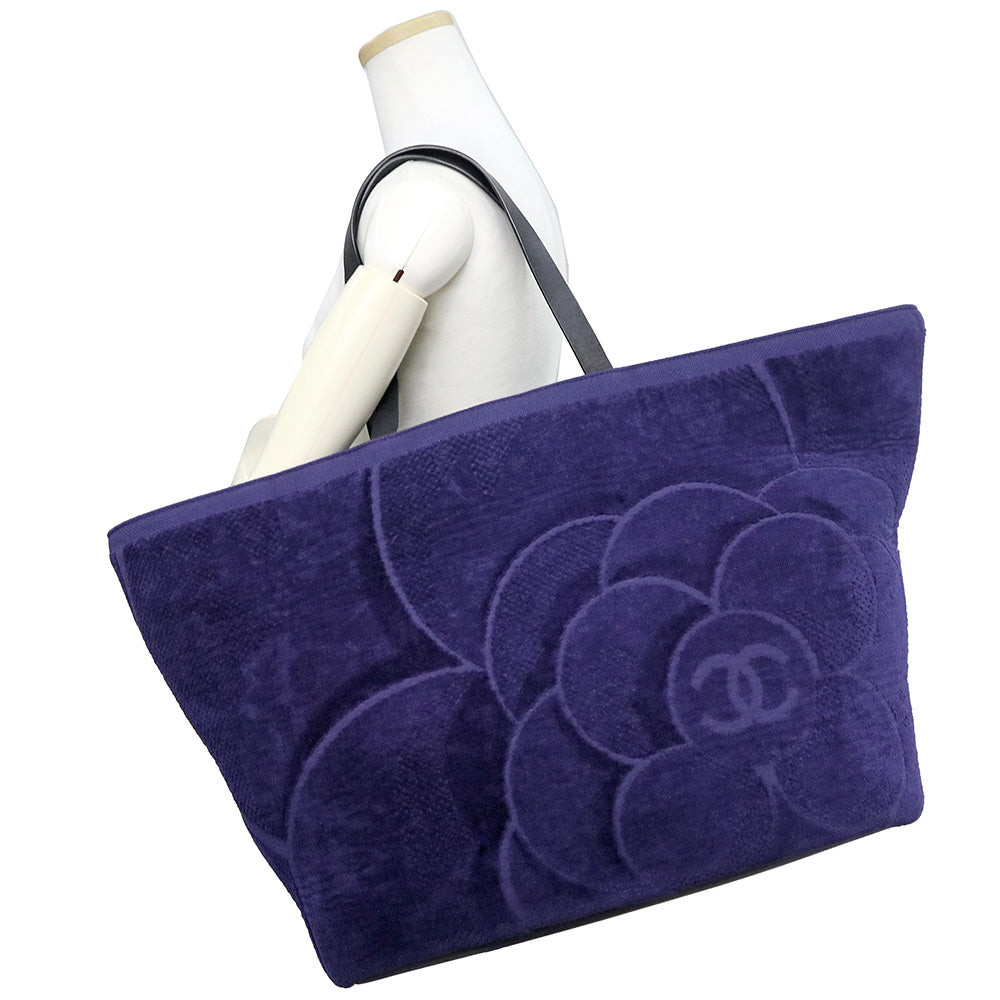 【中古】シャネル CHANEL ココマーク カメリア ビーチバッグ タオル付 トートバッグ コットン100% レザー ポリアミド ネイビー シルバー金具