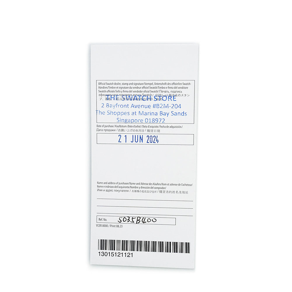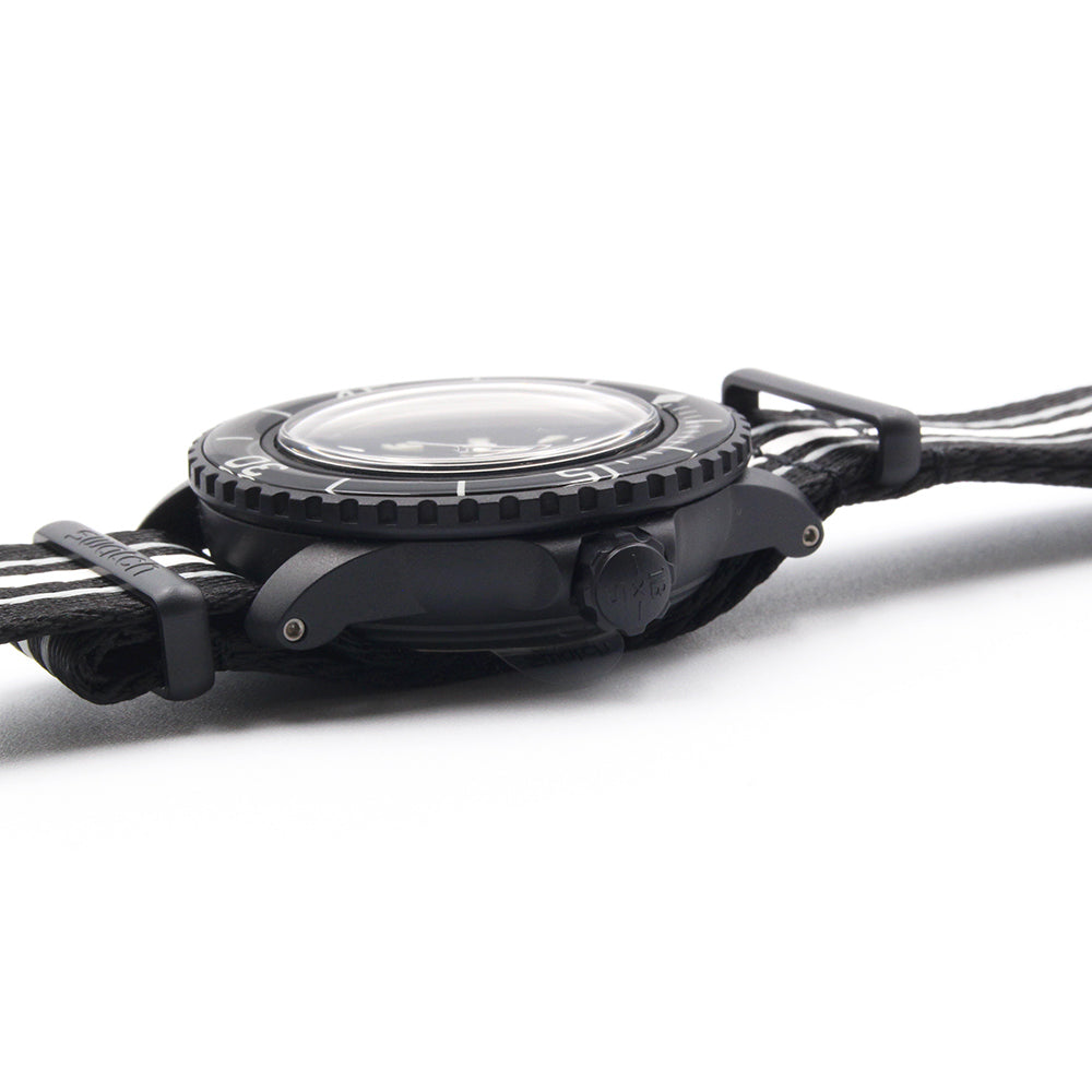 スウォッチとブランパンのコラボレーションウォッチ。このBlancpain X Swatchタイムピースは、最初の本格的なダイバーズウォッチ、ブランパンのFifty Fathomsへのオマージュ。ブラックのケースとクラウンにはBioceramic素材が使用されていて、ケースの左側にSwatchの文字が刻まれています。