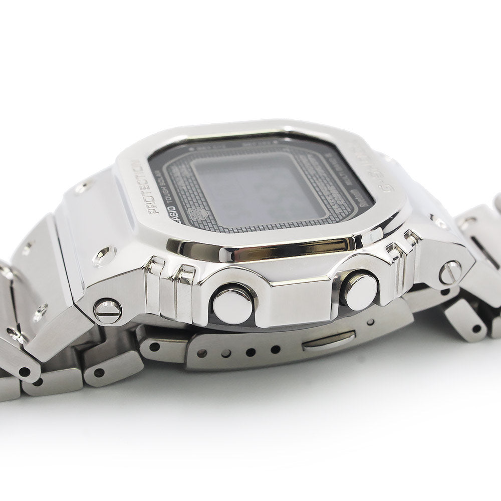 1983年に誕生したG-SHOCK初号機DW-5000C。その象徴であるスクエアデザインはそのままにフルメタル化し、スマートフォンリンクをはじめとした先進機能を搭載したGMW-B5000シリーズです。機能面ではBluetooth通信機能を備え、専用アプリとの連携により正確な時刻情報を取得可能。更に標準電波(マルチバンド6)による時刻修正システム、タフソーラーによる安定駆動、高輝度フルオートLEDバックライト、ワールドタイム、6ヵ国語の曜日表示などの実用性も備えます。