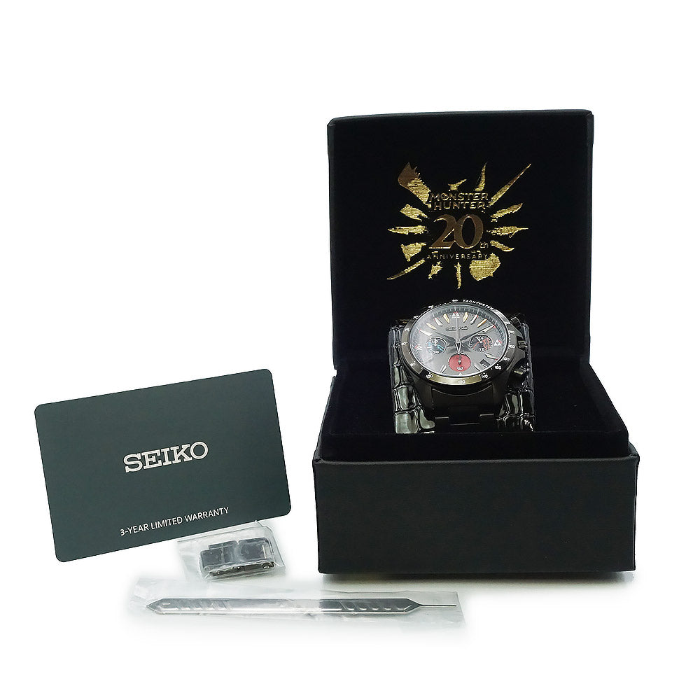 【美品】セイコー SEIKO モンスターハンター 20周年記念 コラボ 2000本限定 アルバトリオンモデル クロノグラフ クォーツ 腕時計 Lサイズ ステンレススチール ブラック 8T63-03E0 箱付