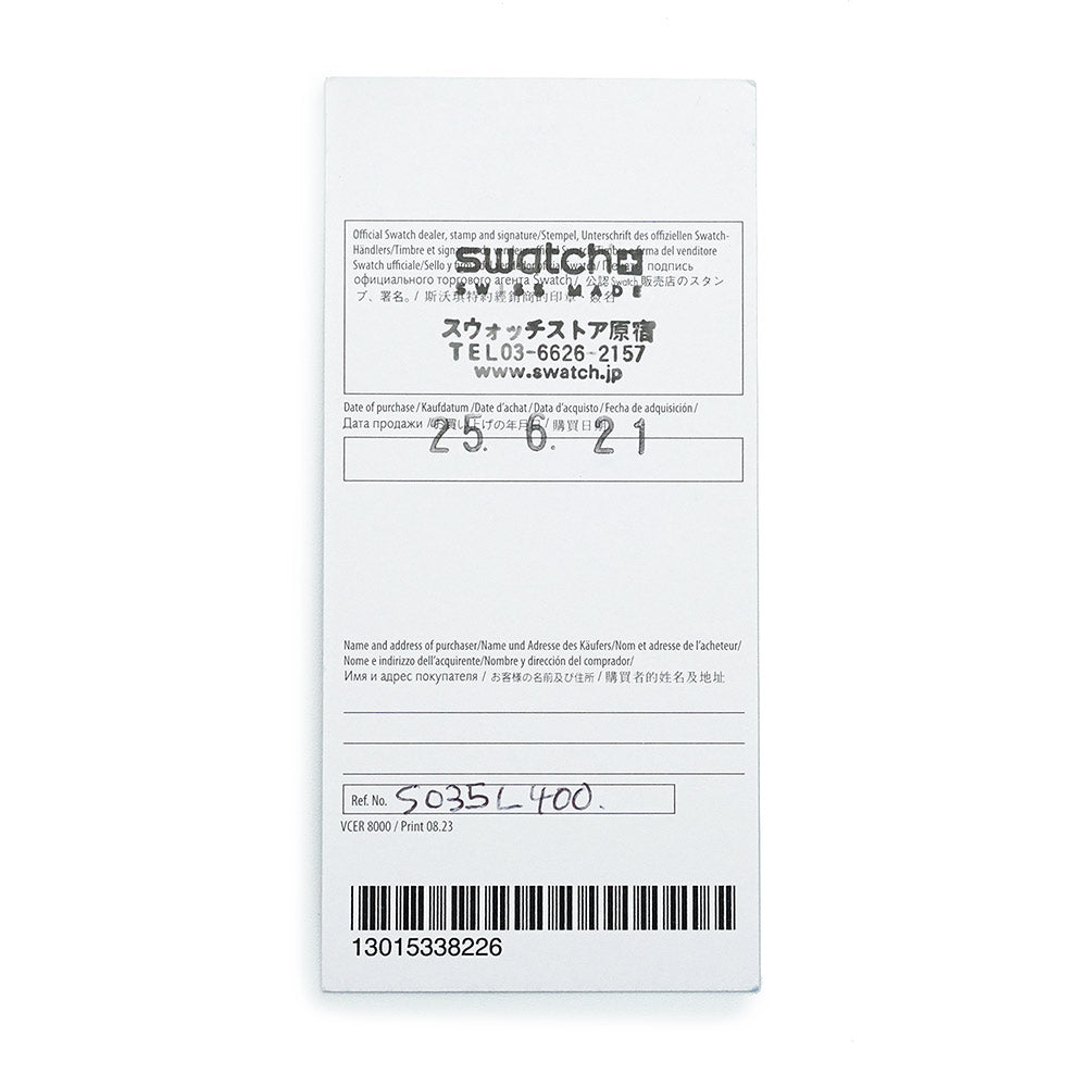 スウォッチとブランパンのコラボレーションウォッチ。ターコイズブルーのケースとクラウンにはBioceramic素材が使用されており、ケースの左側にSwatchの文字が刻まれています。文字盤は、何層にもわたって丹念に色が重ねられたことによって得られた美しいグラデーション効果が特徴です。 |