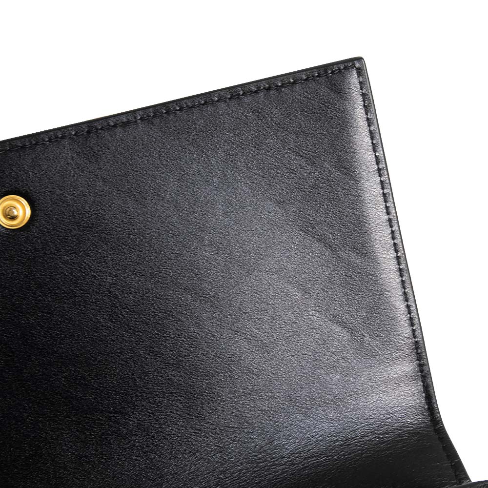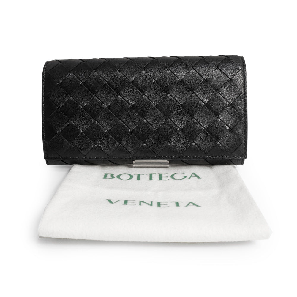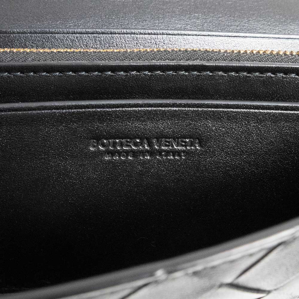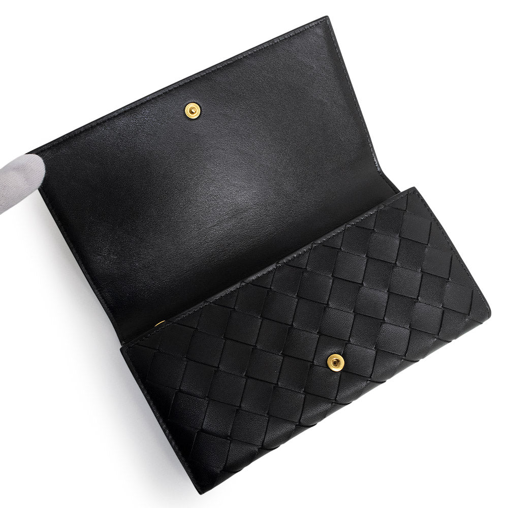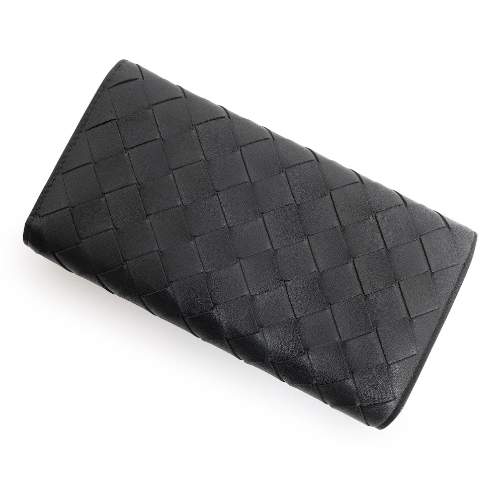 ボッテガ・ヴェネタを象徴するイントレチャートが美しく映えるフラップウォレット。上質なラムスキンとカーフスキンを使用し、しなやかさと耐久性を兼ね備えた仕上がりです。ブラックレザーにゴールド金具が上品なアクセントを添え、洗練された印象を演出します。収納力に優れ、デイリーからフォーマルまで幅広いシーンで活躍する長財布です。 |