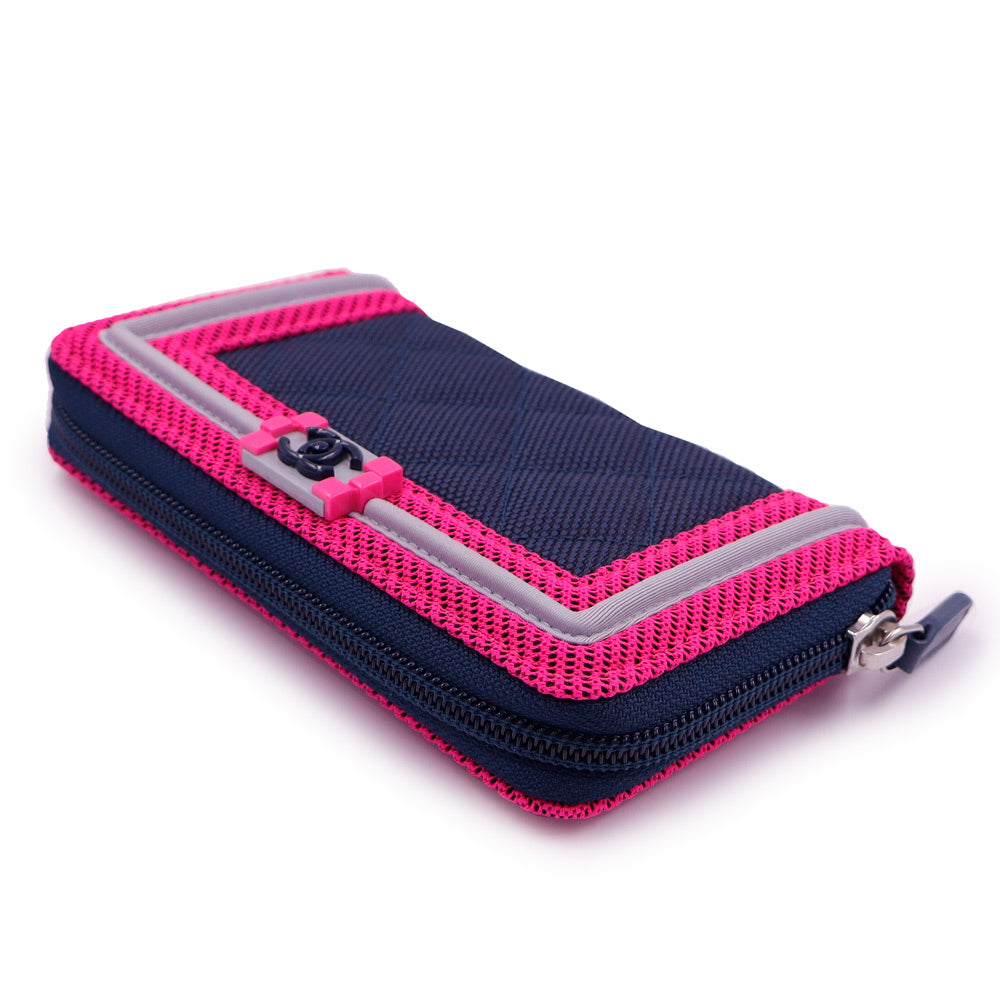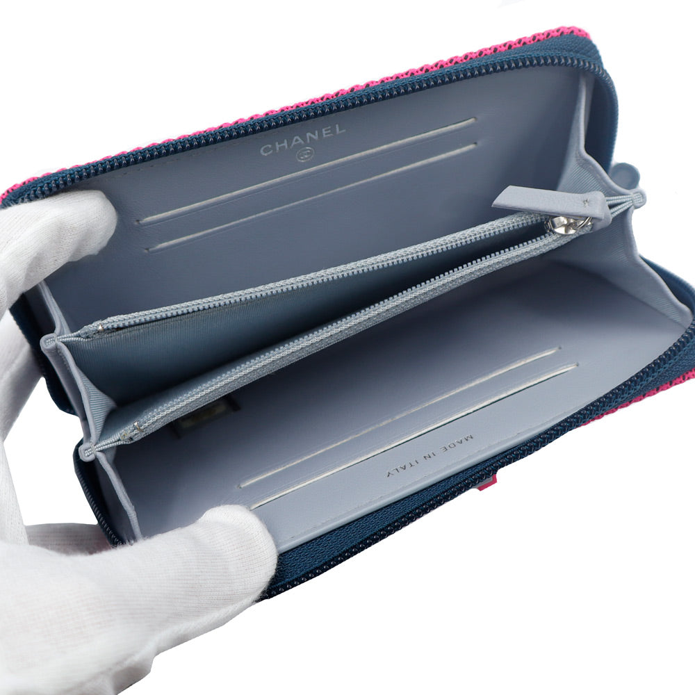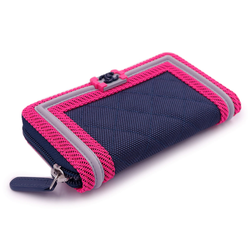 シャネルのラウンドファスナー長財布で、ネイビー×ピンクの配色が目を引くスポーティーでおしゃれなデザインです。内側はカード収納やファスナー付き小銭入れがあり、実用性も高くデイリーにお使いいただけます。 |