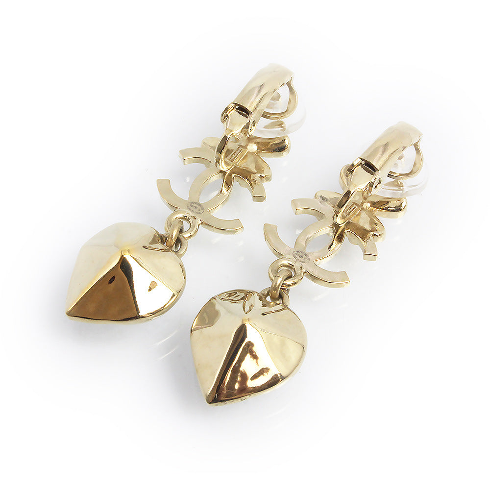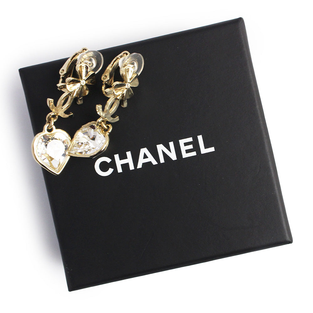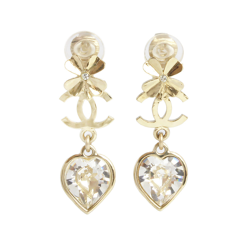 [Brand New, Unused] CHANEL Coco Mark Clover Crystal Heart Swing Earrings Gold AB8591 with Box