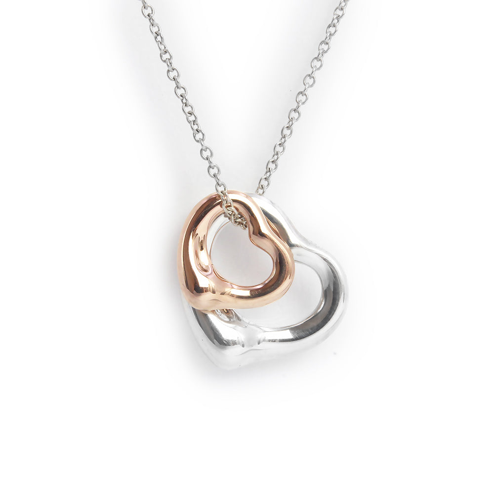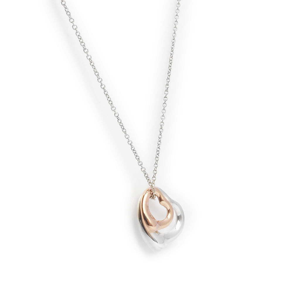 Excellent condition Tiffany & Co. Elsa Peretti Double Open Heart Pendant Necklace in SV925, 18K Rose Gold, 750 Sterling Silver, and Pink Gold (Product Code: 60020322)
