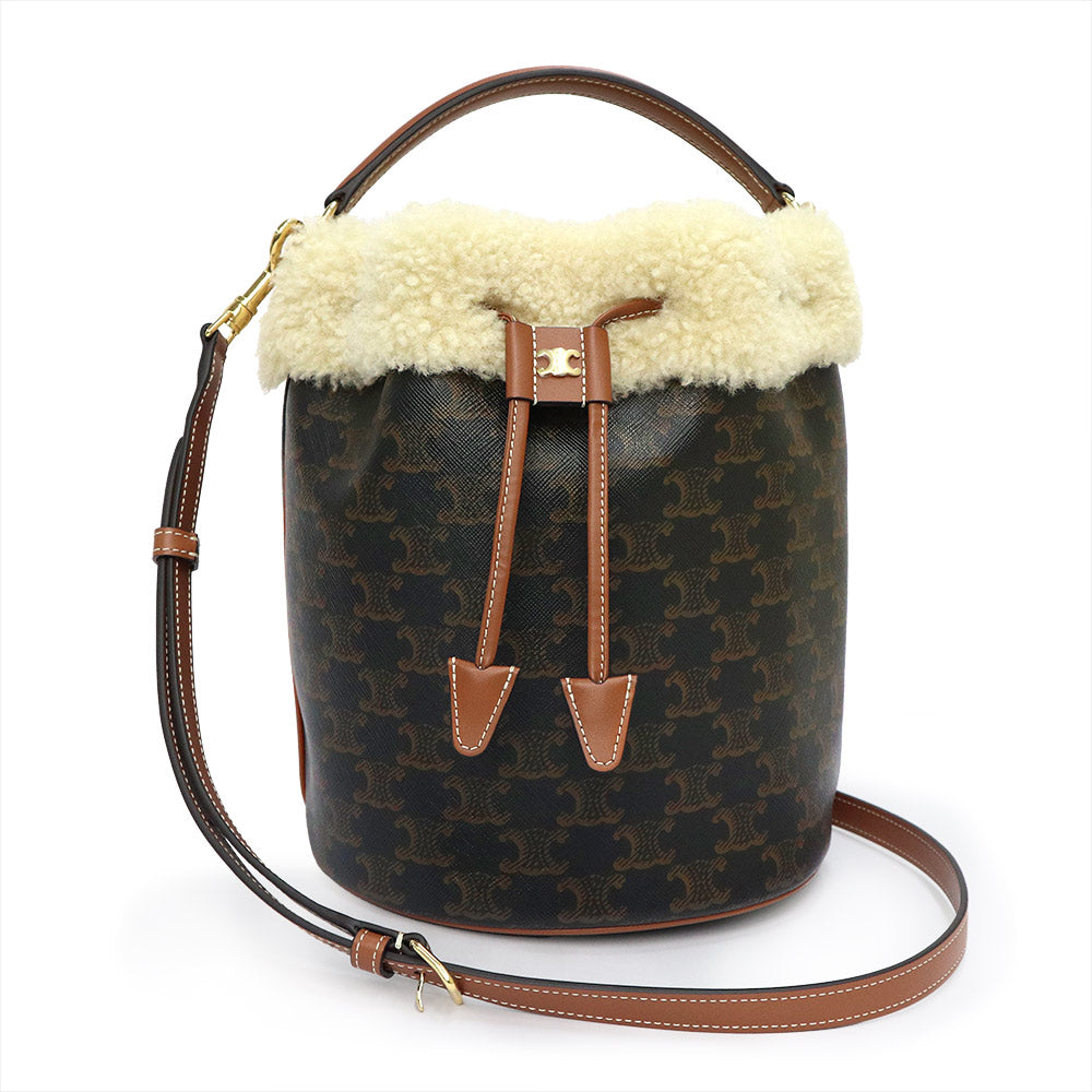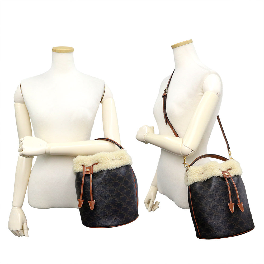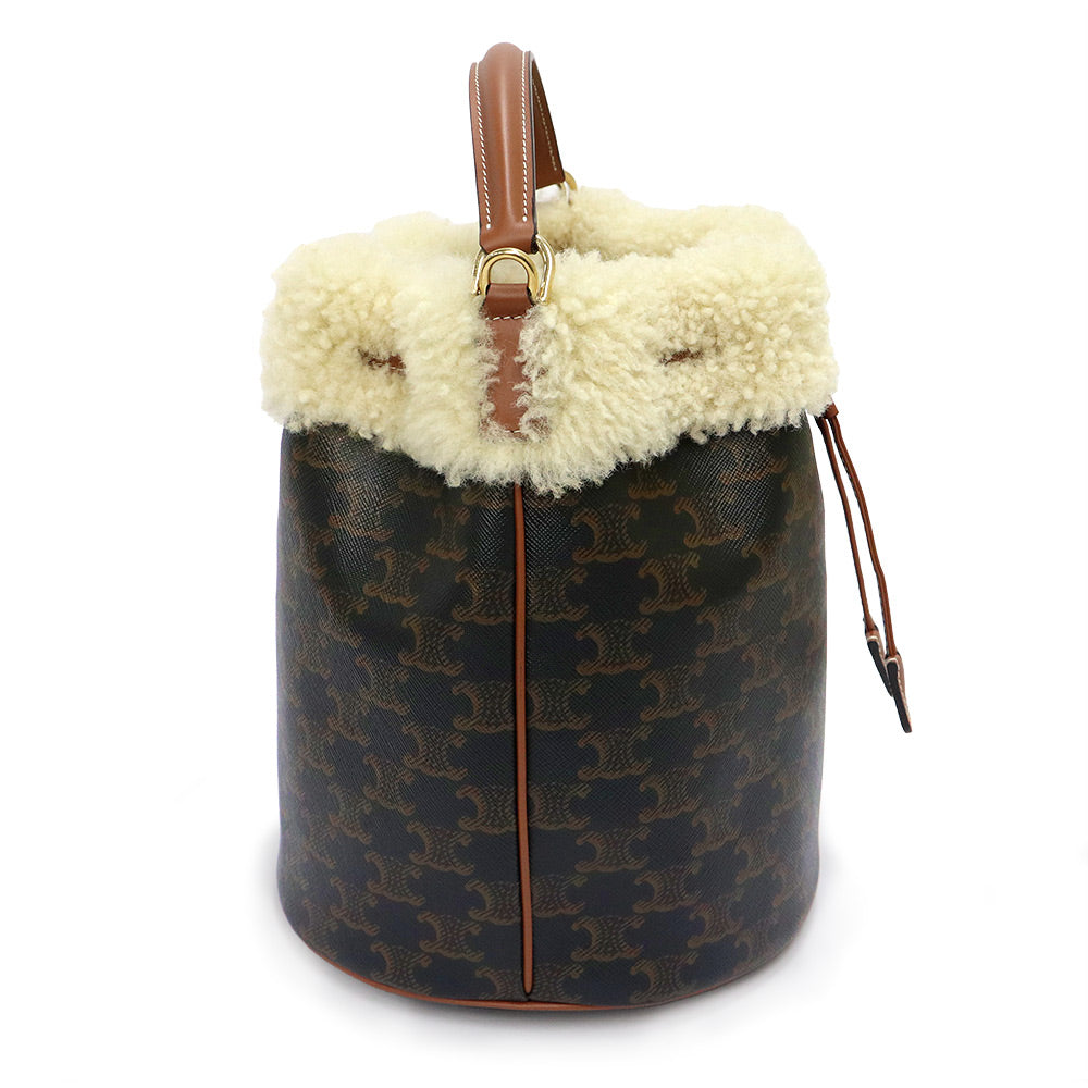[Unused Display Item] CELINE Clara Bucket Bag (116882GH3) in Triomphe Canvas, Calfskin, and Shearling Leather (Tan, Natural, and Brown). 2-Way Crossbody/Shoulder Bag with Gold Hardware.