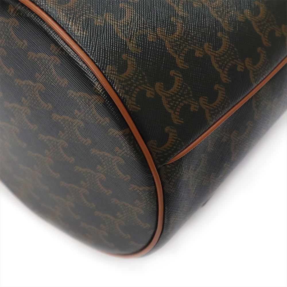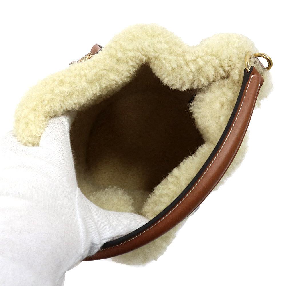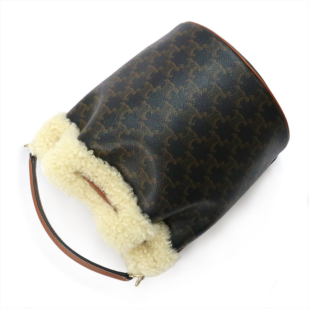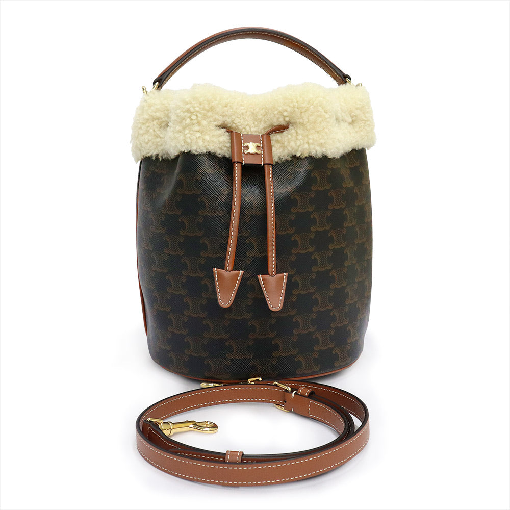 [Unused Display Item] CELINE Clara Bucket Bag (116882GH3) in Triomphe Canvas, Calfskin, and Shearling Leather (Tan, Natural, and Brown). 2-Way Crossbody/Shoulder Bag with Gold Hardware.