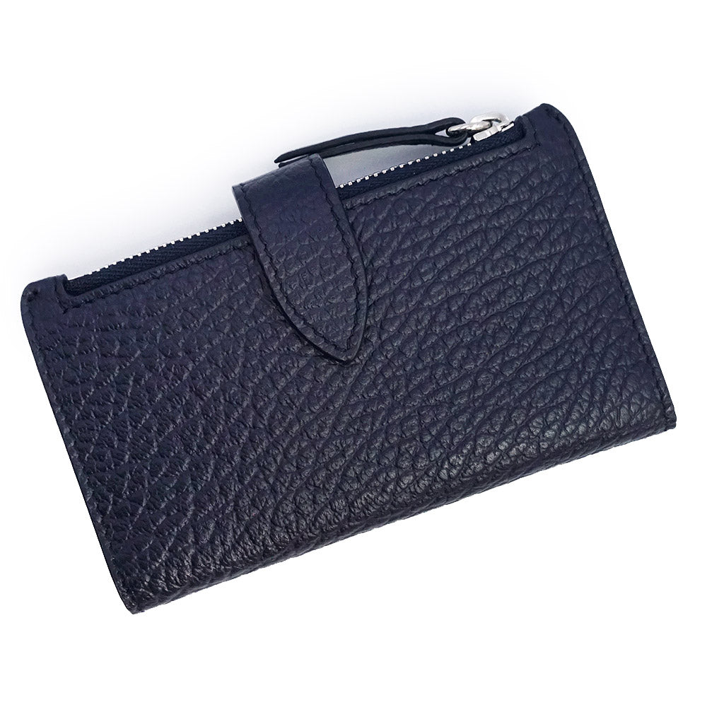エンボス加工を施したグレイニーレザーを使用したジップウォレット。クリップとファスナーで開閉し、内側にはカードスロットとナンバリング ロゴがあしらわれています。 ポケットや小さなバッグにもスッキリ収まるコンパクトなサイズで、毎日使う物こそこだわりのあるアイテムを使いたいという方にオススメです。 |