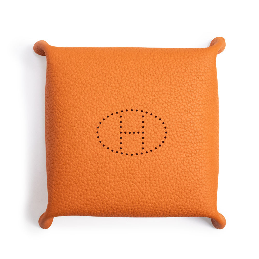 This jewelry tray from Hermès' "Vide Poche" series features a punched H logo in the center, which is also featured on the popular "Evelyne" bag. It can be used as a small accessory holder or display piece. |