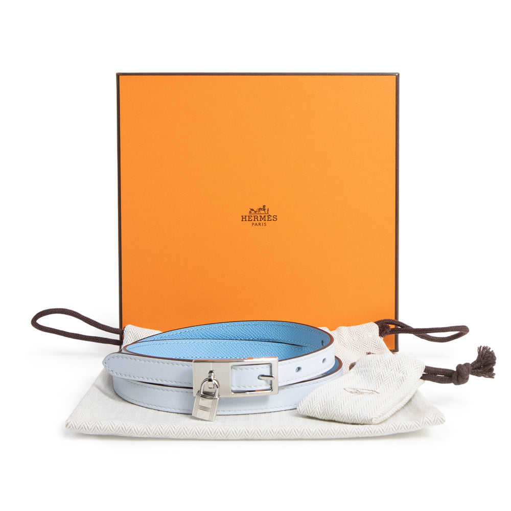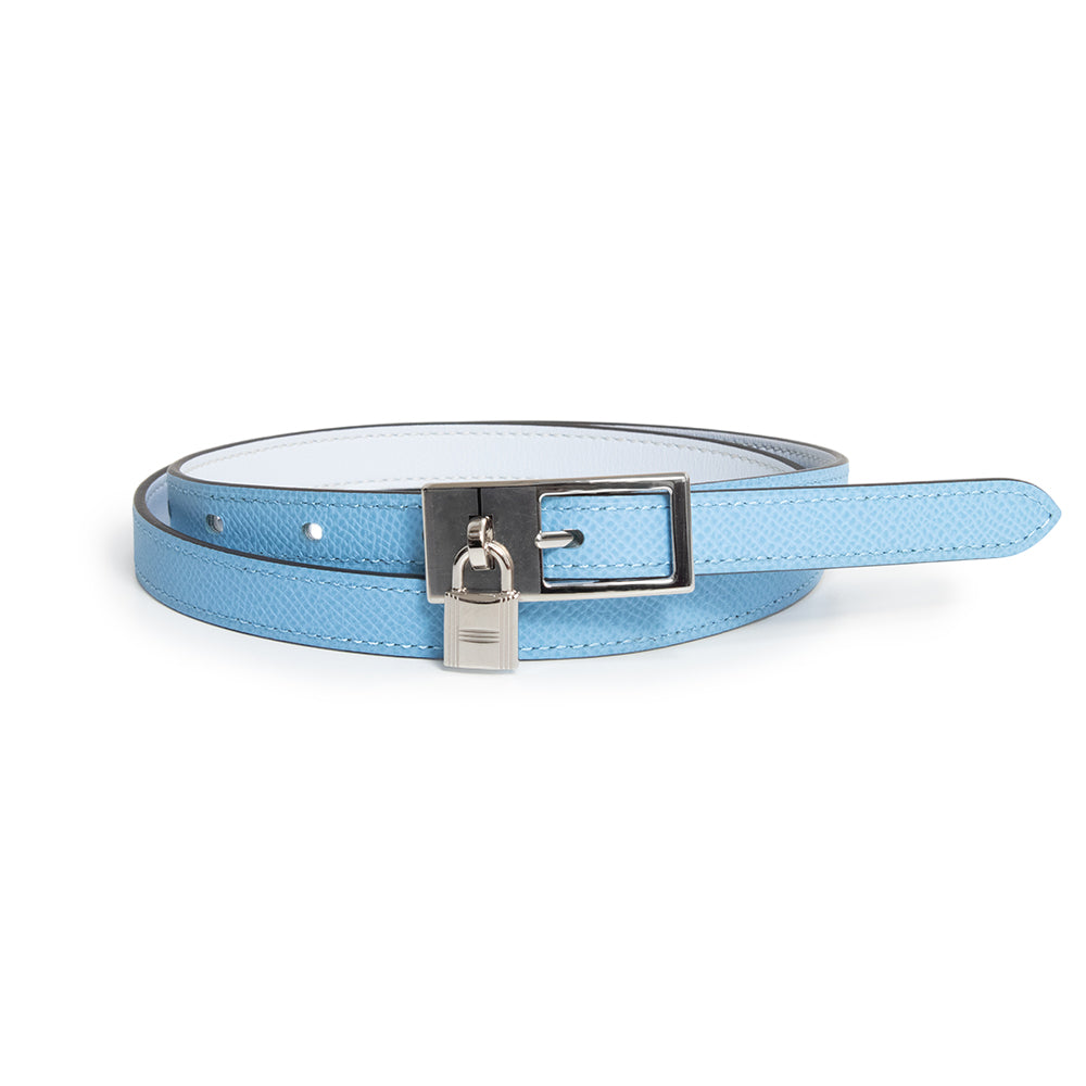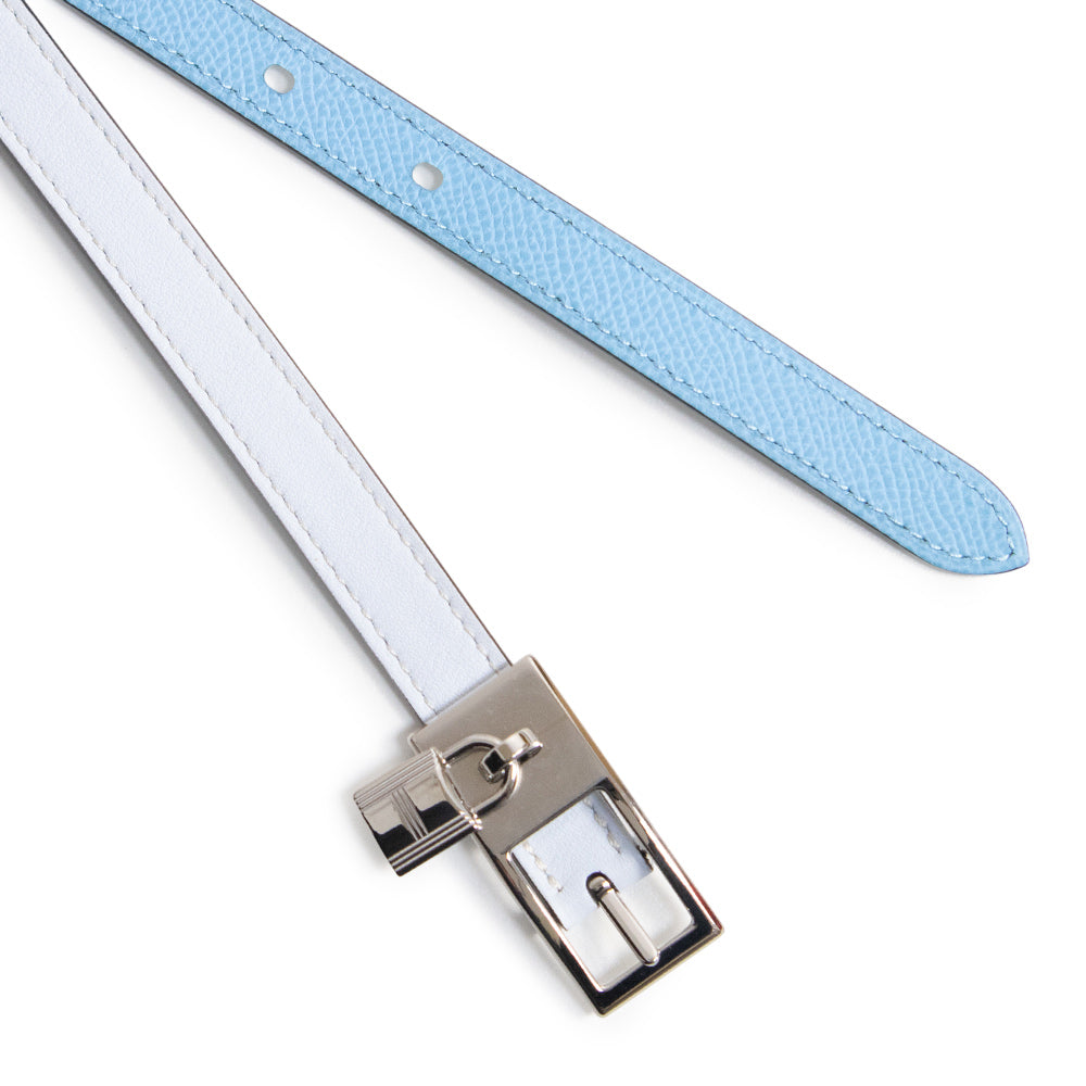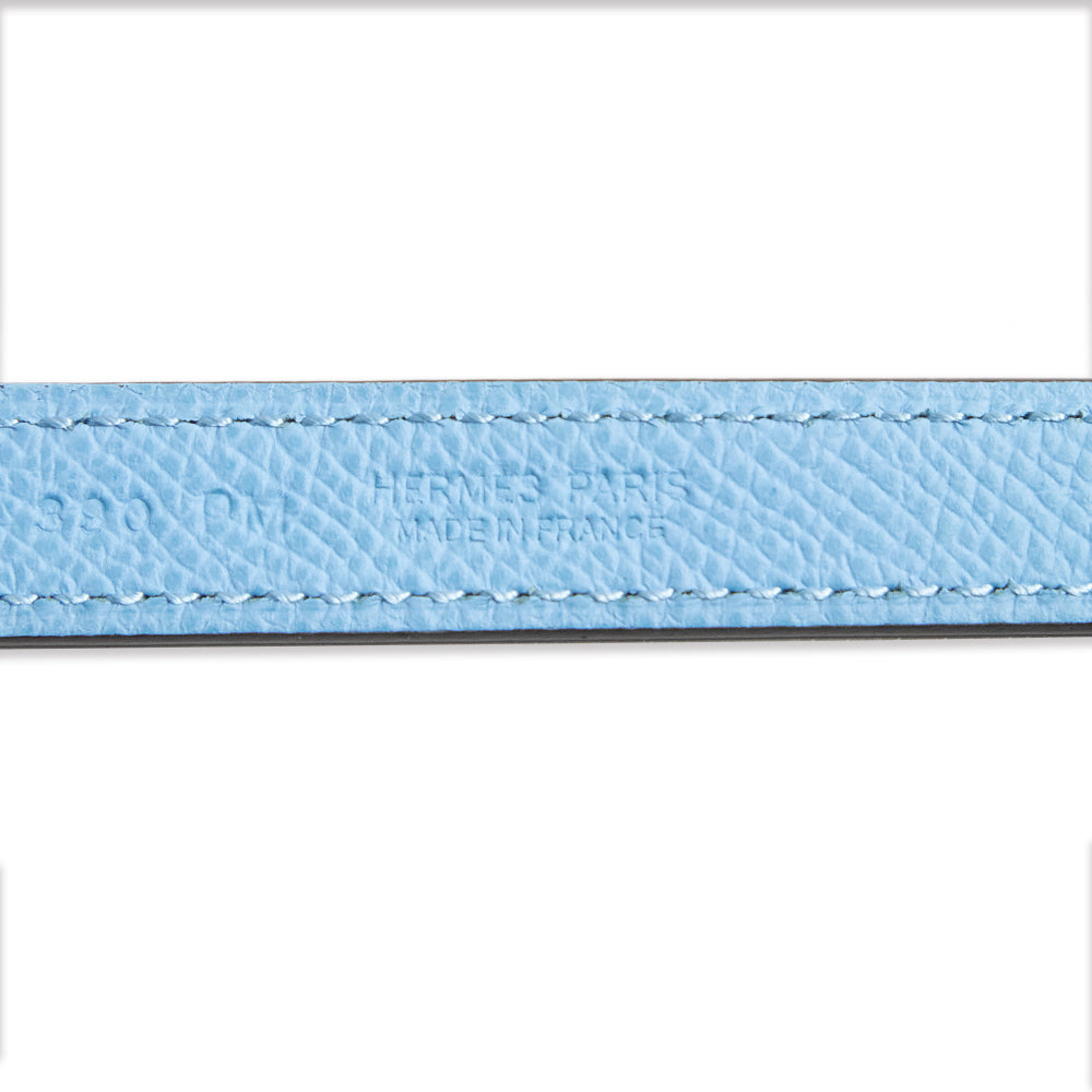 [New and unused] HERMES Lucky 15 Cadena Reversible Belt in Epsom Leather and Swift Leather, Celeste Blue Brume with U-stamp, 80cm Leather, Silver Hardware, with Box