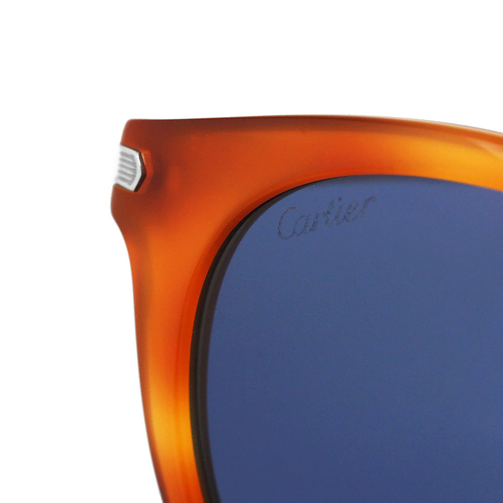 These Cartier sunglasses feature a rounded frame with a slightly retro look. The metal parts and brand logo on the sides make them a perfect piece to subtly show off your fashion sense from the side. |
